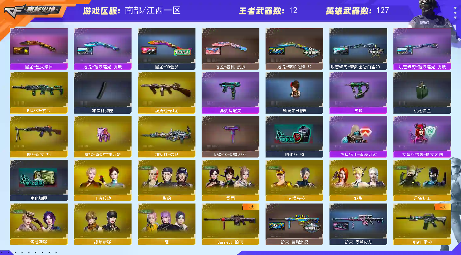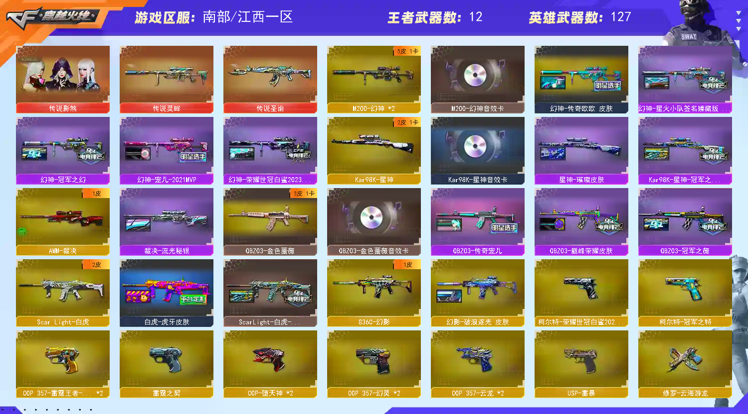 [重要武器皮肤]幻神-星火小队签名臻藏版皮肤、幻神-欧欧 皮肤、幻神-荣耀世冠白鲨2023皮肤、幻神-宠儿-2021MVP、幻神-冠军之幻、Kar98K-星神-冠军之星皮肤、星神-璀璨皮肤、毁灭-荣耀之怒、毁灭-墨兰皮肤、极光-高能霹雳皮肤、裁决-流光秘银、火麒麟-CFSTAR、火麒麟-大唐荣光、火麒麟-轻羽皮肤、火麒麟-冠军之心、AK-47-雷神、雷神-冠军之魄、M4A1-雷神-白鲨皮肤、雷神-荣耀之魄、黑骑士-冠军之势、黑骑士-AG-S4冠军典藏、黑龙-冠军之武、幻影-破浪逐光 皮肤、白虎-虎牙皮肤、ScarLight-白虎-冠军之虎皮肤、QBZ03-巅峰荣耀皮肤、QBZ03-冠军之薇、QBZ03-传奇宠儿、修罗-冠军之魂、屠龙-破浪逐光 皮肤、屠龙-春桃皮肤、屠龙-荣耀之锋、屠龙、屠龙-星火燎原、擎天-冠军之击、擎天-蒸汽钟表 皮肤、龙啸-冠军之啸、炽芒蝶刃-破浪逐光皮肤、炽芒蝶刃-荣耀世冠白鲨2023 皮肤[重要光效]屠龙-流星光效、屠龙蓝色光
