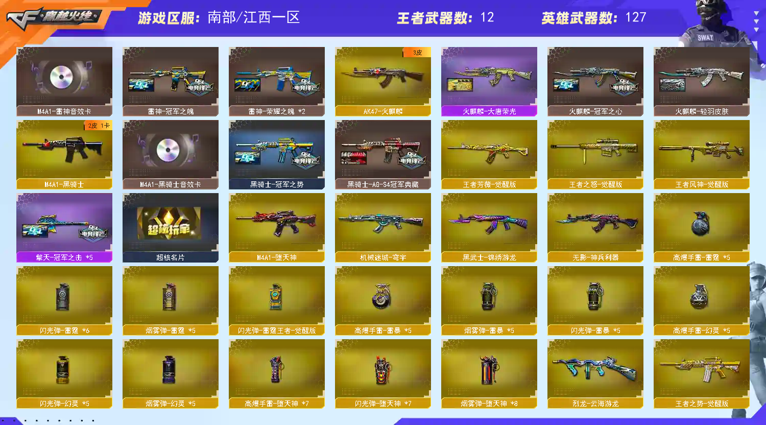 357-雷霆王者-觉醒版(2)、雷霆之契、柯尔特-冠军之特、USP-雷暴、麒麟刺-堕天神、龙啸-堕天神、擎天(4)、屠龙、雷霆之锋、幻灵之锋、斩神刀-雷暴、炽芒蝶刃(4)、高爆手雷-幻灵(5)、高爆手雷-雷暴(5)、高爆手雷-雷霆(5)、高爆手雷-堕天神(7)、烟雾弹-幻灵(5)、烟雾弹-雷暴(2)、烟雾弹-雷霆(6)、烟雾弹-堕天神(8)、闪光弹-幻灵(5)、闪光弹-雷暴(4)、闪光弹-雷霆(6)、闪光弹-堕天神(7)、闪光弹-雷霆王者-觉醒版、机械迷城-穹宇、G36C-幻影、黑武士-锦绣游龙、超新星-热带奇洋、王者芳薇-觉醒版、王者风神-觉醒版、烈龙-云海游龙、柯尔特-荣耀世冠白鲨2023、修罗-云海游龙、龙啸-烈火龙威、龙啸-热带奇洋、屠龙-云海游龙、擎天-云海游龙、手雷-热带奇洋、手雷-云游龙