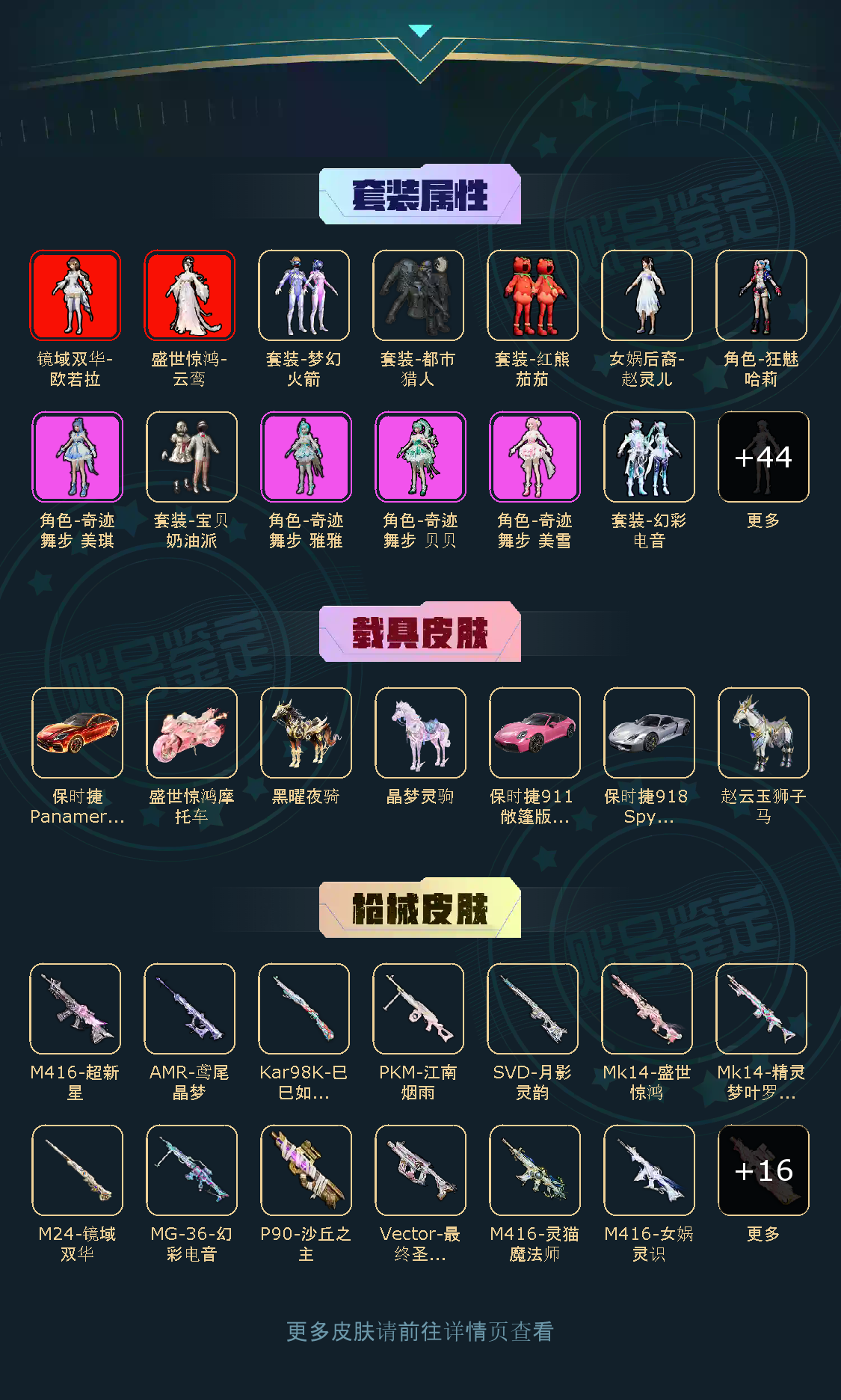 55粉,7载具,288套装,15王牌印记,无敌战神历史最高段,162042热力值 撬棍-永恒法杖/M416-灵猫魔法师/AKM-绿萝繁花/M416-电玩时刻/M416-心之恋语/M416-女娲灵识/SCAR-L-锦绣绵绵/AUG-许七安/AKM-星际浪客/M416-超新星/SPAS-12-蜜语绒猫/M417-第五大道/Mk14-盛世惊鸿/Mk14-精灵梦叶罗丽/M249-彩虹甜喵/MG-36-幻彩电音/PKM-江南烟雨/DP-28-千金淑猫/DP-28-豹影疾电/UMP45-量子极限/P90-粉樱探戈/AKS-74U-星穹咏叹调/Vector-最终圣卫者/P90-沙丘之主/破片手榴弹-粉粉猫爪/AMR-鸢尾晶梦/Kar98K-巳巳如意/M24-镜域双华/SVD-月影灵韵/保时捷Panamera(炽焰橙)/保时捷911 敞篷版(星珀红)/保时捷918 Spyder(液态银)/赵云玉狮子马/黑曜夜骑/晶梦灵驹/照夜玉狮子/盛世惊鸿摩托车/