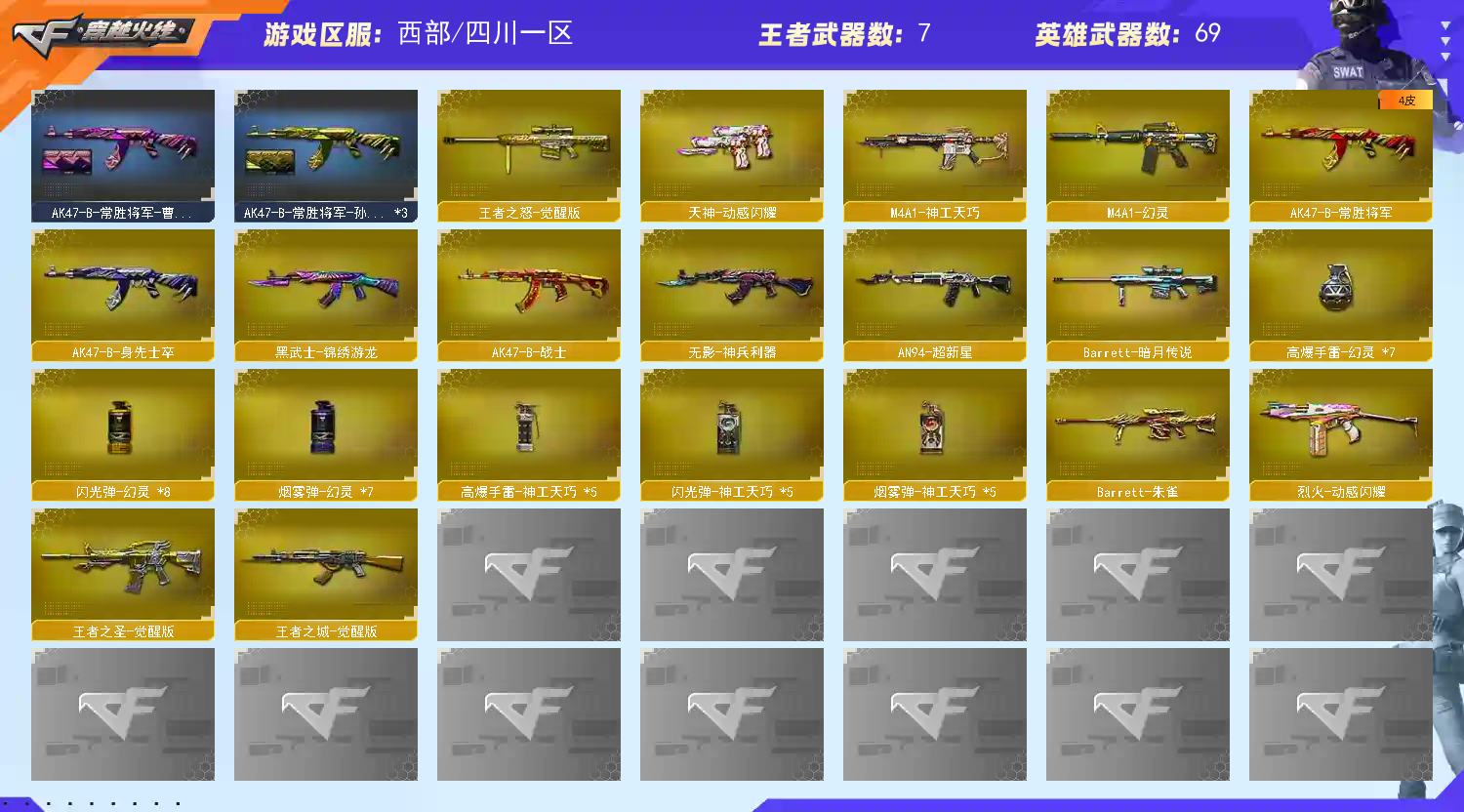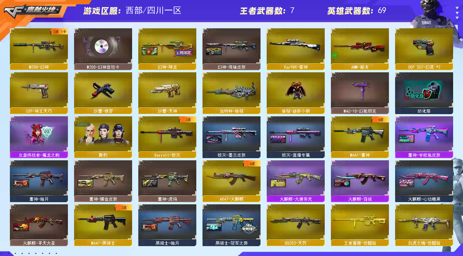西部四川一区【幻神降龙➕周瑜➕幻神音效卡➕星神】影豹白虎之魄神工天巧套白虎大汉风骨+音效卡大唐荣光冠军之势虎将本游戏账号:英雄武器67个; 王者武器8个。 装备不多,但是主武器、副武器、近身武器够用 拥有完美游戏体验。重要的是,特殊装备有:M200-幻神、加特林-炼狱、AK47-火麒麟、王者之圣、王者之城、王者之怒-觉醒版、王者蔷薇、堕天使、M200-幻神音效卡、王者之啸金色光效、等,随意畅选。