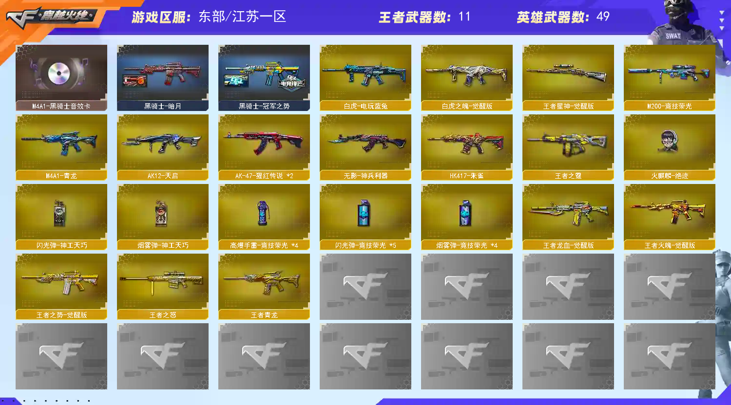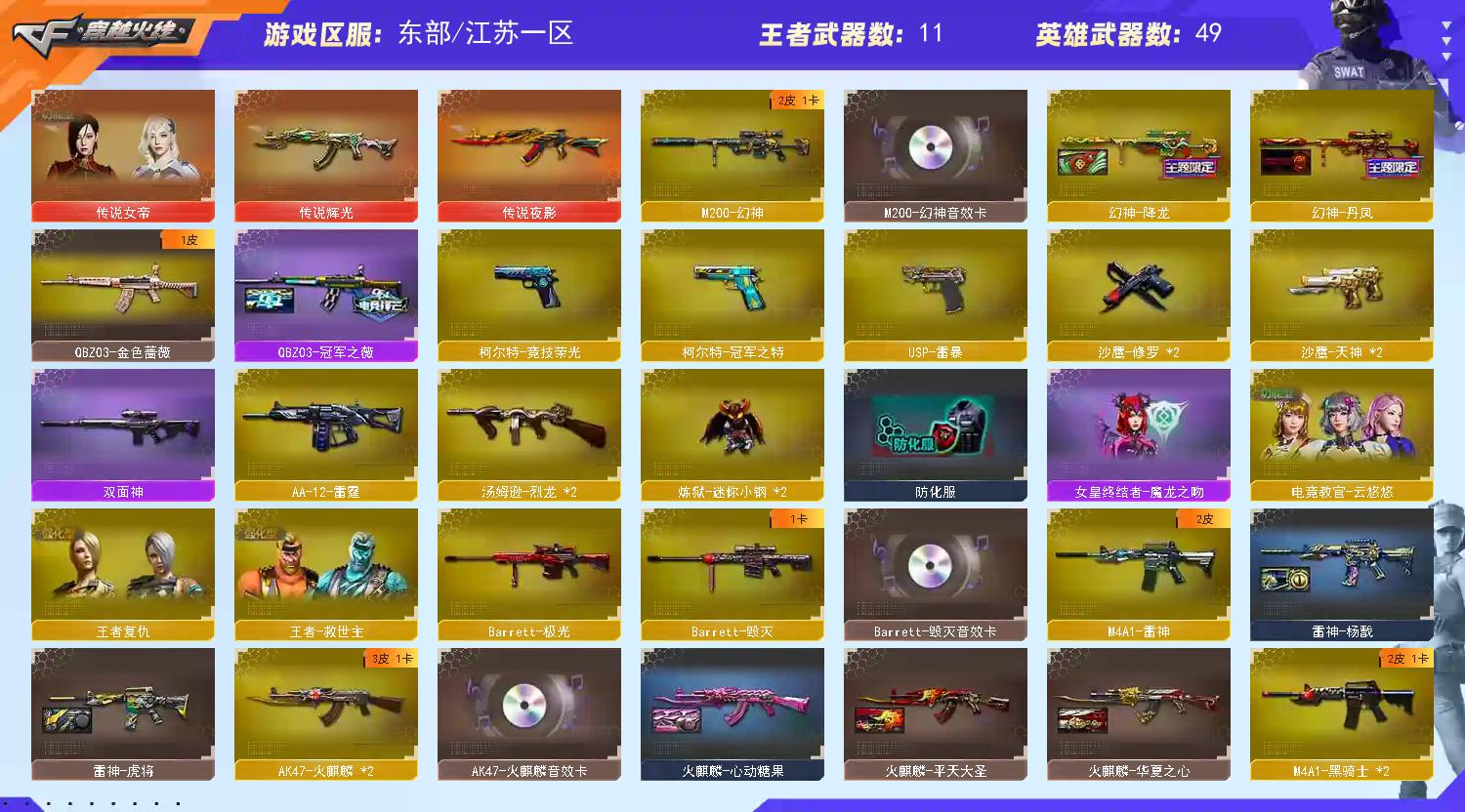 东部江苏一区 王者星神 幻神 M200竞技荣光 幻神+音效卡+丹凤+降龙 USP雷暴 柯尔特竞技荣光 柯尔特冠军之特 死亡之眼 青龙 朱雀 无影神兵利器 QBZ金色蔷薇 传说辉光 传说夜影 白虎之魄 毁灭枪娘 黑骑士冠军之势 各种光效各种玩偶