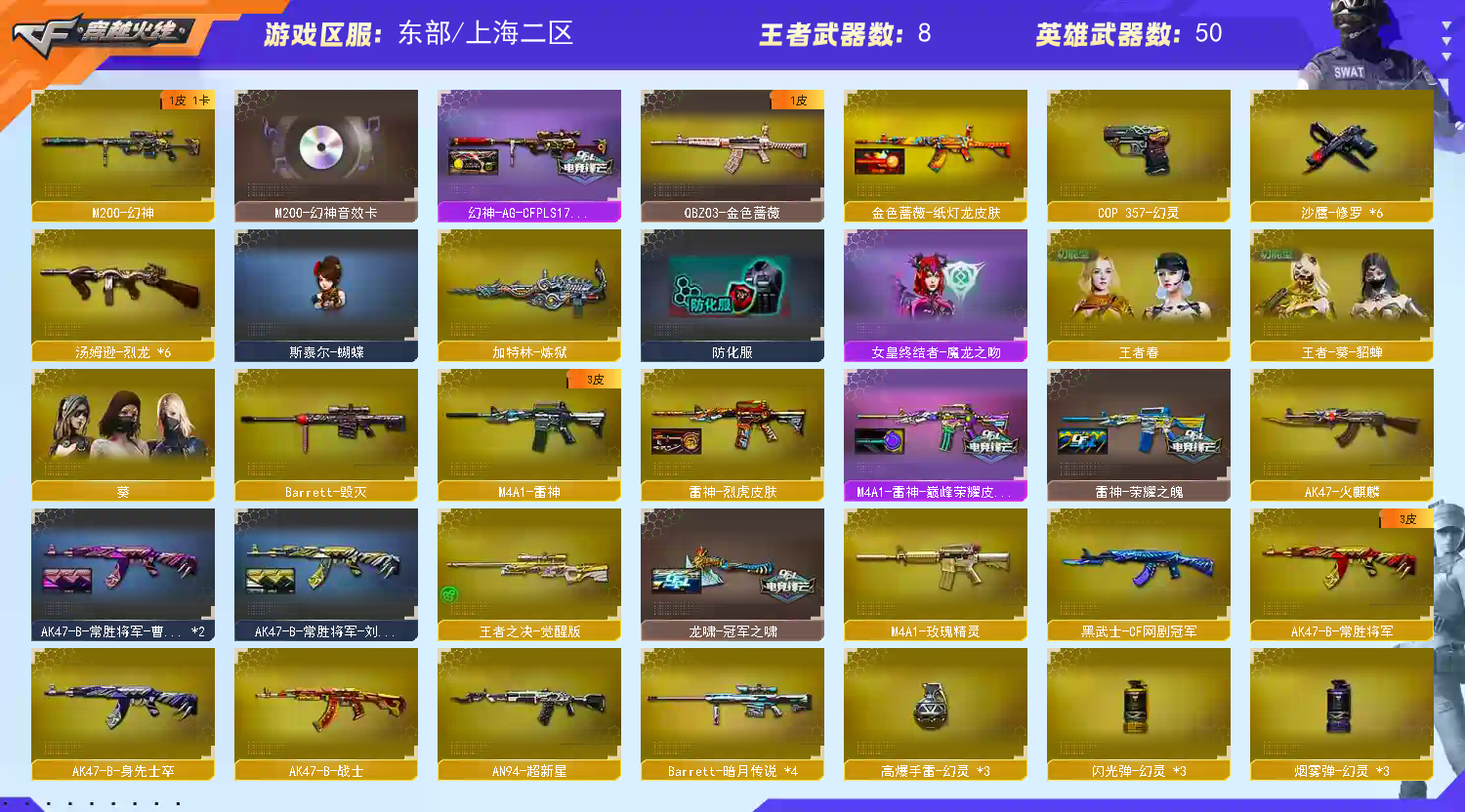 幻神三件套 6烈龙+蝴蝶 6修罗 幻神+AG冠军+音效卡 QBZ纸灯龙 COP幻灵 王者貂蝉/春 王者之决/刺/啸觉醒版 王者火魄觉醒版 烈龙云海游龙 王者青龙/雷怒 M37葵 COP白鲨 雷神+巅峰荣耀+荣耀之魄