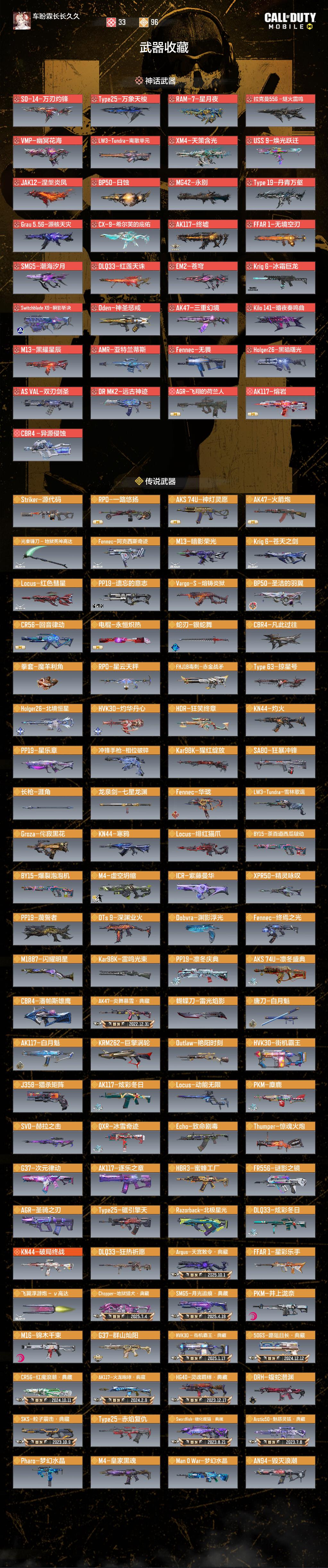 满级拉克曼556-燧火雷鸣、SO-14-万刃灼锋 Type25-万象天梭 RAM-7-星月夜 VMP幽冥花海 LW3-Tundra-离散单元 XM4天策含光 USS 9-焕光迁跃 JAK12-涅槃炎凤 BP50-日蚀 MG42-永别了战争Type 19-丹青万壑 CX-9-希尔芙的庇佑 Grau 5.56-源核天灾 AK117-终墟 AK117-熔岩 FFAR 1-无境空刃 SMG5-潮海汐月 DLQ33-红莲天诛