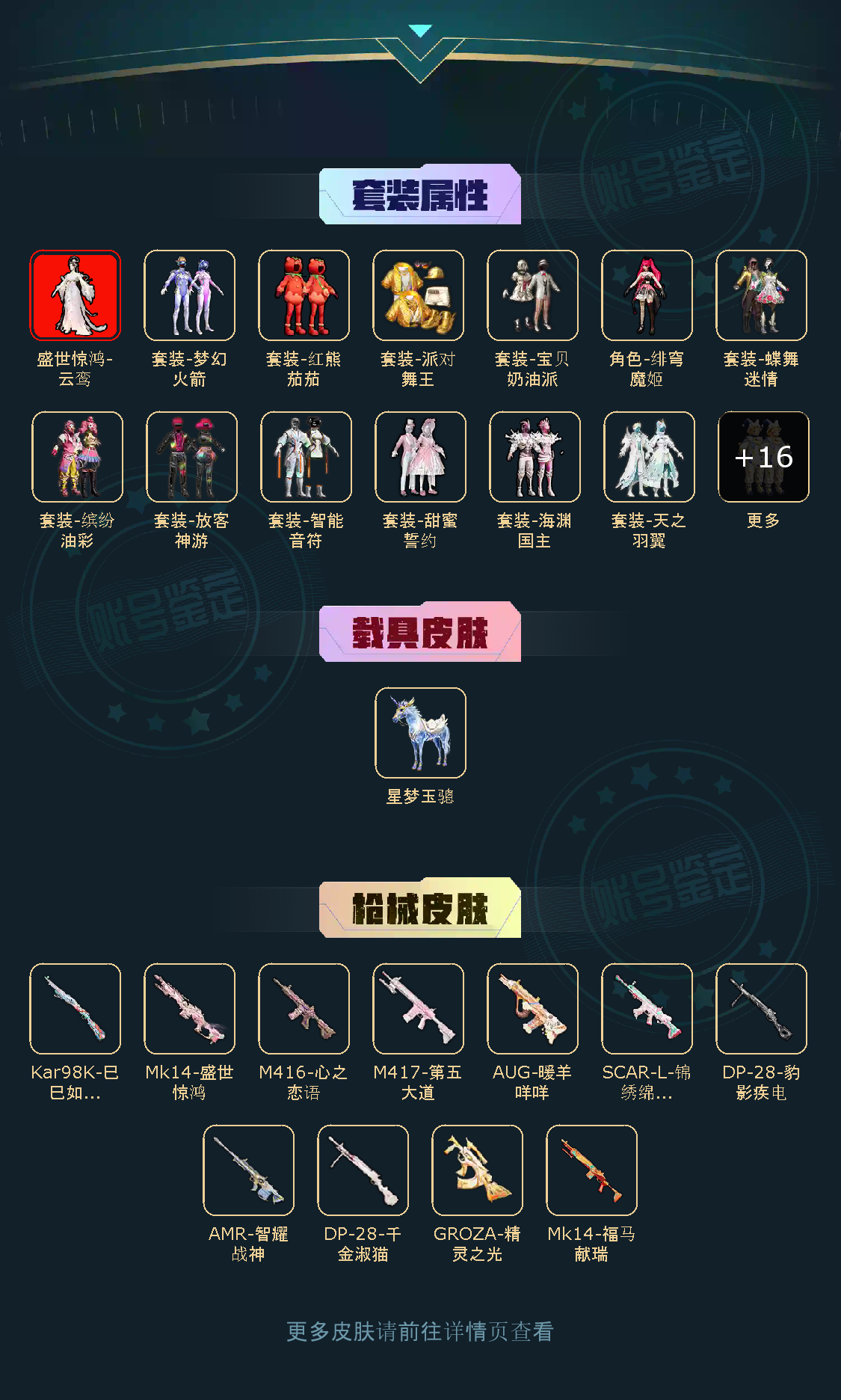 【稀有资产】盛世惊鸿-云鸾[3级]/角色-8号机/角色-Mark.06/角色-零款战斗服/套装-派对舞王/套装-胖达圆圆/套装-暗影哥特/套装-龟仙人/套装-糯粉咩咩/套装-晶辉守护/角色-粉雾星云/套装-红熊茄茄/玩偶服-懒羊羊/玩偶服-美羊羊/角色-都市丽猫/角色-摩登魅猫/角色-临安公主/套装-纯白跃动/套装-龙宫之主/套装-绒绒粉兔/角色-银尘/角色-冰公主