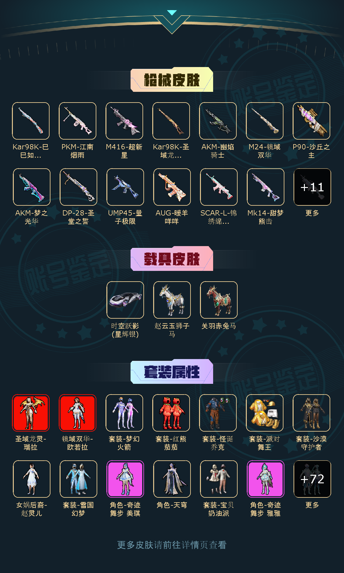 82粉,3载具,324套装,10王牌印记,卓越王牌14星历史最高段,146320热力值 平底锅-林间仙鹿/撬棍-永恒法杖/AKM-绿萝繁花/GROZA-旋转彩虹/AKM-幽焰骑士/AUG-暖羊咩咩/M416-墨龙九天/SCAR-L-锦绣绵绵/M416-超新星/AKM-梦之光华/Mk14-甜梦熊击/M249-彩虹甜喵/DP-28-圣堂之誓/PKM-江南烟雨/DP-28-豹影疾电/UMP45-量子极限/AKS-74U-星穹咏叹调/P90-沙丘之主/破片手榴弹-美味星星糖/破片手榴弹-热量炸弹/Kar98K-圣域龙灵/Kar98K-巳巳如意/M24-镜域双华/M24-莲影清波/时空跃影(星辉银)/关羽赤兔马/赵云玉狮子马/照夜玉狮子/