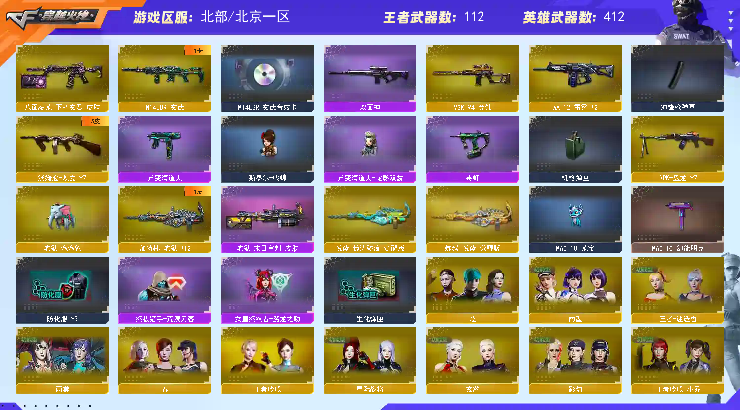 生化满配:生化角色皮肤6个+生化道具齐全+6盘龙+炼狱+炼狱惊涛骇浪+炼狱泡泡象(已赋予)+mac-龙宝+6烈龙斯太尔蝴蝶+毒蜂+异变清道夫+异变清道夫小人枪蛇影双骄+传说辉光+玄武+炽芒蝶刃蝴蝶刀+满级八面凌龙+隼+毒蝰术士
