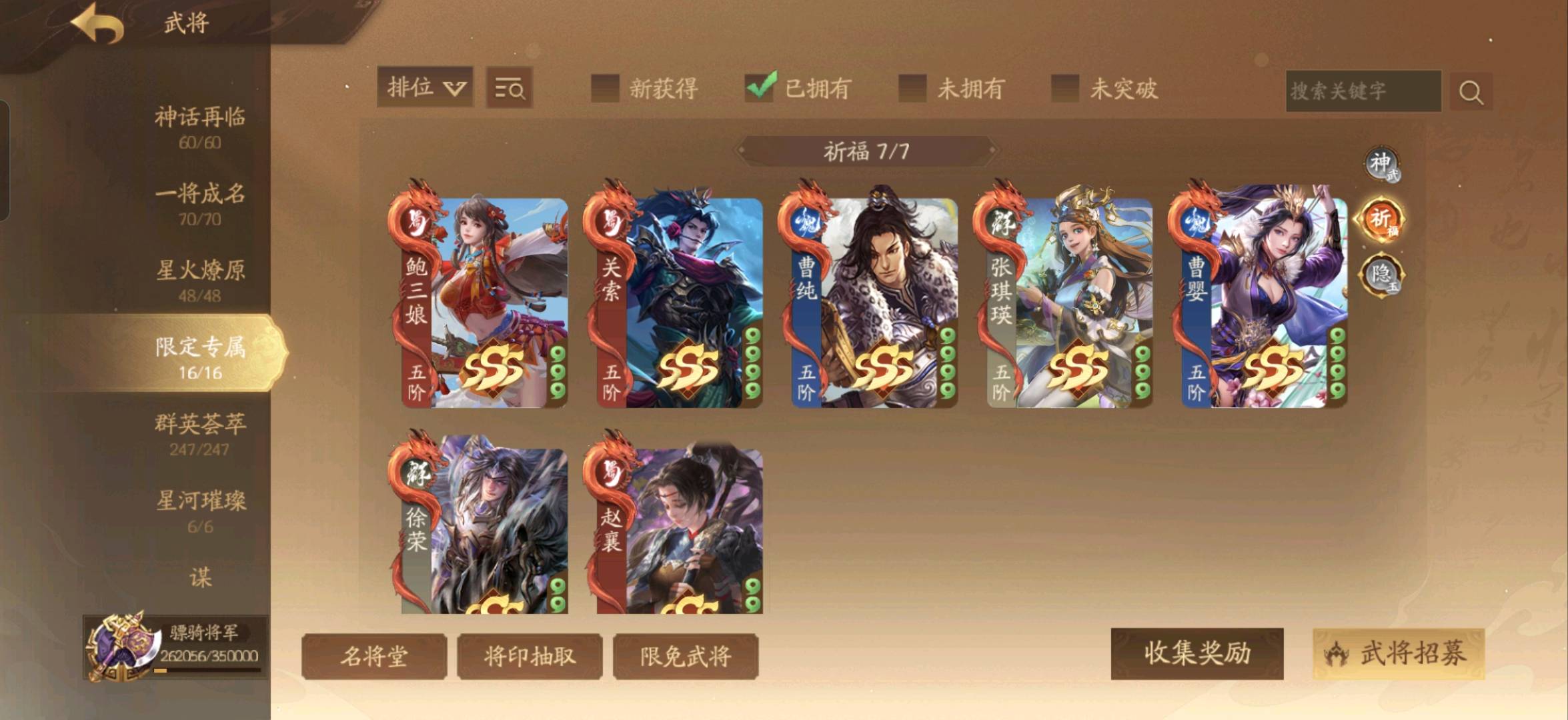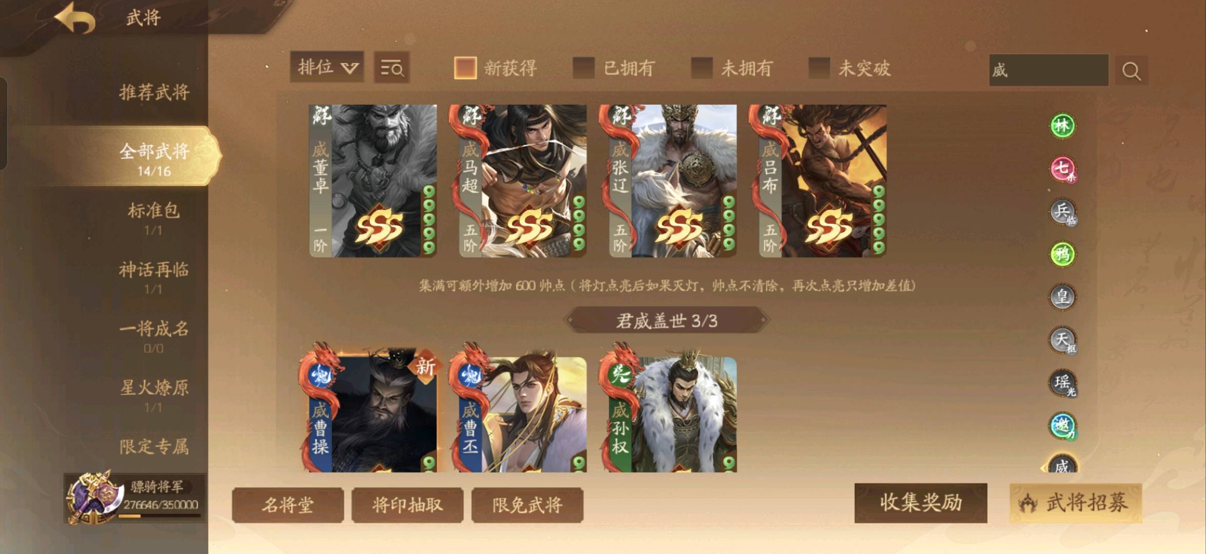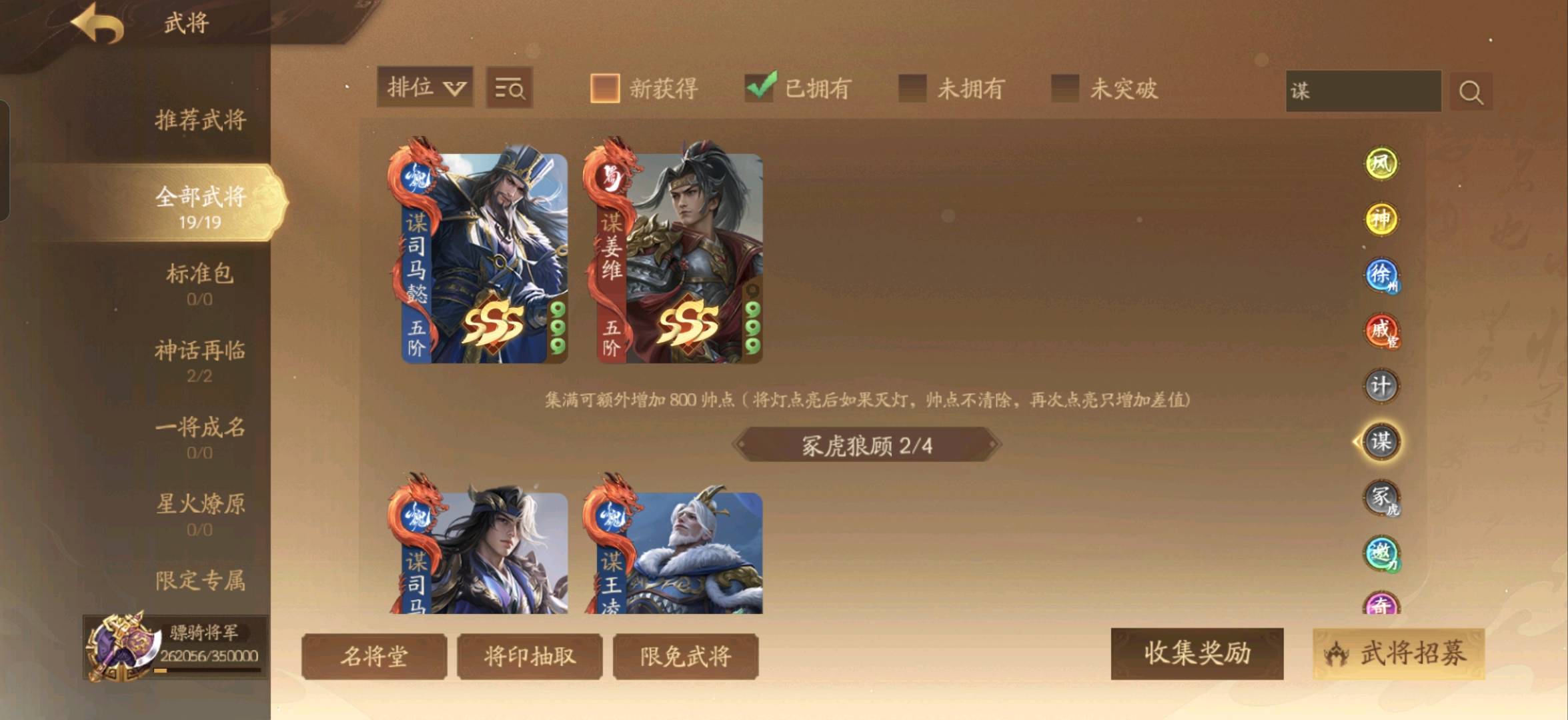 纳贤强将:周宣,司马师,钟毓 ,袁胤,薛灵**,吴范,谋胡烈,朱建平,黄舞蝶,SP甄姬,司马徽,庞宏,徐妏,星曹仁,乐𬘭,张璇,曹宪,诸葛均等;