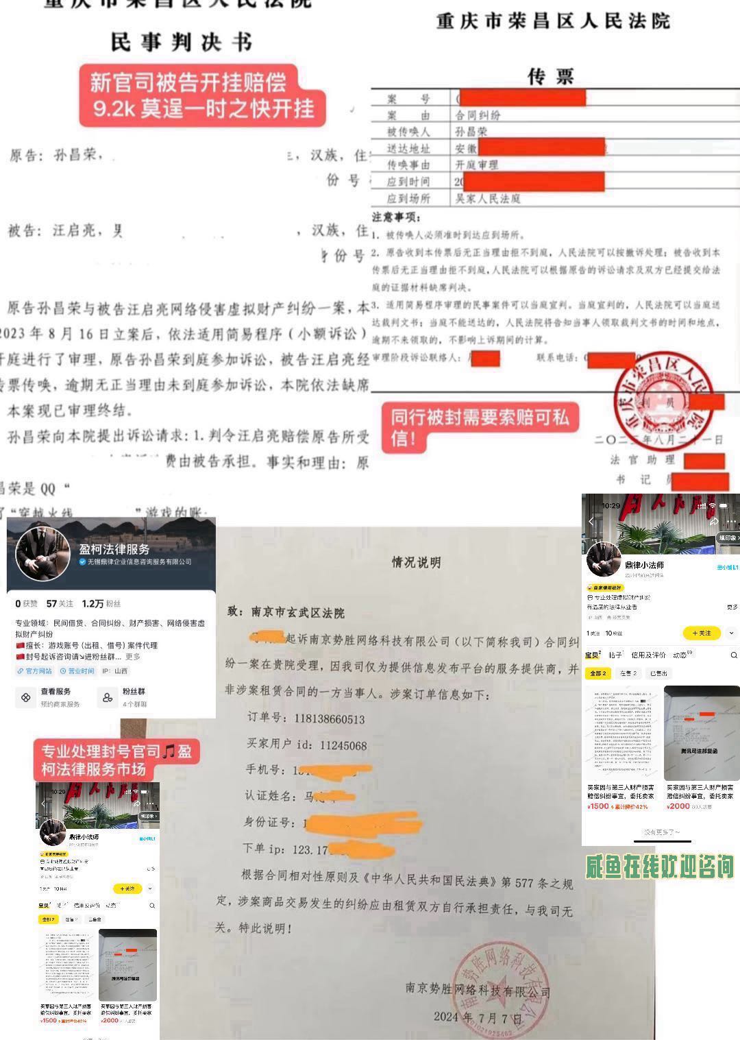 《 低价代理租号被封开挂官司 ,费用总法院判决35%!押金1K,需要抖音私信可联系。》 此号已在重庆渝中区分局进行虚拟财产注册备案,已具有法律效应。你的威信,zfb 都是实名的。如遇封号,我们会将恶意租客的《手机号》《充值流水》《登录游戏IP》地址提交给法院进行立案,法院传票,历史充值总数额进行赔偿。