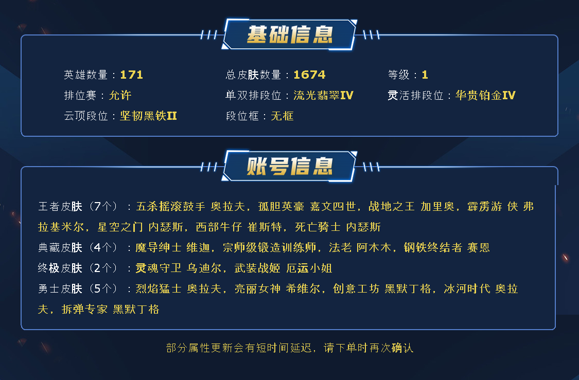 ~~喜欢记得收藏~~可排位~~1653皮全英雄~~租之前尽量查一下游戏ID,确保段位是您需要的,避免浪费您的时间~~请勿挂机逃跑故意送人头,谢谢合作,谢谢~~