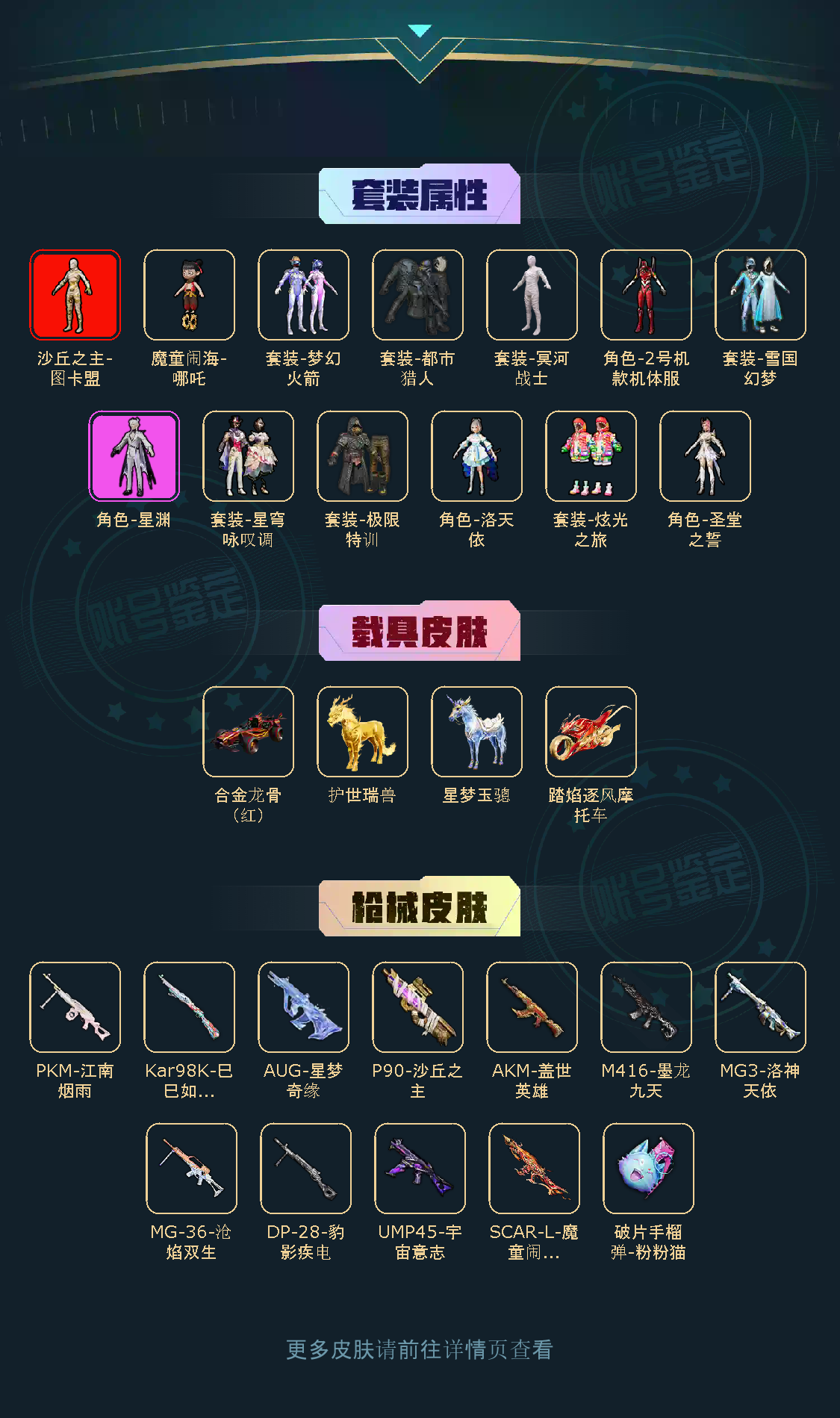 11粉,4载具,119套装,满级木乃伊,15王牌印记,绝世王牌21星历史最高段,98508热力值 Vector-绯穹魔姬/AKM-盖世英雄/AUG-星梦奇缘/M416-墨龙九天/SCAR-L-魔童闹海 哪吒/MG3-洛神天依/PKM-江南烟雨/MG-36-沧焰双生/DP-28-豹影疾电/UMP45-宇宙意志/P90-沙丘之主/破片手榴弹-粉粉猫爪/Kar98K-巳巳如意/合金龙骨(红)/护世瑞兽/星梦玉骢/踏焰逐风摩托车/
