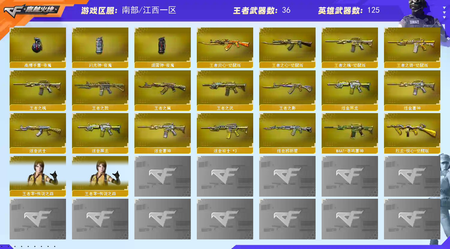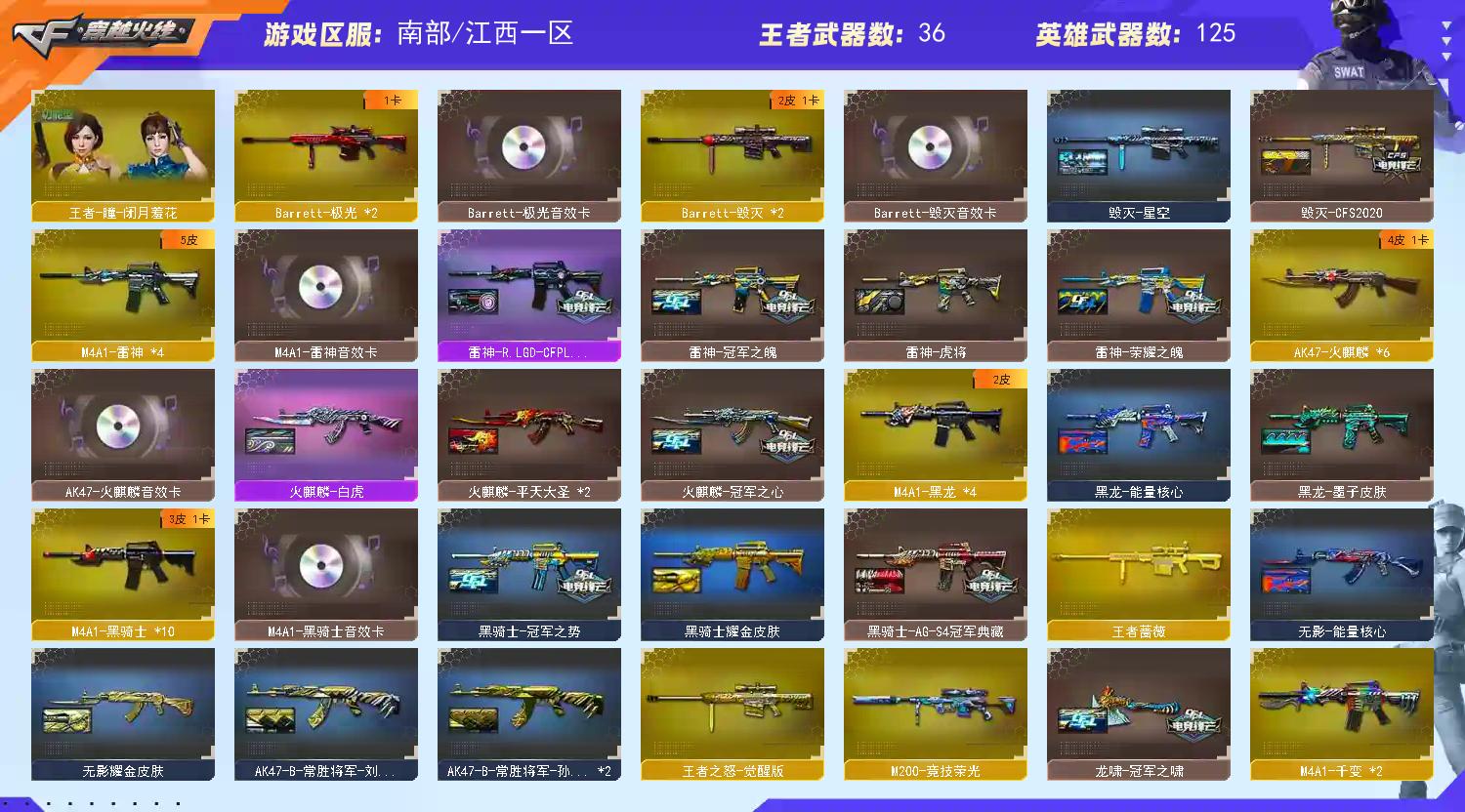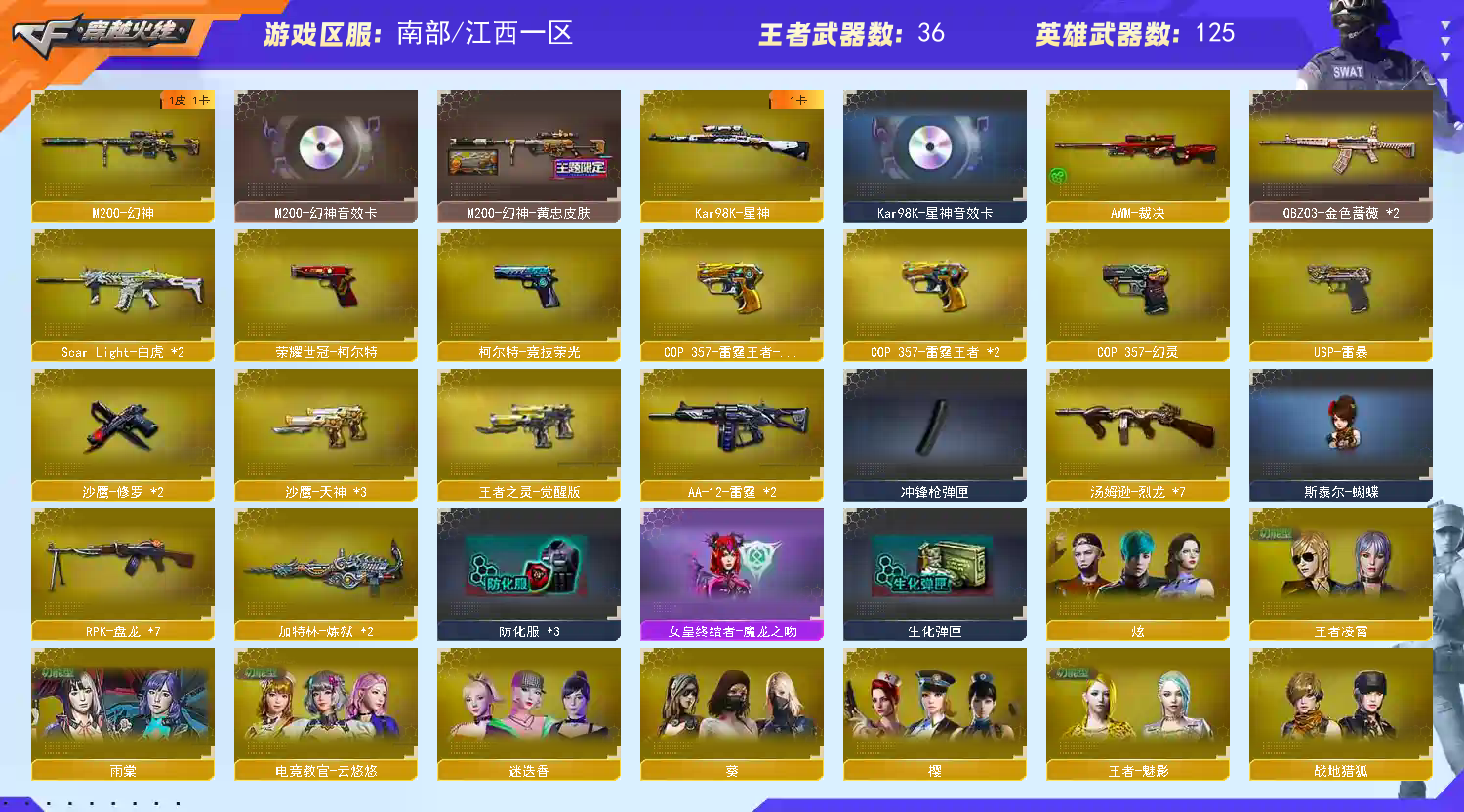 【亮点解析 幻神三件套 星神带卡 生化高配 】【m200幻神+音效卡+黄忠】【98k星神+音效卡】【m200竞技荣光套+usp雷暴+云悠悠】【6盘龙 炼狱 6烈龙 6黑骑士 斯太尔蝴蝶 】【scar白虎】【qbz金色蔷薇】【hk417朱雀】【火麒麟+卡+冠军之心+cfs2018】【黑龙】【雷神+卡+冠军之魄+荣耀之怒+s18冠军】【黑骑士+卡+冠军之势】【毁灭+卡】【极光+卡】【裁决】 【武器:王者之心 王者之魄 王者之势 王者炎心 海王 荣耀世冠雷神 雷霆王者 】 【12手呛:修罗*2 天神*3 雷暴 幻灵 竞技荣光 王者之灵 荣耀世冠柯尔特 雷霆王者 】 【12刀具:屠龙*2 龙啸 擎天 麒麟刺*3 斩神刀雷暴 王者之啸 王者之击 夜魔 王者玉锋 】 【7雷套:雷暴雷*3 夜魔雷 雷霆王者雷*3】 【小人呛:朱雀蛇隐宗 火麒麟灵狐 裁决雪莉杨 天龙曼陀罗 】 【音效卡:星神音效卡 极光音效卡 幻神音效卡 毁灭音效卡 雷神音效卡 火麒麟音效卡 黑骑士音效卡 】 【四防角色:雨棠 王者魅影 】