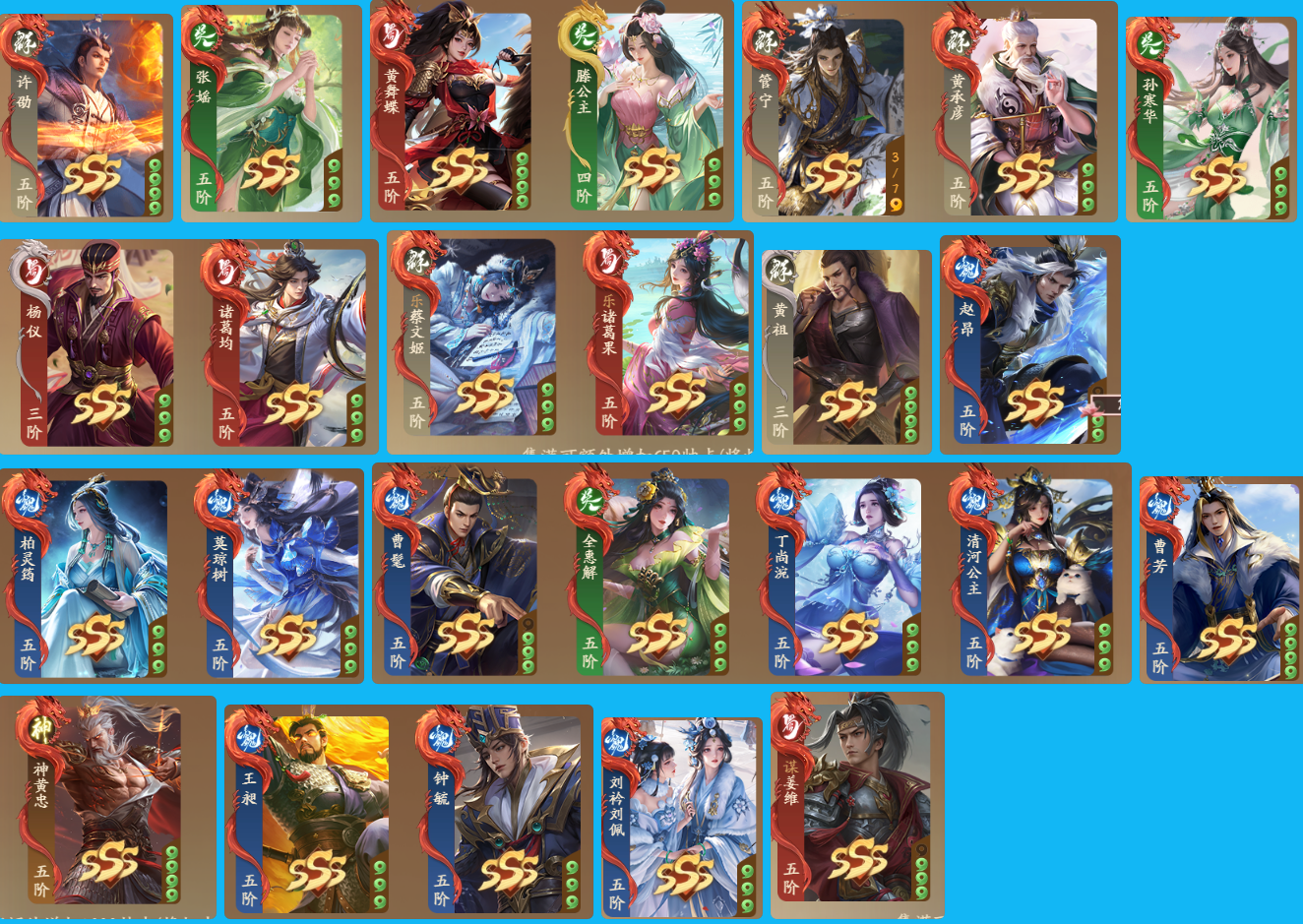 谋吕蒙(传)马邈,威曹操,神典韦,刘晔(至臻动)桓阶,崔烈,谋陆逊,谋骆统,谋黄权,威马超,张燕,威张辽(传)威吕布(传)威曹丕,威董卓,谋姜维,神黄忠(传)神姜维,留赞史诗,潘淑,张琪瑛(传动)周宣(锦绣动)柏灵筠(锦绣)乐菜(锦绣动,史诗)莫琼树(锦绣动,史诗)管宁(锦绣动)曹宪(元春动,史诗)孙寒华(锦绣动)谋司马师(传史)谋邓艾(传)许劭(水龙静战场动)钟毓,庞宏(传)二刘史诗,曹芳史诗,袁神,黄舞蝶(传,史诗),诸葛均(传)乐诸葛果史诗,乐蔡邕(传)赵昂(传)全惠解(传,史诗),丁妈(传)sp祝融,清河公主(传动)庞会(传)腾公主(战场)三次袁,陈式(唱跳传说,锦绣)吴质,文鸯,谋刘协,谋诸葛瑾史诗,谋胡烈,周不疑史诗,甘糜夫人(传),星袁术,星法正,星丁奉,张焕,王昶(战场)公孙修,文钦史诗,吕剧,刘巴,向宠,张瑶(伊人传说,战场动)黄承彦史诗,鲍三娘,韩龙,夏侯令女,刘永(双传动)陈珪史诗,万年公主(限)孙綝史诗,吴班史诗,胡遵史诗,苏飞史诗,马钧史诗,刘焉(战场动)梁兴(锦绣)蒲元(传)秦宜禄(传)卞喜(传动)sp关羽(传)曹性(传动)伍孚,孙礼(传)sp孙策马超,阎柔(传)吴兰,雷桐,冯方史诗,穆顺,郝昭(锦绣)赵嫣,曹嵩(传)侯成,张翼(传)谯周(传)吴范(传)李婉(传)花鬘(传)神甘宁(战场)裴秀,司马孚(传)夏侯楙,丁原(限定)王荣史诗,杨修,徐琨,武安国,张虎,兀突骨,杨仪史诗,土鳖,黄祖,王双,刘琦,祢衡,神关羽,赵襄SSA