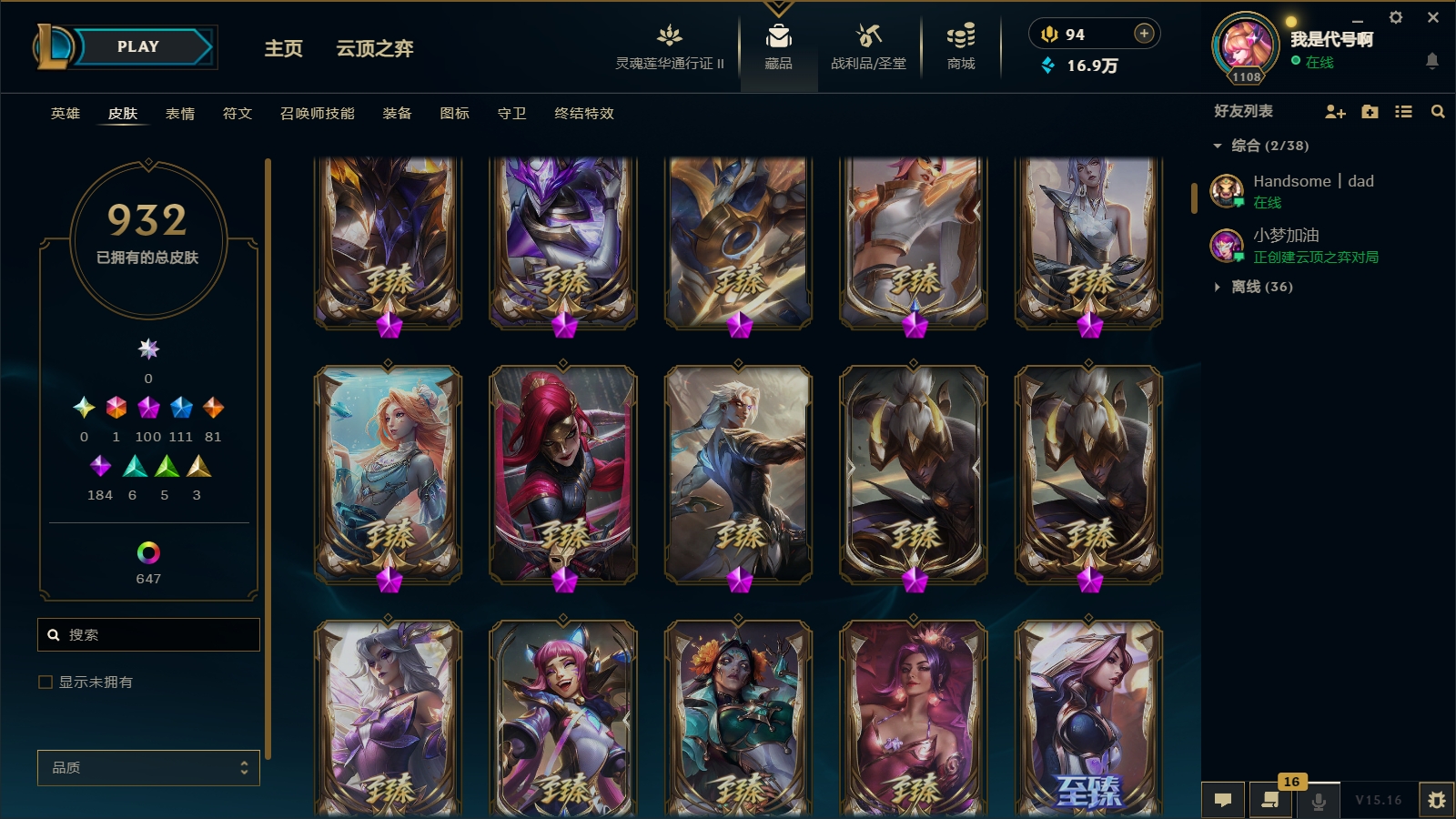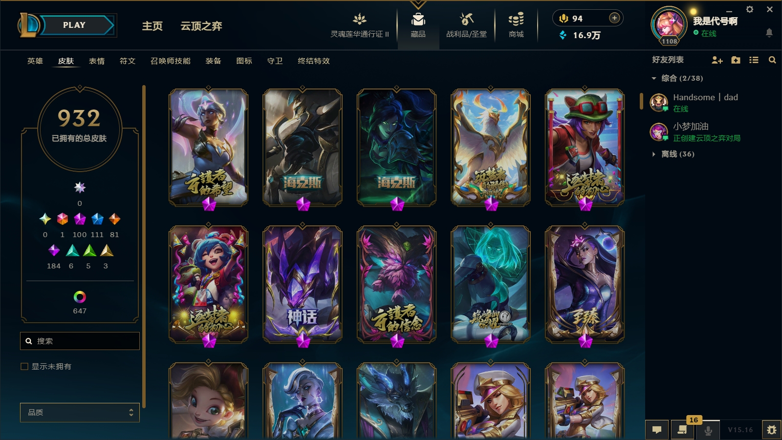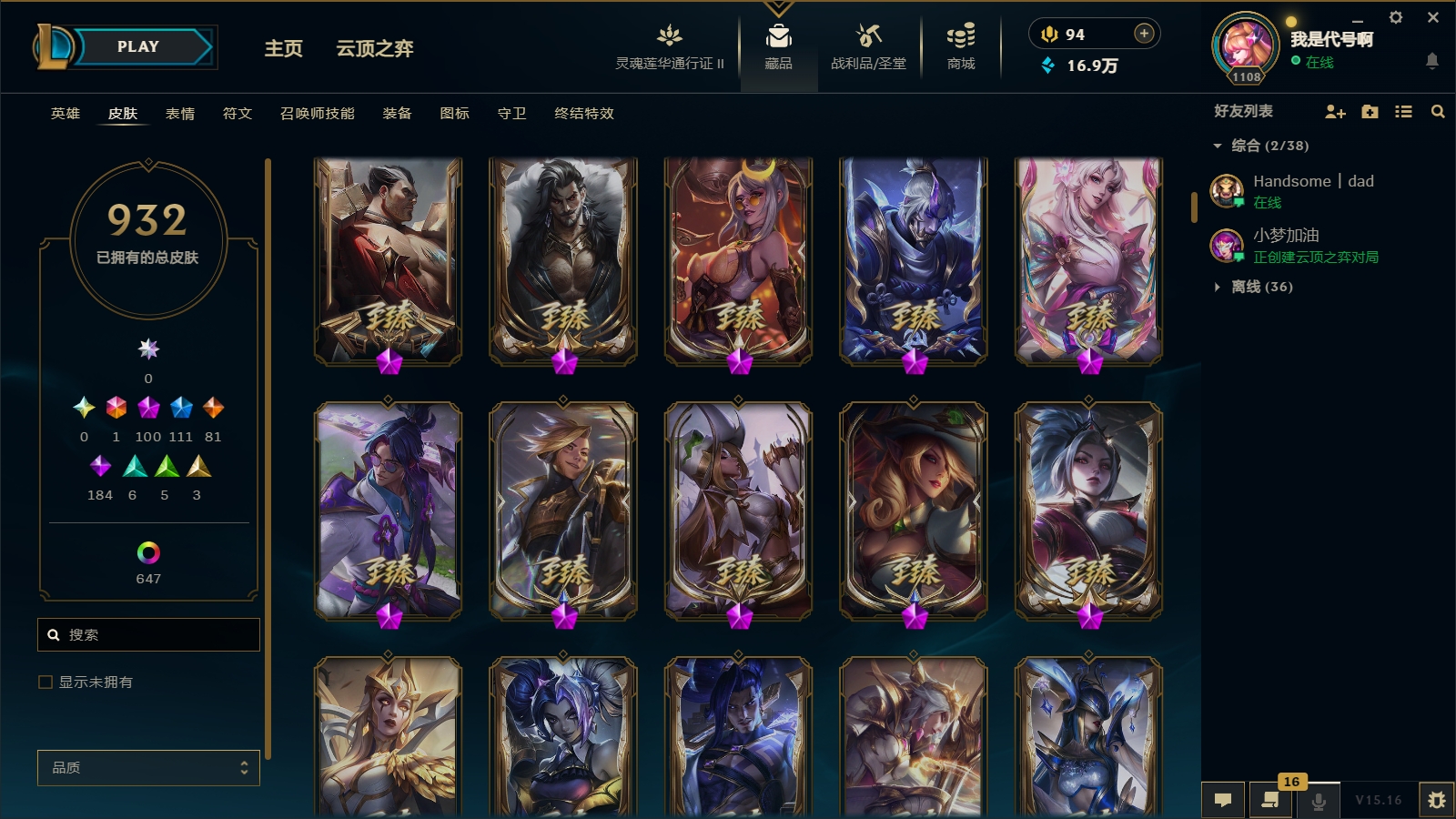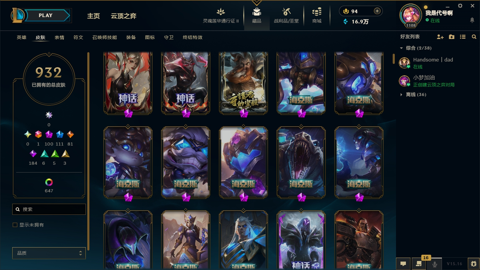 1800皮肤〓104至臻海克斯〓摄魂恐惧〓殿堂薇恩乐芙兰〓玉剑男刀〓黑夜黎明神王套〓沄顶神话拉克丝