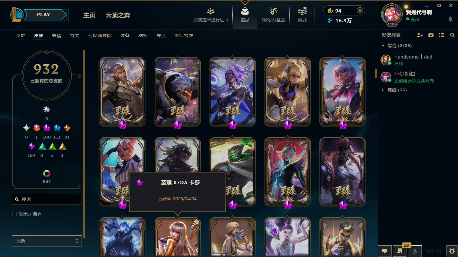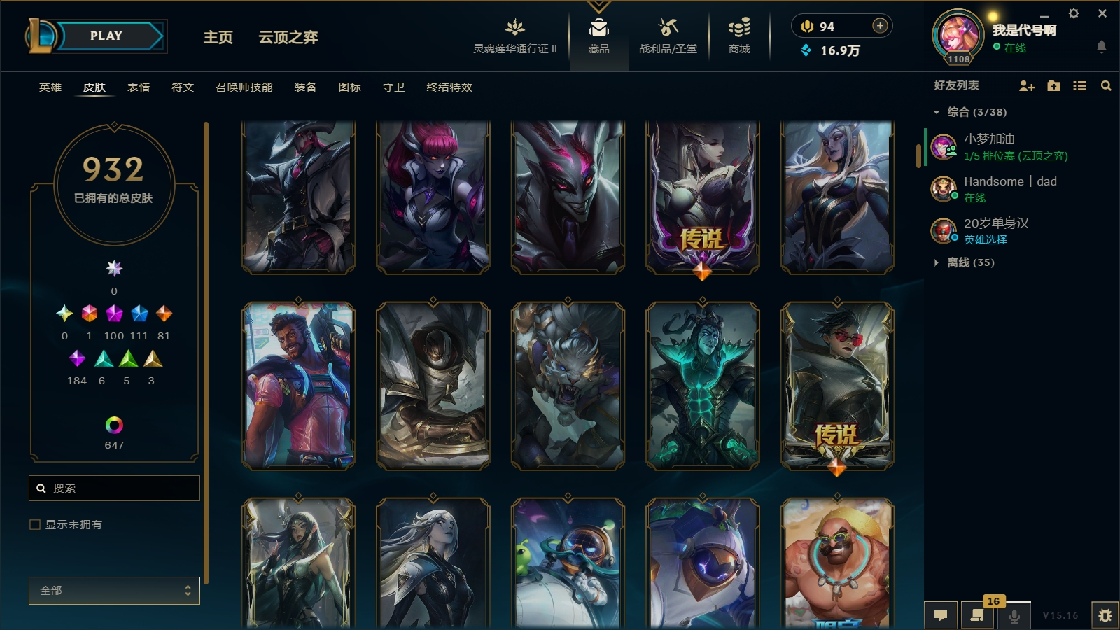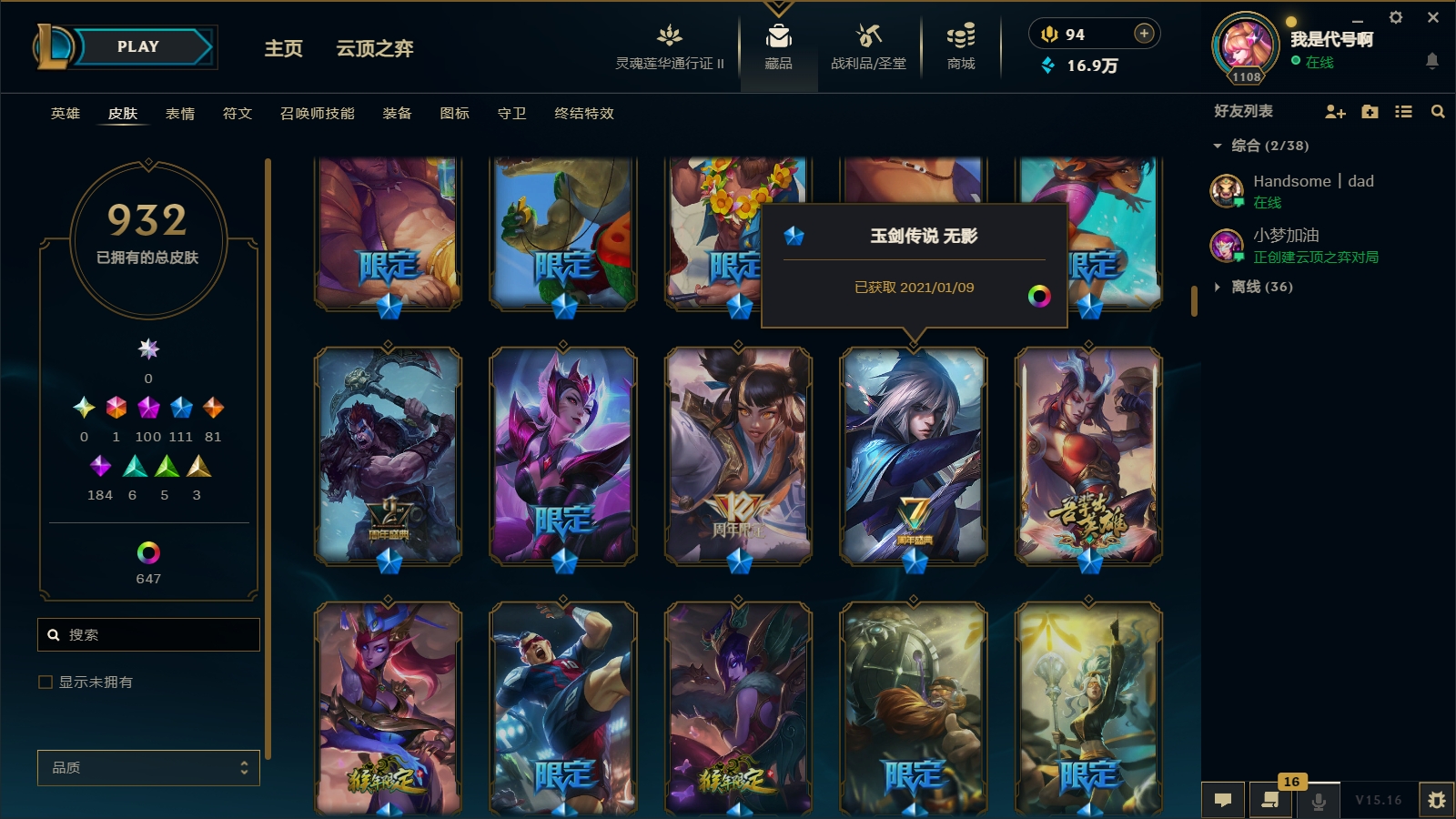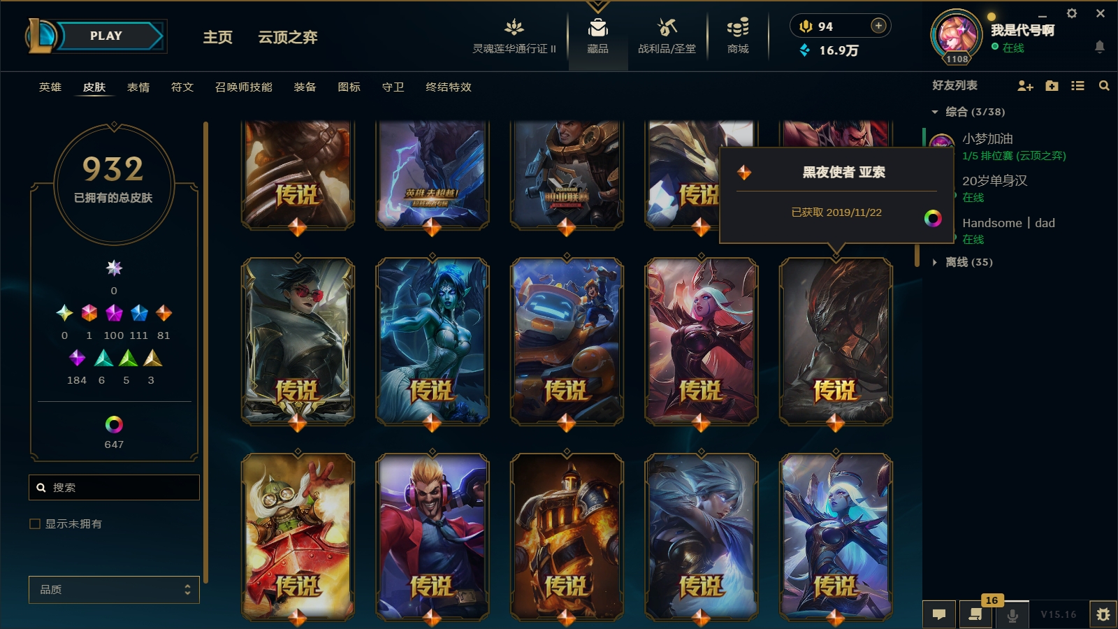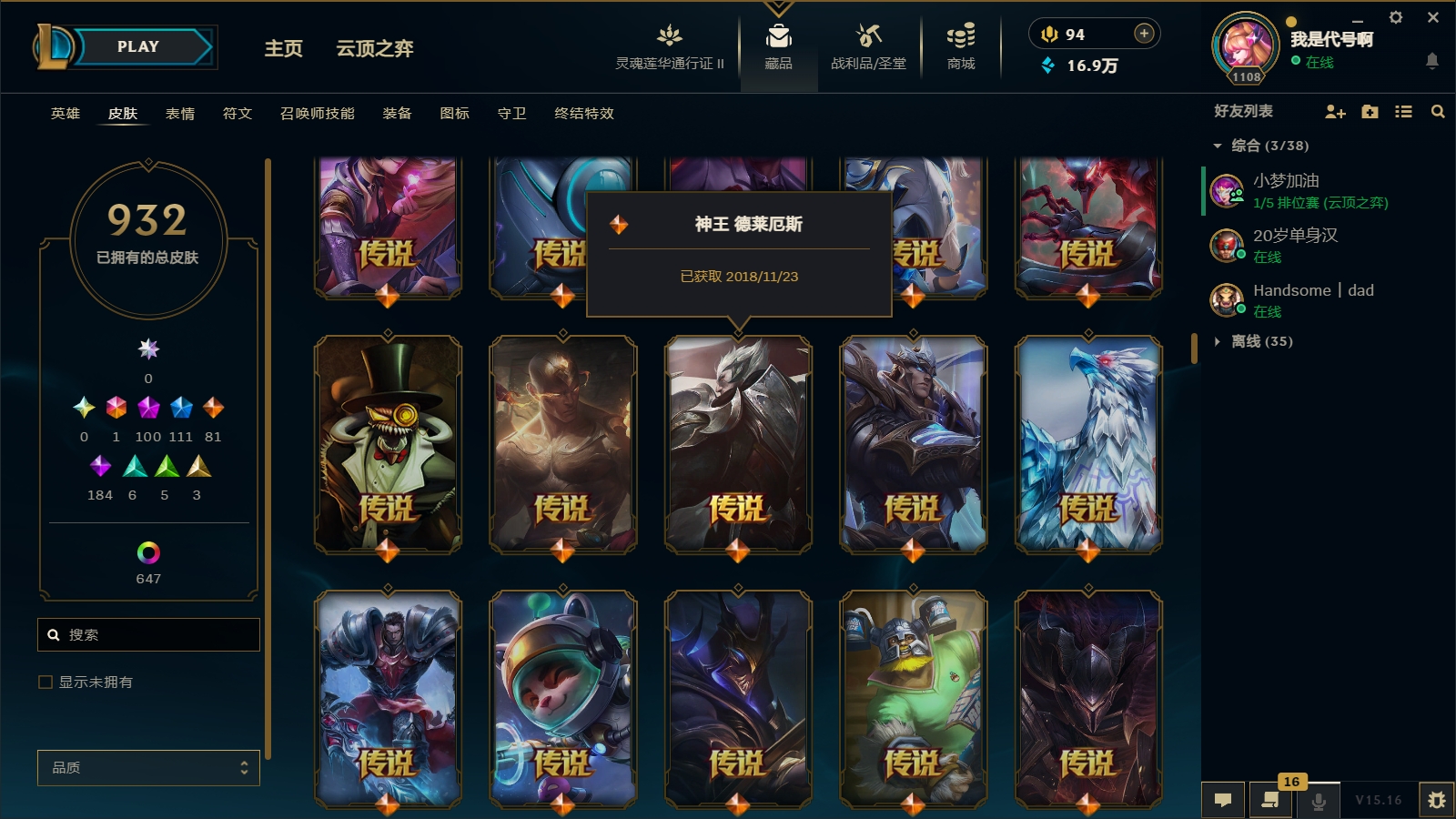 1800皮肤〓104至臻海克斯〓摄魂恐惧〓殿堂薇恩乐芙兰〓玉剑男刀〓黑夜黎明神王套〓沄顶神话拉克丝