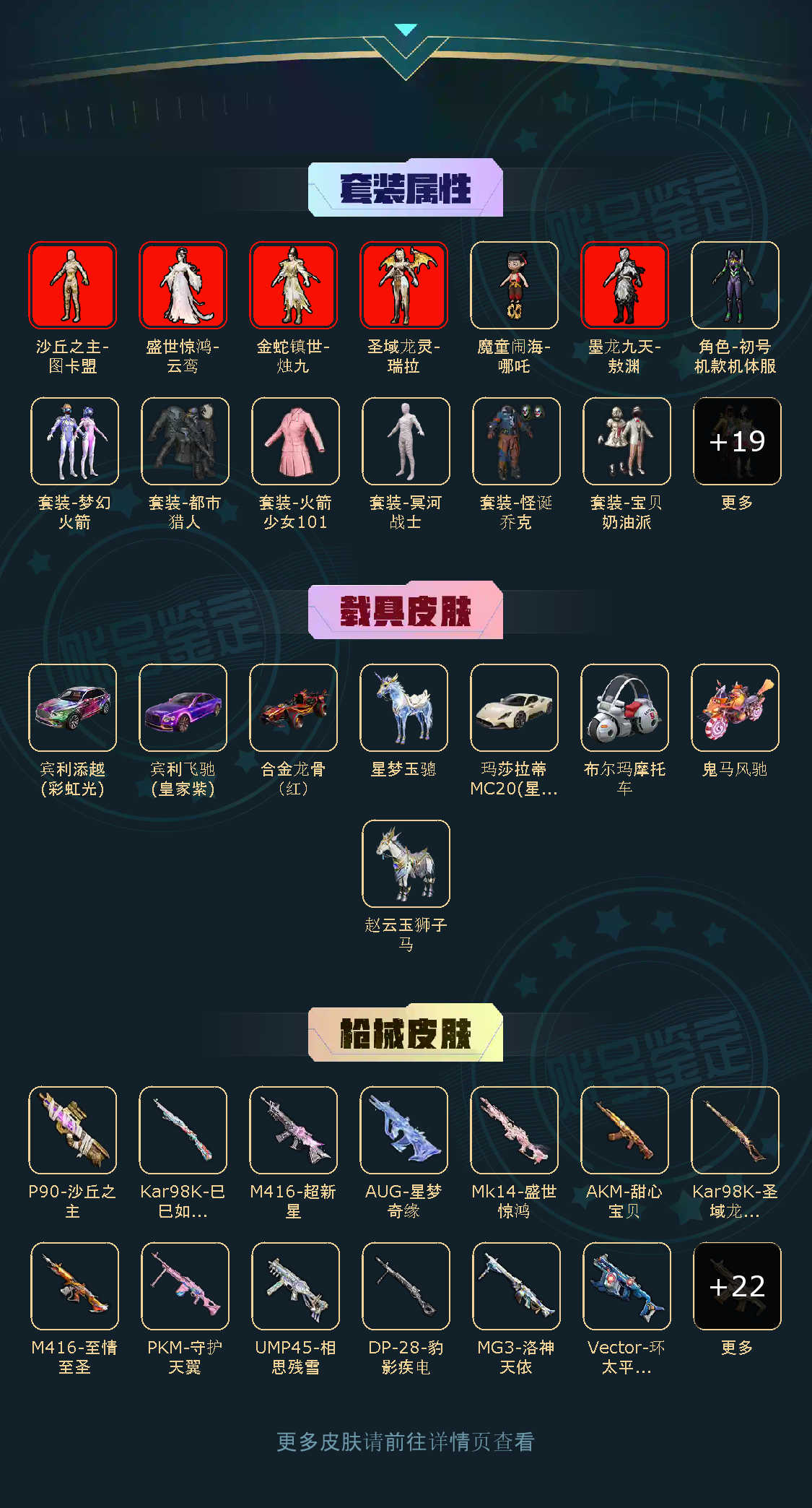 29粉,8载具,271套装,24王牌印记,无敌战神历史最高段,200769热力值 平底锅-林间仙鹿/AKM-甜心宝贝/SCAR-L-童趣迷兔/AUG-星梦奇缘/AUG-星之彼岸/GROZA-香水柠檬/M416-五爪金龙/AKM-魔法神域/M416-墨龙九天/M416-至情至圣/AUG-妙趣可丽/SCAR-L-机甲封神/M416-超新星/蜜獾-辉耀战甲/AKM-梦之光华/SCAR-L-魔童闹海 哪吒/Mk14-盛世惊鸿/Mk14-闲梦青缨/DP-28-暗夜鎏金/M249-彩虹甜喵/PKM-守护天翼/DP-28-圣堂之誓/MG3-洛神天依/DP-28-豹影疾电/UZI-绮梦青鸾/汤姆逊-怪笑疯兔/P90-甜蜜草莓/Vector-环太平洋/UMP45-相思残雪/P90-沙丘之主/烟雾弹-猫咪绅士/破片手榴弹-粉粉猫爪/Kar98K-圣域龙灵/AWM-花间之火/Kar98K-巳巳如意/宾利飞驰(皇家紫)/宾利添越(彩虹光)/鬼马风驰/合金龙骨(红)/玛莎拉蒂MC20(星石白)/星梦玉骢/赵云玉狮子马/照夜玉狮子/布尔玛摩托车/