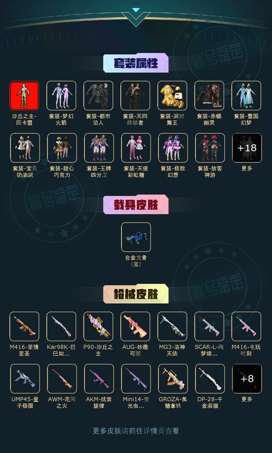 【稀有资产】沙丘之主-图卡盟[3级]/套装-雪国幻梦/套装-派对舞王/套装-深海小丑鱼/套装-赤蝎幽灵/套装-都市猎人/套装-天网终结者/套装-奇异狩猎者/套装-浪漫天命/套装-暗影哥特/套装-龟仙人/角色-都市丽猫/角色-摩登魅猫/套装-狂沙舞者/套装-东方飞龙/套装-冷酷挑战者/M416-星际漫游/M416-黄金龙骨/M416-快乐主宰