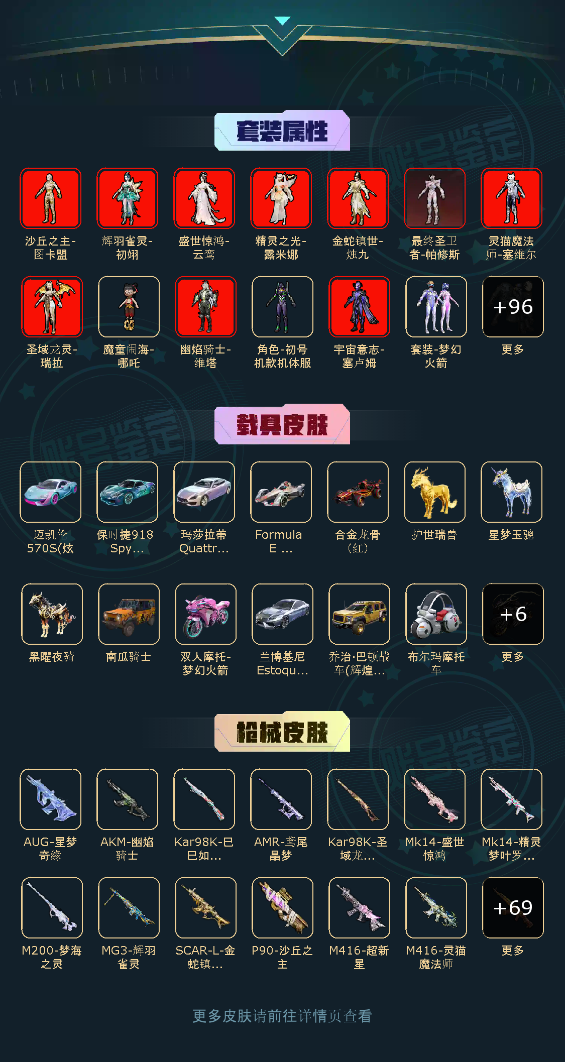 101粉,19载具,565套装,31王牌印记,无敌战神历史最高段,389728热力值 平底锅-仲夏莫吉托/平底锅-林间仙鹿/AKM-盖世英雄/M416-灵猫魔法师/AKM-甜心宝贝/SCAR-L-梦幻火箭/SCAR-L-童趣迷兔/AUG-星梦奇缘/M416-风花雪月/M416-电玩时刻/AUG-星之彼岸/SCAR-L-甜梦小狐/M762-甜心娃娃/M416-全功率超战/GROZA-旋转彩虹/M762-激战未来/GROZA-香水柠檬/M416-暖熊萌萌/AKM-幽焰骑士/AUG-南国舞曲/SCAR-L-天蓬元帅/M416-心之恋语/SCAR-L-纯梦嫁纱/M416-五爪金龙/AKM-魔法神域/M16A4-垂柳戏鸭/AKM-炫紫旋律/AKM-白勺歌姬/GROZA-精灵之光/M416-墨龙九天/GROZA-玉面桃花/SCAR-L-锦绣绵绵/M416-至情至圣/SCAR-L-金蛇镇世/AUG-妙趣可丽/M762-甜蜜誓约/M416-超新星/SCAR-L-魔童闹海 哪吒/SPAS-12-音爆索尼克/S12K-海渊国主/M417-第五大道/Mk14-盛世惊鸿/SKS-诡面斩/Mk14-精灵梦叶罗丽/Mini14-龙虾霸霸/DP-28-扶摇飞仙/M249-彩虹甜喵/MG3-辉羽雀灵/MG3-炙焰牛王/MG3-洛神天依/M249-蓝莓炮弹/DP-28-豹影疾电/UZI-绮梦青鸾/UZI-畅跳缤纷/P90-仙履奇缘/汤姆逊-怪笑疯兔/UMP45-量子极限/Vector-红伞翩翩/UMP45-宇宙意志/汤姆逊-荒漠赏金/Vector-环太平洋/UZI-筑梦精灵/Vector-最终圣卫者/UMP45-相思残雪/野牛-青空秋雨/UMP45-恐龙拽拽/P90-沙丘之主/爆炸猎弓-雪梅暗香/烟雾弹-猫咪绅士/破片手榴弹-粉粉猫爪/Kar98K-伏魔团/Kar98K-圣域龙灵/AWM-花间之火/AMR-鸢尾晶梦/Kar98K-巳巳如意/AWM-橘柚倾心/M24-暗星紫秘/M200-玉鳞金羽/AMR-智耀战神/M200-梦海之灵/Kar98K-暗翼战神/M24-星之信仰/玛莎拉蒂Quattroporte(幻星粉)/兰博基尼Estoque(尊享铂)/乔治·巴顿战车(辉煌金)/南瓜骑士/拉轰鸭鸭车/快艇-自由的鲸/特斯拉Cybertruck(镭光铂)/Formula E Gen2(荒原银)/合金龙骨(红)/保时捷918 Spyder(玺耀绿)/迈凯伦570S(炫冰蓝)/护世瑞兽/星梦玉骢/关羽赤兔马/黑曜夜骑/疾风龙骑/辉羽雀灵自行车/双人摩托-梦幻火箭/布尔玛摩托车/