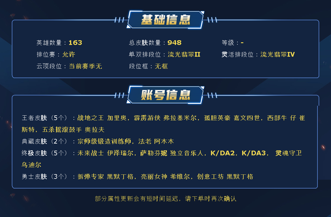 皮肤1000+|满英雄|神级3|史诗145|传说77|限定125|可排位|