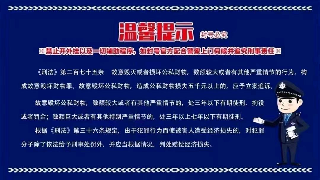 本公司所有账号已在武汉市公安局申报虚拟财产保护所有开挂开美化包等第三方违规软件