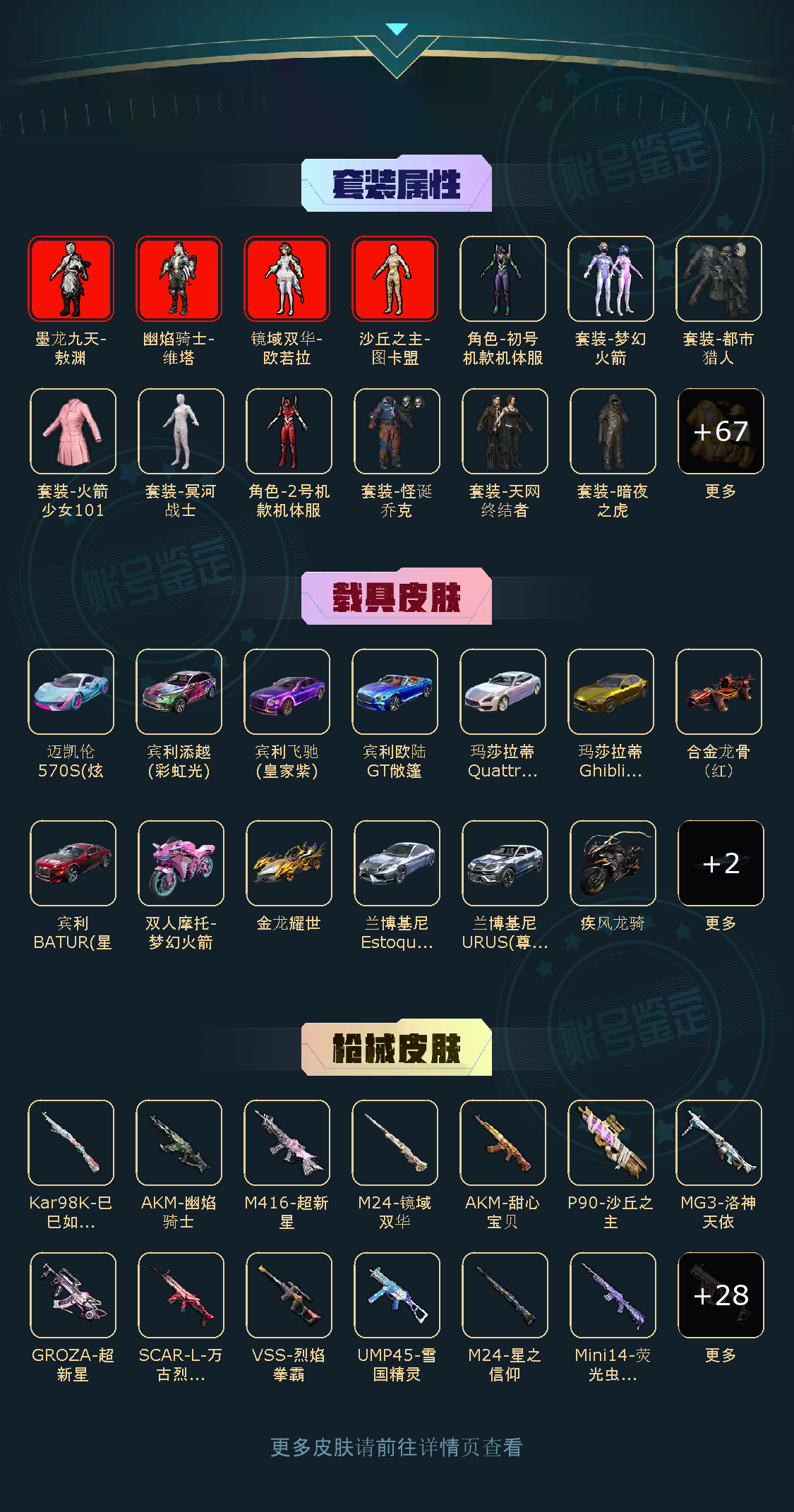 苹果V-4红装11稀有16载具67粉装40特效枪47热门380套装494枪皮 295539热力值 30印记 历史超级王牌22星 【4红装】 幽焰骑士-维塔 (1级) 墨龙九天-敖渊 (1级) 镜域双华-欧若拉 (1级) 沙丘之主-图卡盟 (2级) 【11稀有】 火箭少女101 木乃伊 奇异狩猎者 赤蝎幽灵 寒蝎幽灵 AWM-黄金龙骨 M416-星际漫游 都市猎人 派对舞王 天网终结者 派对舞王(金靴子) 【16载具】 宾利飞驰皇家紫 (4级) 宾利添越(彩虹光) (4级) 宾利欧陆GT深空蓝 (4级) 玛莎拉蒂Q幻星粉 (2级) 玛莎拉蒂金色 兰博轿车尊享铂 兰博SUV尊享铂 宾利BATUR(星火红) (2级) 迈凯伦570S炫冰蓝 (2级) 金龙耀世 合金龙骨红色 疾风龙骑 照夜玉狮子 双人摩托梦幻火箭 塞莎深潜蓝 (1级) 萌酷奶龙僚机 【67粉装】 红螳螂 紫螳螂 万古烈焰 圣堂之誓 梦幻火箭 蝶舞迷情 雪国幻梦 盖世英雄 水仙星 傲傲奶龙 宝贝奶油派 天使彩虹糖 甜心巧克力 洛天依 金风玉露 深海曼妙 月影灵韵 天星战神 炫光之旅 火曜朱雀 金曜白虎 怪诞乔克 冰炎战车 守护骑士 深渊皇后 双面双生 白勺歌姬 双星鱼跃 紫钛骑兵 射星猎手 室女星神 闲梦青缨 宙之时溯 星云暗核 金属狂野 静灵氛围 垂柳戏鸭 缤纷油彩 放客神游 莲影清波 牧神之羯 快乐主宰 荒野猎神 PEL轰鸣竞梦者 星之信仰 数码大师 极限特训 未来战士 麻辣鲜香锅 第五大道 极致幻想 锦绣火鲤 迷蝶贵族 暗夜鎏金 香水柠檬 翡翠骑士 绚金战神 童趣迷兔 冰霜白皇 炙焰红王 暗翼战神 星之彼岸 紫电风暴 赤焰黑爵 沙场疾风 天之羽翼 蓝莓炮弹 【40特效枪】 SCAR-L-梦幻火箭 (1级) M416-五爪金龙 (1级) SCAR-L-万古烈焰 (8级) M416-心之恋语 (1级) M416-墨龙九天 (1级) M416-超新星 (7级) AKM-熔岩统帅 (1级) P90-沙丘之主 (3级) AKM-甜心宝贝 (2级) M24-星之信仰 (1级) AKM-幽焰骑士 (7级) UMP45-雪国精灵 (6级) Kar98K-巳巳如意 (5级) Kar98K-伏魔团 (1级) M762-甜蜜誓约 (1级) DP-28-豹影疾电 (5级) PKM-天星战神 (4级) AWM-花间之火 (5级) AUG-超新星 (4级) Mini14-荧光虫舞 (7级) Mk14-闲梦青缨 (5级) AMR-智耀战神 (5级) AMR-炫光之旅 (1级) M24-镜域双华 (3级) GROZA-香水柠檬 (4级) SCAR-L-童趣迷兔 (1级) AUG-星之彼岸 (1级) DP-28-圣堂之誓 (4级) AKM-梦之光华 (1级) 汤姆逊-冰川粉黛 (4级) 野牛-青空秋雨 (4级) VSS-烈焰拳霸 (1级) GROZA-超新星 (8级) P90-粉樱探戈 (5级) M16A4-垂柳戏鸭 (1级) M762-冷魅冰骑 (1级) Vector-灵感创作师 (5级) MG3-洛神天依 (6级) M249-蓝莓炮弹 (1级) 平底锅-林间仙鹿 (5级) 【47热门】 奇迹天团 龟仙人 星光纪元 暗夜之虎 太空漫步 雪山精英 东方飞龙 潮萌小黄鸭 爱崽白熊 梦魇先生 万圣娃娃 鹰眼刺客 软萌银虎 奇迹天团 黄金大亨 暗夜之虎 迅捷狂鲨 大橘为重 浪客战士 裁决冥王 神秘黑猫 暗夜契约 暗影哥特 SS1特训 团圆交子 瑞龙福将 纯白誓言 忍者信条 水银刺客 漫步者 冰爽海盐 韶华初心 影双刃 娴静芝兰 静谧青瓷 机械英豪 破蛋小黄鸡 风华少年志 白月香洋装 软嫩糖心蛋 黑色刀锋 军刀雅典娜 弄潮海豚 M416-快乐主宰 M762-瑞龙福将 Kar98K-深海曼妙 M24-香水柠檬 【13飞行器】 龙翔九天飞行器 锦绣火鲤飞行器 心之恋语飞行翼 梦幻火箭飞行器 春暖花开飞行器 相思残雪飞行器 星之信仰飞行翼 深海曼妙飞行器 镜光幻境飞行翼 歌者泠鸢飞行器 千面幻镜飞行器 冷魅冰骑飞行器 PEL轰鸣竞梦者飞行器 【14头盔】 银河战甲头盔 梦幻火箭头盔 雪国精灵头盔 金曜白虎头盔 甜心宝贝头盔 百万伏特头盔 幻影战神头盔 金风玉露头盔 金属狂野头盔 静灵氛围头盔 缤纷油彩头盔 放客神游头盔 心之恋语头盔 花间之火头盔 【20背包】 梦幻火箭背包 雪国精灵背包 金曜白虎背包 甜心宝贝背包 百万伏特背包 幻影战神背包 金风玉露背包 金属狂野背包 静灵氛围背包 缤纷油彩背包 放客神游背包 萌熊伴侣背包 潮萌小黄鸭背包 深海曼妙背包 神秘黑猫背包 古堡领主背包 金羽特工背包 甜蜜誓约背包 心之恋语背包 花间之火背包 营地ID