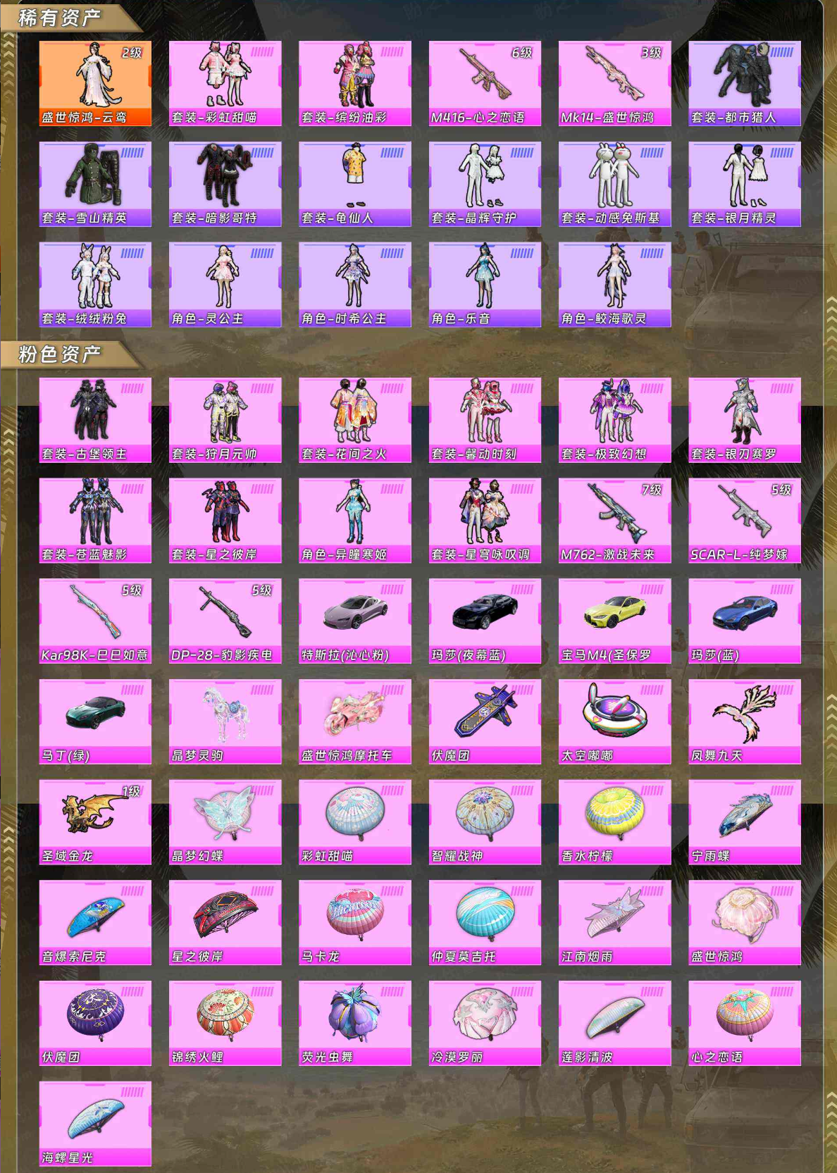 【稀有资产】盛世惊鸿-云鸾[2级]/套装-彩虹甜喵/套装-缤纷油彩/M416-心之恋语/Mk14-盛世惊鸿/套装-都市猎人/套装-雪山精英/套装-暗影哥特/套装-龟仙人/套装-晶辉守护/套装-动感兔斯基人偶服/套装-银月精灵/套装-绒绒粉兔/角色-灵公主/角色-时希公主/角色-乐音/角色-鲛海歌灵