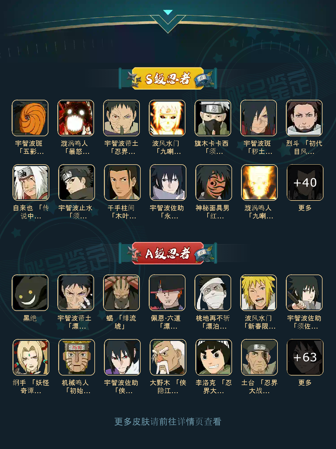 300忍者S级忍者(38个) : 猿飞日斩,自来也「仙人模式」,宇智波鼬「须佐能乎」 ,自来也,纲手,波风水门,大蛇丸,佩恩「天道」神秘面具男,女「四代目雷影J千手柱间,宇智波斑,长门「秽土转生」,宇智波带土「漂泊浪客」,金角银角「秽土转生 J波风水门[秽士转生」,无二代目土影」,纲手「百豪」,千手扉间「秽土转生」,宇智波斑「白面具」宇智波斑「秽土转生」,药师兜「仙人模式」,佩恩天道「超」,自来也「舞之豪杰」,宇智波鼬「[秽 土转生」千手柱间「秽土转生」,宇智波带土「忍界大战」宇智波斑「木叶创立」迈特凯「死门」大野木「忍界大战」,漩涡鸣人「九喇嘛连结」 ,大筒木金式「博人传」 ,50S「忍界大战」,神秘面具男 「红夜之刃」宇智波佐助「永恒万花筒」 ,千手柱间「木叶创立」 ,宇智波斑「秽土转生.解」 ,大筒木桃式