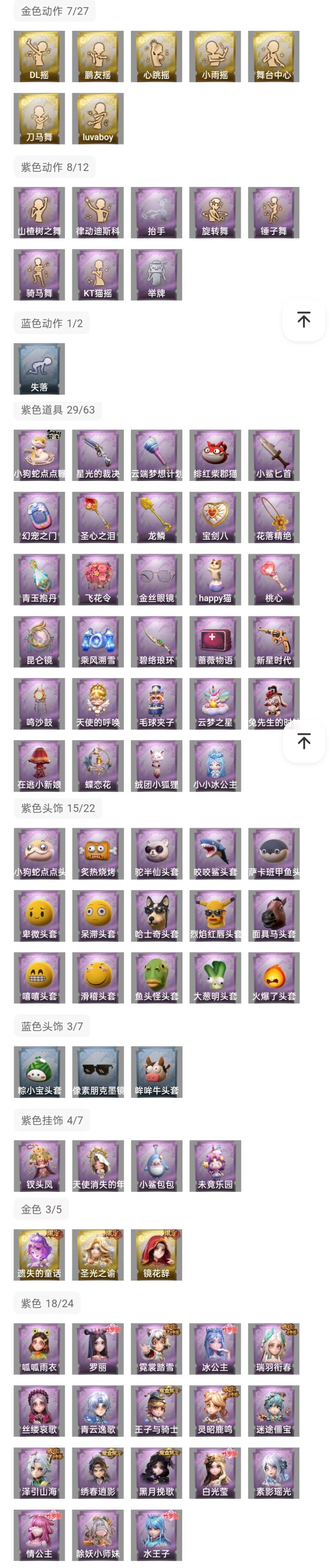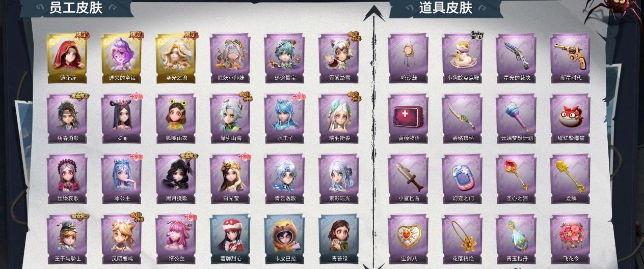 【紫色皮肤】阿念-迷途僵宝、莉莉-除妖小师妹、薇薇安-黑月挽歌、阿念-王子与骑士、莉莉-情公主、艾伦-水王子、爱丽丝-冰公主、小黄-罗丽、薇薇安-白光莹、逍遥-泽引山海、阿念-灵昭鹿鸣、爱丽丝-瑞羽衔春、小黄-霓裳踏雪、零-青云逸歌、巫铃儿-素影瑶光、爱丽丝-丝缕哀歌、逍遥-绣春逍影、小黄-呱呱雨衣