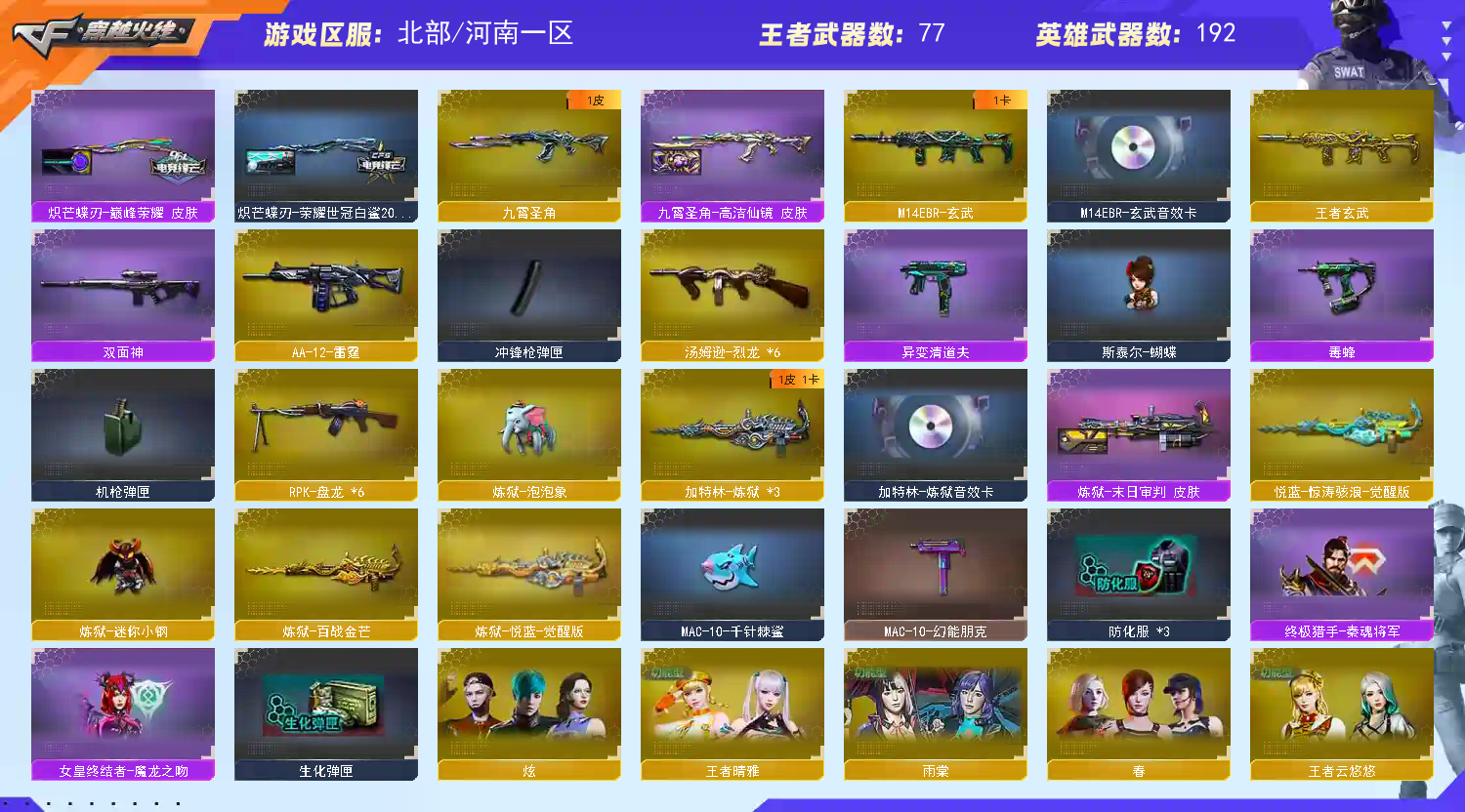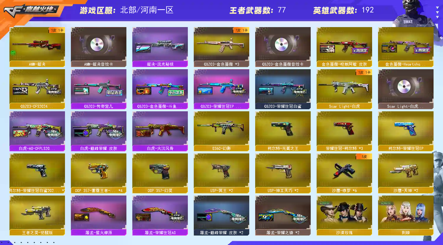 ✨手枪:冥王x2+USP神功天巧X2+荣耀世冠EP+荣耀世冠白鲨X2+无冕之王+荣耀世冠柯尔特X3+COP幻灵+COP雷霆王者X4+传说幽冥+传说破晓