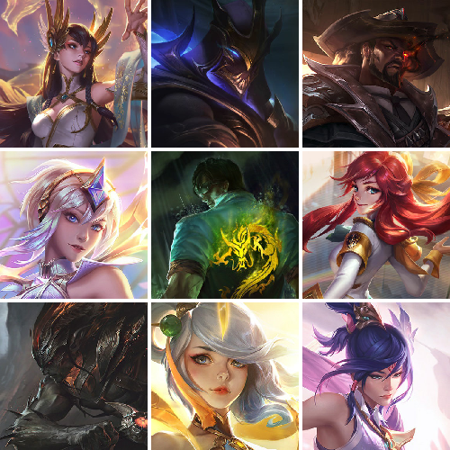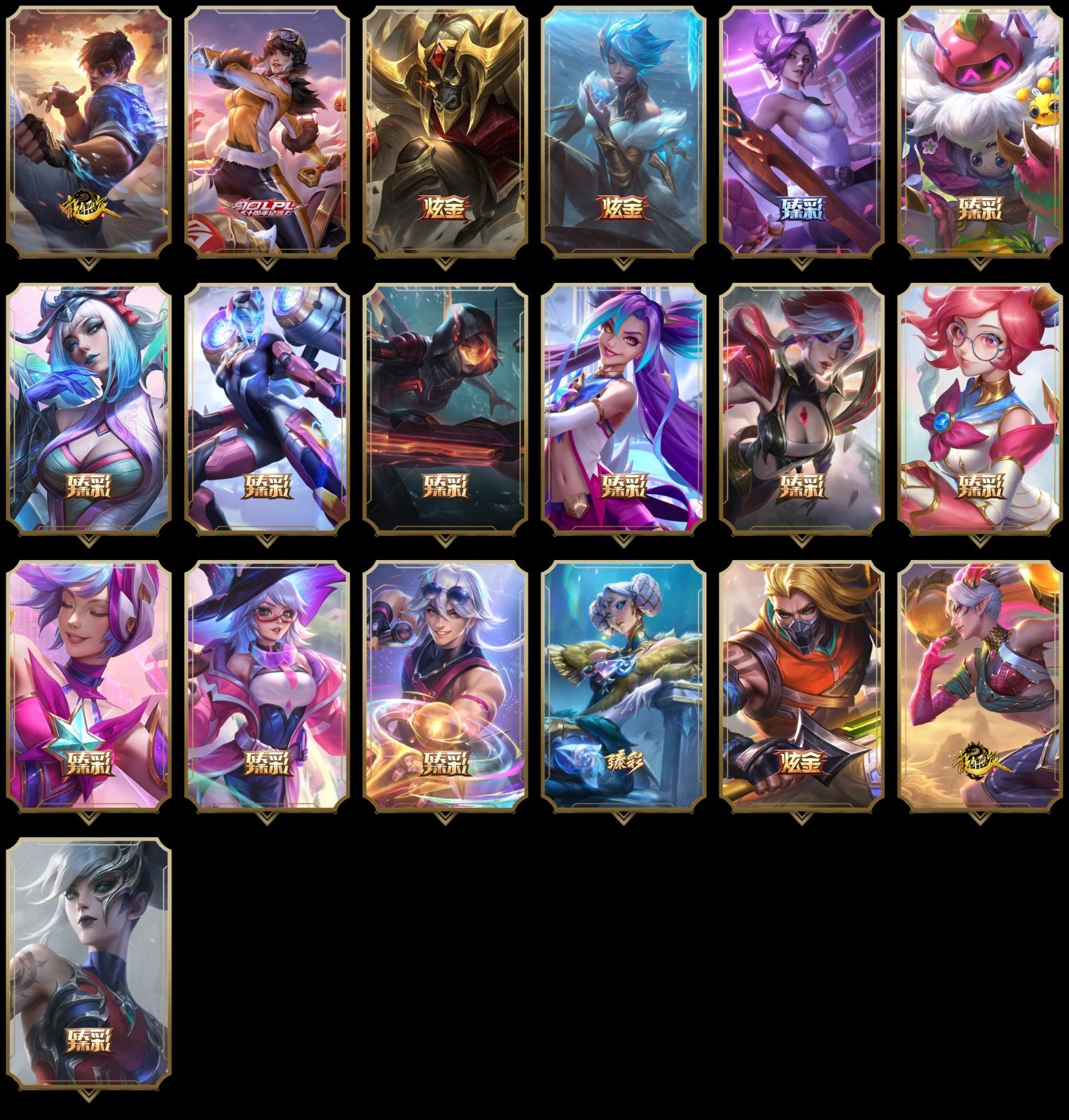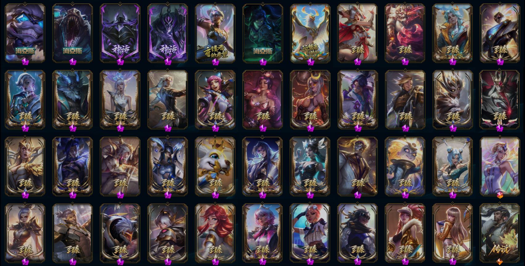 【重要皮肤】永恒星灵佐伊至臻 暗裔英雄嘉文四世至臻 战斗学院奇亚娜至臻 天龙之子伊泽瑞尔至臻 北极星钢影卡蜜尔至臻 心之钢永恩至臻 玉剑传说琴仙子至臻 墨之影武者亚索至臻 剪纸仙灵希维尔至臻 青花瓷丽桑卓至臻 北极星使者沃里克至臻 灵魂莲华易至臻 海珀利安小队X09星环灵风迦娜至臻 星之守护者辛德拉至臻 幻灵战斗猫金克丝至臻 神凰行者烈羽焰凰霞至臻 女帝黛安娜至臻 魔女婕拉至臻 魔女乐芙兰至臻 真实伤害赛娜至臻 灵能特工伊泽瑞尔至臻 源计划逆流塞拉斯至臻 源计划阴劫至臻 黑夜使者凯隐至臻 神龙尊者均衡之龙沃利贝尔至臻 焰执事布兰德至臻 KDA一代卡莎至臻 KDA阿卡丽至臻 战斗学院拉克丝至臻 烈焰美人薇恩至臻 源计划正义艾瑞莉娅至臻 真实伤害奇亚娜至臻 绒毛菲兹至臻 玉剑传说武剑仙至臻 未来战士锤石至臻 未来战士锤石2022至臻 灰烬骑士莫德凯撒 灰烬征服者潘森 海克斯科技安妮 海克斯科技雷克顿 海克斯科技吉格斯 水晶圣骑塔莉垭 黎明使者卡尔玛 摄魂使者薇恩 胜利剑圣易 荣誉使者玛尔扎哈 养蜂人辛吉德 电玩女神厄运小姐 电玩勇者锐雯 电玩女神阿狸 玉剑传说舞剑仙 海珀利安小队Y03权天使卡蜜尔 黎明使者薇恩 龙的传人李青 银龙裁决泰隆 天龙之子斯莫德 虎头虎脑崔丝塔娜 招财进宝提莫 替父从军花木兰 春晖神女拉克丝 你看见过我的熊猫吗安妮 北辰之威内瑟斯 玉净夜叉凯特琳 紫金罗刹莫甘娜 金猪烈焰瑟庄妮 烈焰美人薇恩 神龙之翼库奇 福牛守护者安妮 福牛守护者菲奥娜 甜心之翎洛 甜心宝贝娑娜 穿心之剑菲奥娜 觅心游侠卢锡安 觅心女王艾希 双城之战2微光实验室辛吉德 北极星发明家塞拉斯 冬季仙境奥莉安娜 魄罗骑士瑟庄妮 夺命美人卡特琳娜 平安夜女神娑娜 圣诞糖果棒厄运小姐 魅惑女巫奈德丽 伯爵卡萨丁 大魔法锅布里茨 泳池派对普朗克 泳池派对厄运小姐 泳池派对菲奥娜 泳池派对格雷福斯 泳池派对李青 泳池派对雷克顿 电玩战魂赫卡里姆 送披萨的小姐姐希维尔 EDG厄斐琉斯 EDG佐伊 DWG奈德丽 FPX李青 FPX普朗克 iG乐芙兰 SSG伊泽瑞尔 SKTT1艾克 SKTT1卡莉丝塔 SKTT1瑞兹 SKTT1伊莉丝 SSW锤石 SSW雷恩加尔 SKTT1贾克斯 SKTT1婕拉 暗杀星蒙多 暗杀星努努和威朗普 暗杀星伊泽瑞尔 Fnatic迦娜 Fnatic嘉文四世 Fnatic卡尔萨斯 冰雪节格雷福斯 防暴士兵格雷福斯 防暴士兵辛吉德 冠军典狱长锤石 冠军掠夺者卡兹克 冠军之矛卡莉丝塔 冠军之刃锐雯2016 鬼影重重魔腾 胡桃夹子萨科 警用试作体K9内瑟斯 密林猎手提莫 女猎手希维尔 圣诞精灵崔丝塔娜 圣诞开心鬼提莫 圣诞狂欢努努和威朗普 圣诞玩偶波比 圣诞驯鹿克格莫 糖果使徒费德提克 无头骑士赫卡里姆 喜庆之树茂凯 幸福女神乐芙兰 野兽猎人德莱文 野兽猎人瑟庄妮 野兽猎人泰达米尔 征服者阿利斯塔 征服者卡尔玛 征服者韦鲁斯 暗影沃里克 波比的巧克力工坊 地底世界崔斯特 都铎王朝图奇 神凰行者瑞羽圣凰艾尼维亚 机神白虎贾克斯 暗裔英雄盖伦 大元素使拉克丝 绝息圣堂洛