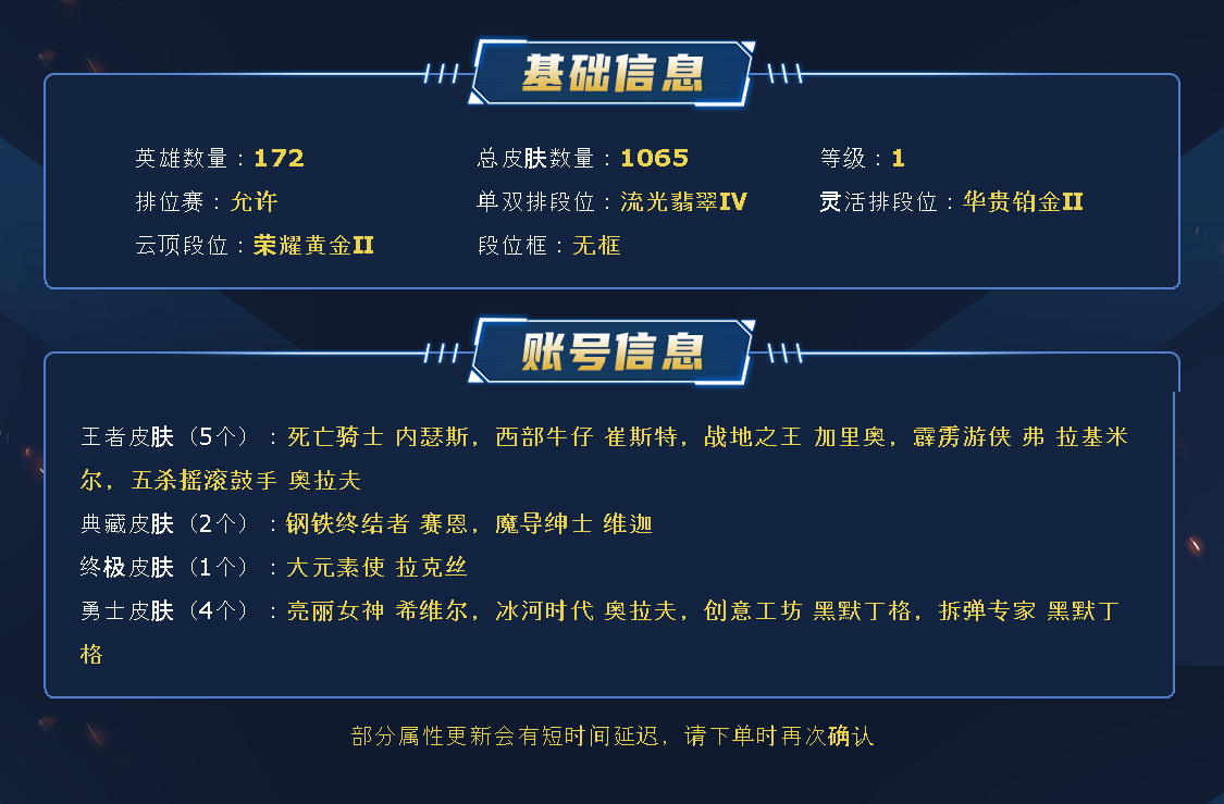 ~~喜欢记得收藏~~可排位~~1057皮全英雄~~租之前尽量查一下游戏ID,确保段位是您需要的,避免浪费您的时间~~请勿挂机逃跑故意送人头,谢谢合作,谢谢~~