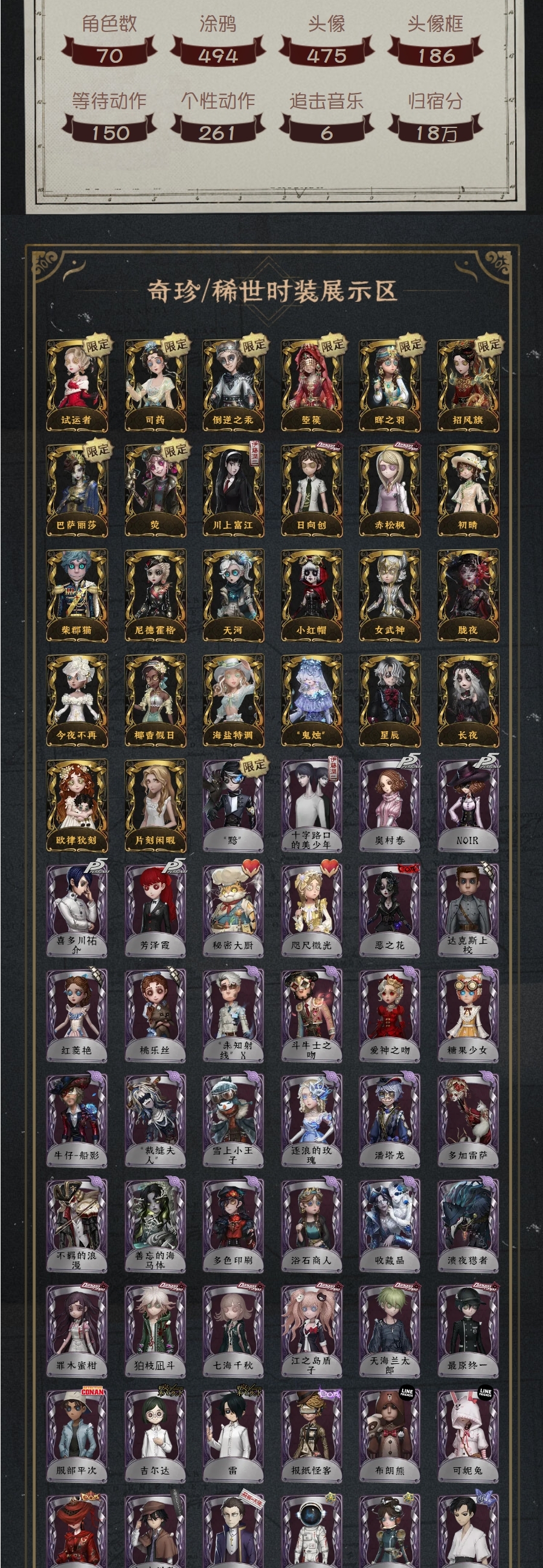 722稀世26奇珍13824稀世0奇珍5201稀世15奇珍57角色数70涂鸦494头像475头像框186等待动作150个性动作261追击音乐6归宿分18万试运者司药倒逆之汞箜篌晖之羽招风旗巴萨丽莎荧川上富江日向创赤松枫初晴柴郡猫尼德霍格天河小红帽女武神胧夜今夜不再椰香假日海盐特调“鬼烛”星辰长夜欧律狄刻片刻闲暇“黯”十字路口的美少年奥村春NOIR喜多川祐介芳泽霞秘密大厨咫尺微光恶之花达克斯上校红菱艳桃乐丝“未知射线”X斗牛士之吻爱神之吻糖果少女牛仔-船影“裁缝夫人”雪上小王子逐浪的玫瑰潘塔龙多加雷萨不羁的浪漫善忘的海马体多色印刷浴石商人收藏品溃夜猎者罪木蜜柑狛枝凪斗七海千秋江之岛盾子天海兰太郎最原终一服部平次吉尔达雷报纸怪客布朗熊可妮兔踏莎行江户川乱步葛雷星航之旅源自星辰百目鬼静先驱探索紧急运输摩诺蛋小黄的好朋友弦音畸变“伊始新篇”警戒哨台义体再构伊布陶梦嫣赞因掌中篆记不死护卫往昔永生花鎏金的表演大师罗刹绯春郁金香之梦镏金铜鹿动力芯考古教授弹簧手寄生思明白鹰之舞Re-Swim纸心“月佑者”香薰诡焰流离的月光阿瓦尔的战车水晶烛台光织守护聚光灯下甜心蛋糕仙鹤彼岸祈雨之女硫火克朗普斯衣帽架先生箭竹阴阳司公桃面书生冰中蝶冰上舞蹈暮剑En ligne“琥珀”历战猎人禁闭院长纸皇后红龙夫人缄默者祝祷噬恶之渊伊万骨笛狡女高音“宴舞”夜光杯霰蓝釉先生琴键“亡灵”荒野女巫列车长衔尾蛇球球裁纸机钨藏清洁翼湖中影鬼天蛾神圣阿斯莫银骑士烟花盖伊熄灭的太阳执政官随机数墨韵吟游诗人游隼拂晓女士BISHOP-f1行于界限间向深处求告“膨化”茶歇小姐图鉴内容来源于游戏数据
