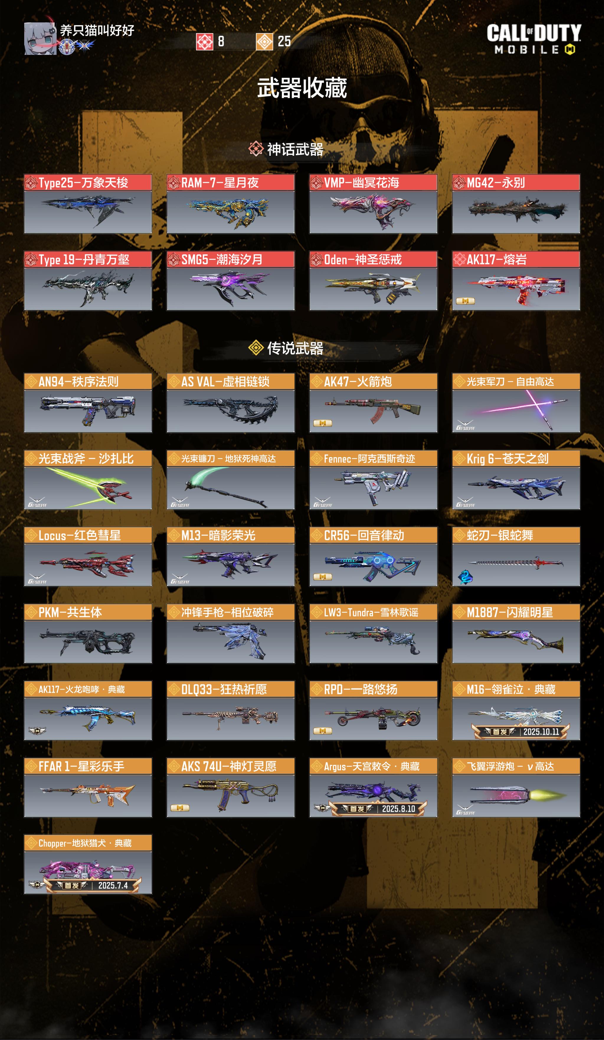 Type25-天象万梭 RAM-7-星月夜 VMP-幽冥花海 MG42-永别 Type19-丹青万壑 SMG5-潮海汐月 Oden-神圣惩戒 AK117-熔岩