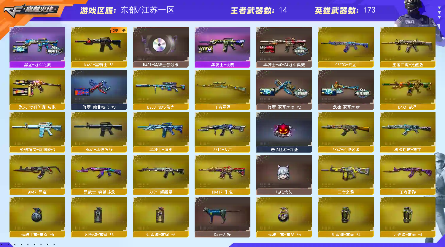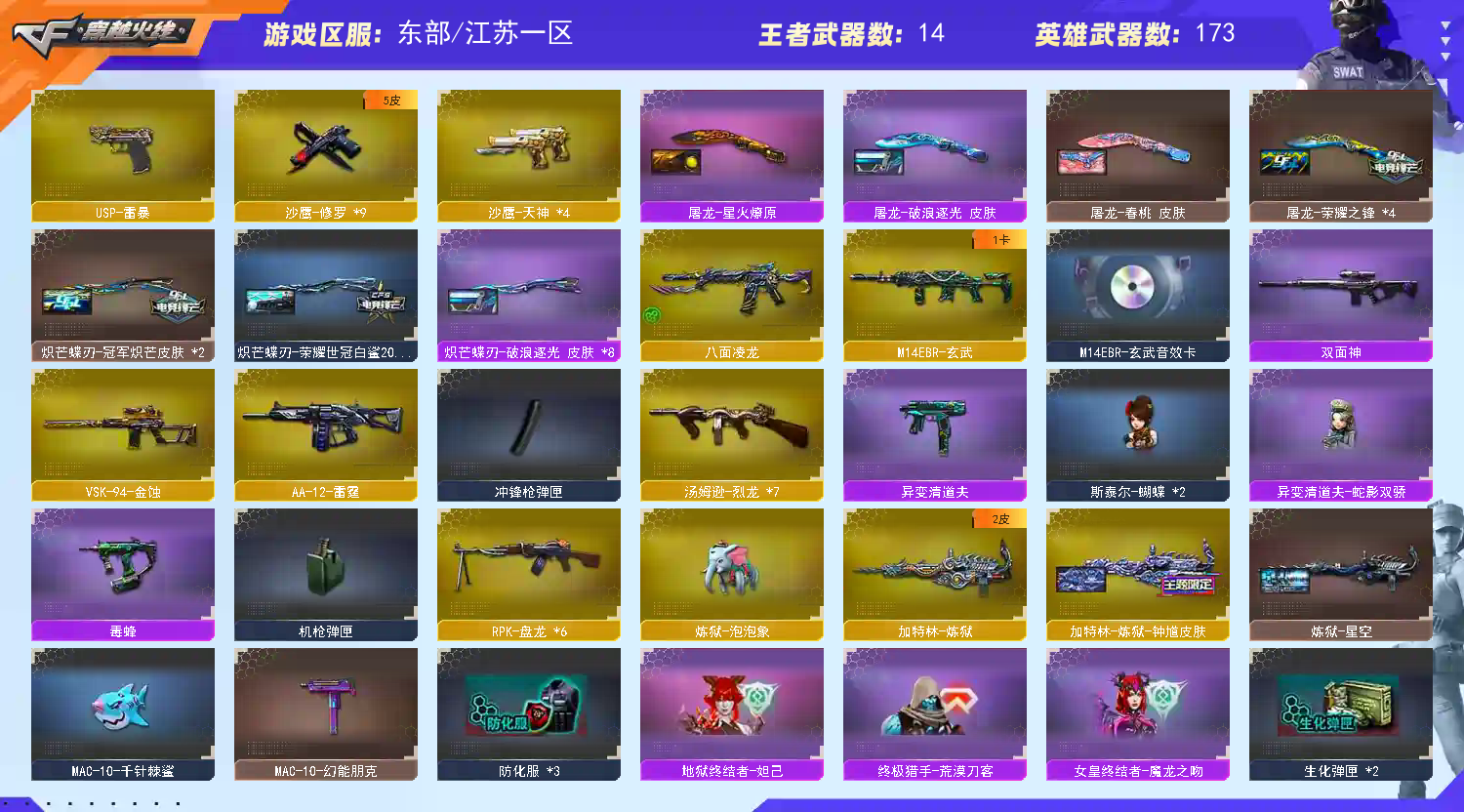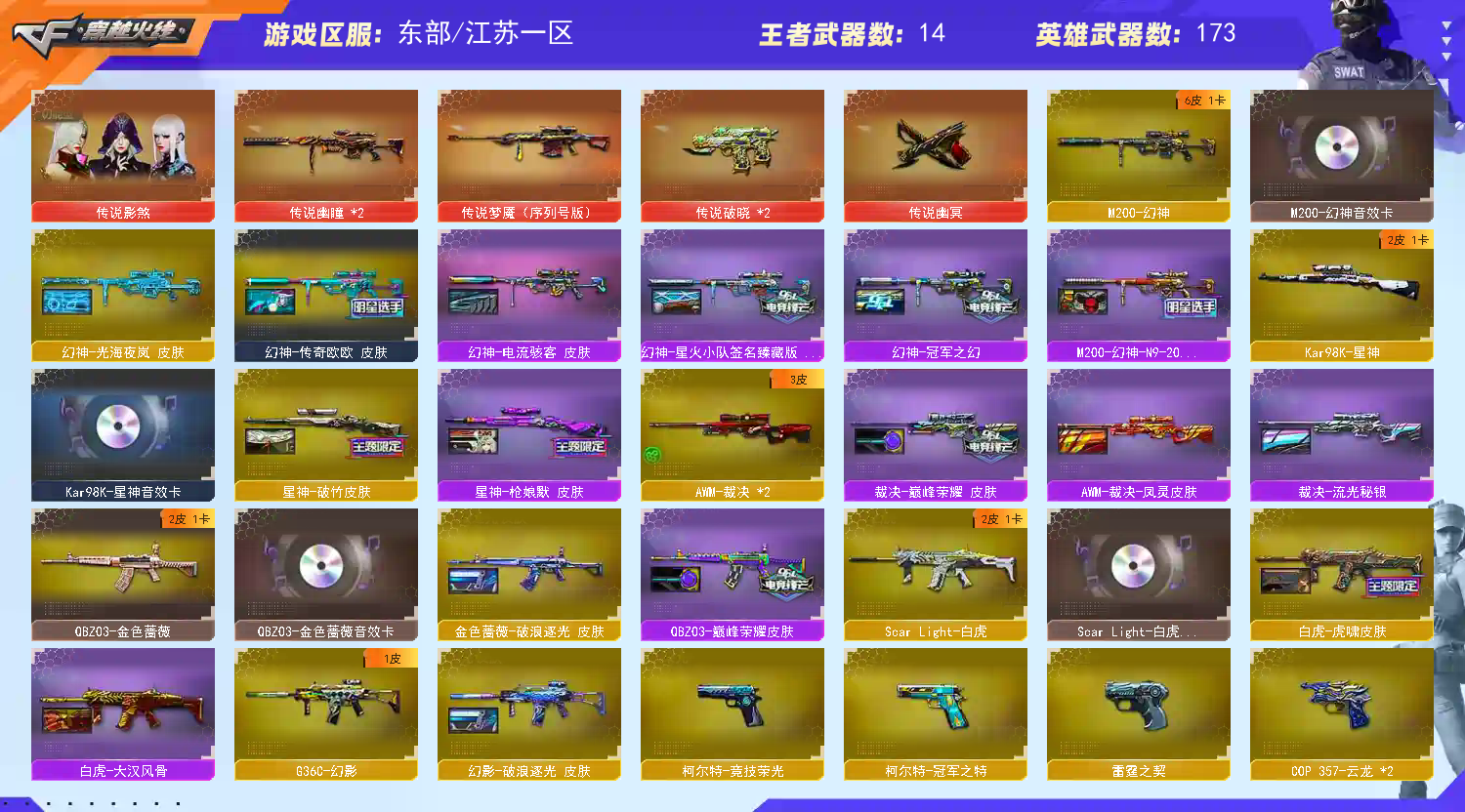 10炽芒蝶刃全带皮+炼狱泡泡象+限量幻神皮肤光海夜阑+4防传说影煞+2传说幽瞳+序列号5632传说梦魇+2传说破晓+传说幽冥+神秘礼盒背包+6皮幻神光海夜阑传奇欧欧星火小队冠军之幻N9电流骇客幻神音效卡+MAC千针棘鲨+qbz嘉年华柯基+枪娘默破竹星神音效卡+王者星霆+星神枪娘默+巅峰荣耀流光凤灵3皮裁决+大汉风骨虎啸双皮白虎音效卡+王者白虎+破浪逐光巅峰荣耀金色蔷薇音效卡+云龙枪娘空qbz+G36C幻影破浪逐光+朱雀+玄武+八面凌龙带玩偶+雷暴USP+冠军之特+竞技柯尔特+雷霆COP+2云龙COP+7烈龙双斯太尔蝴蝶-异变清道夫蛇影双骄-毒蜂-异变清道夫-毒蜂金钱-炽火炎龙+4防云悠悠+关小雨+华+岚兮儿+3防隐+雨裳+王者迷迭香