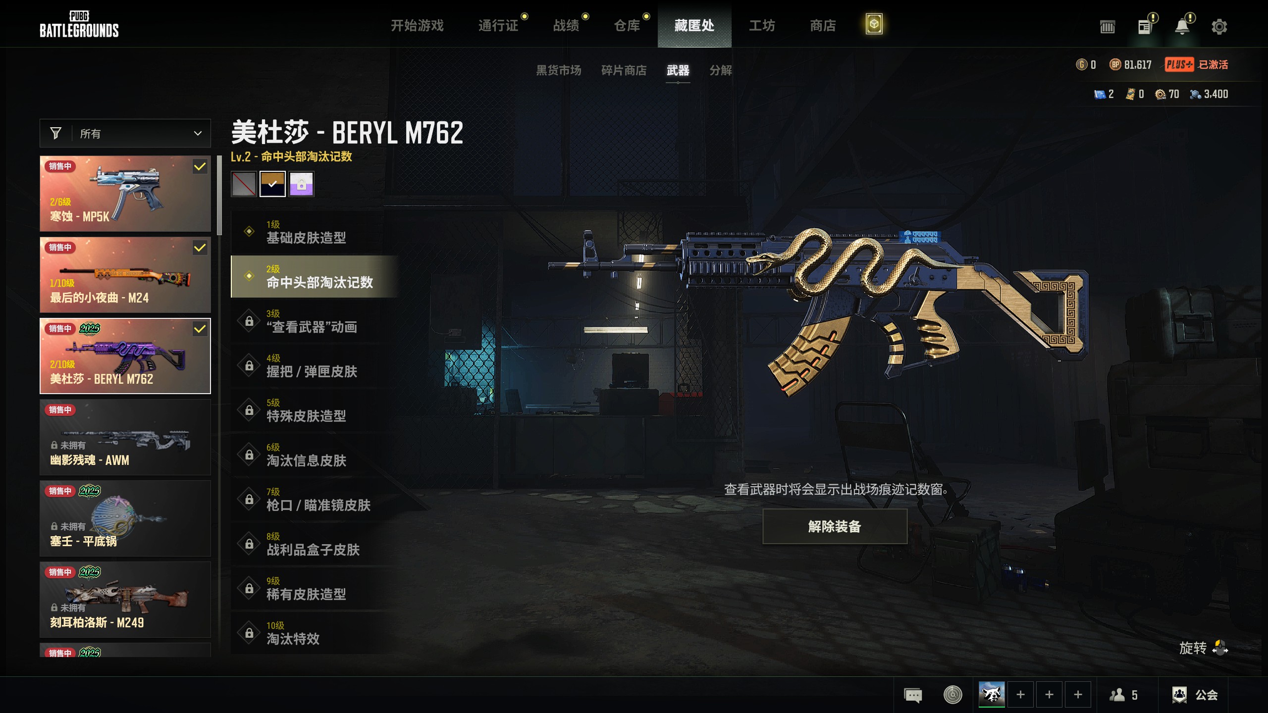 二级密0820395二级异色美杜莎-2级MP5K-1级M24-熔岩416-科技AUGSKS