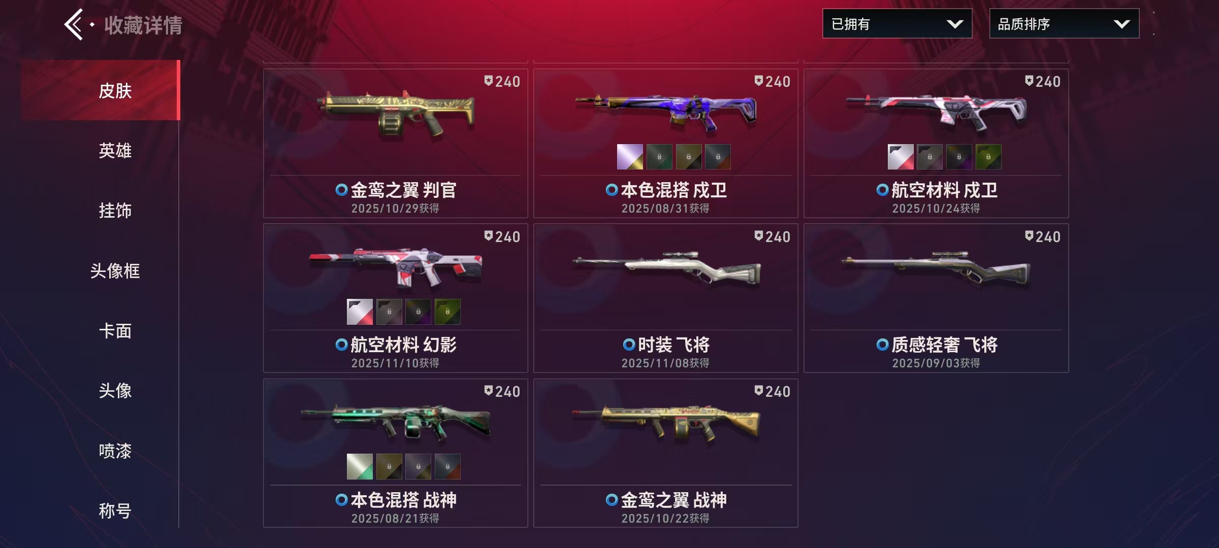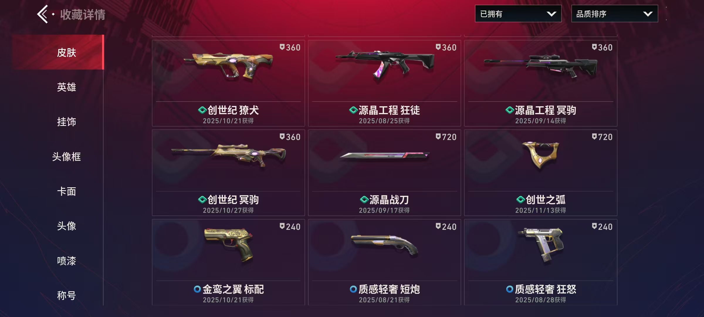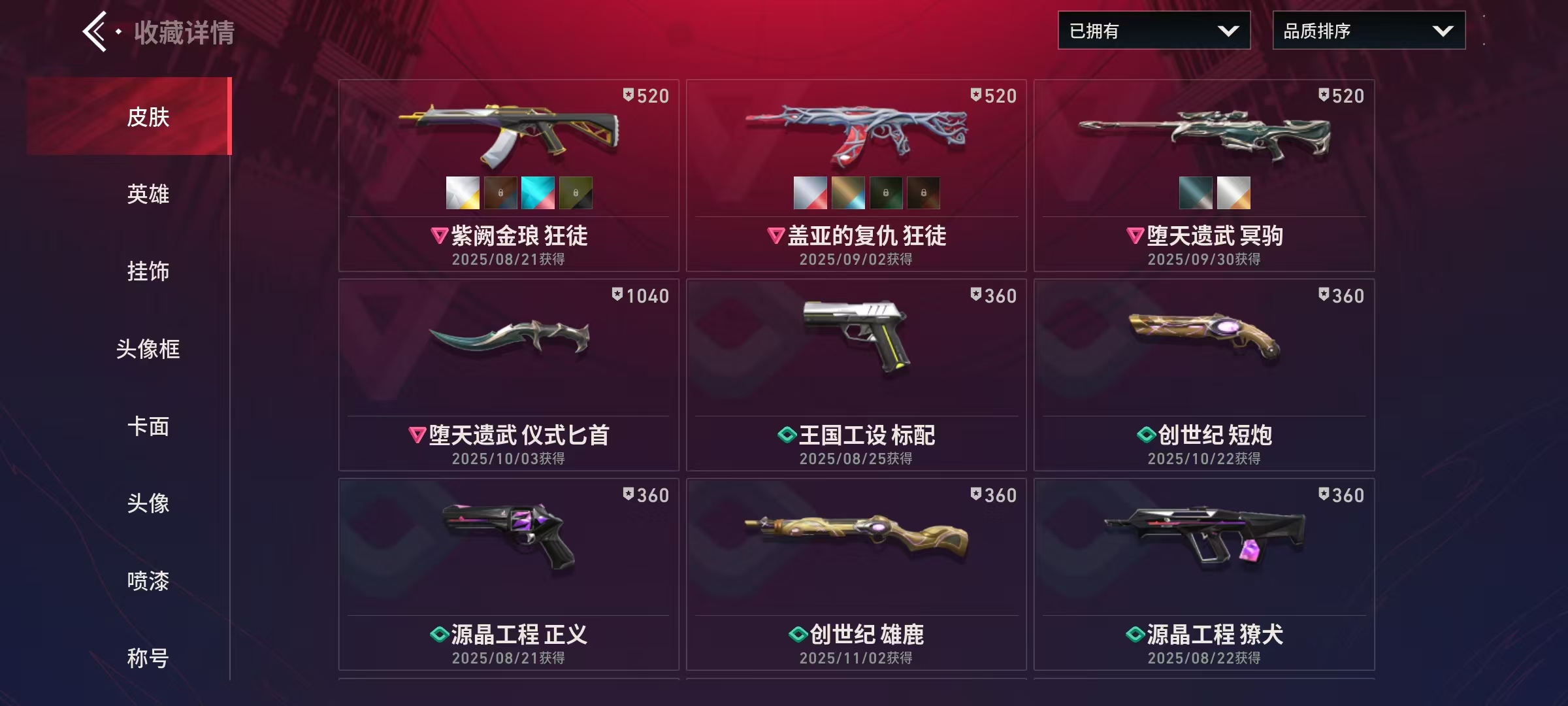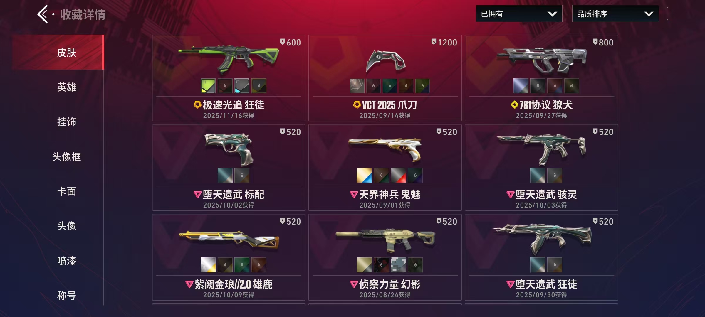 24级收藏家 堕天遗武全套 VCT爪刀 极速光追 狂徒 781协议 獠犬 天界神兵 鬼魅 紫阙金琅/12.0雄鹿 侦察力量 幻影 紫阙金琅 狂徒 盖亚的复仇 狂徒