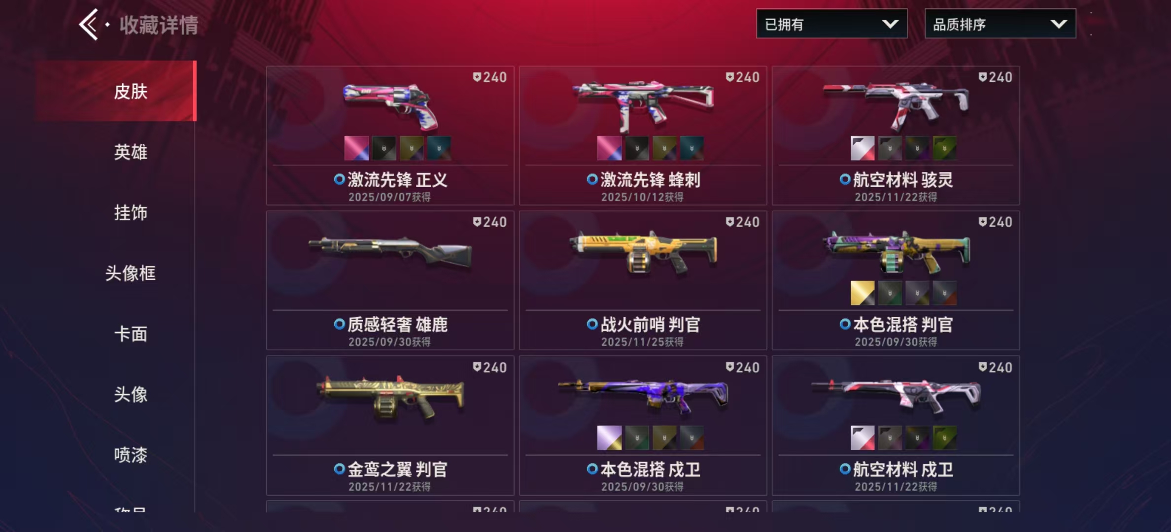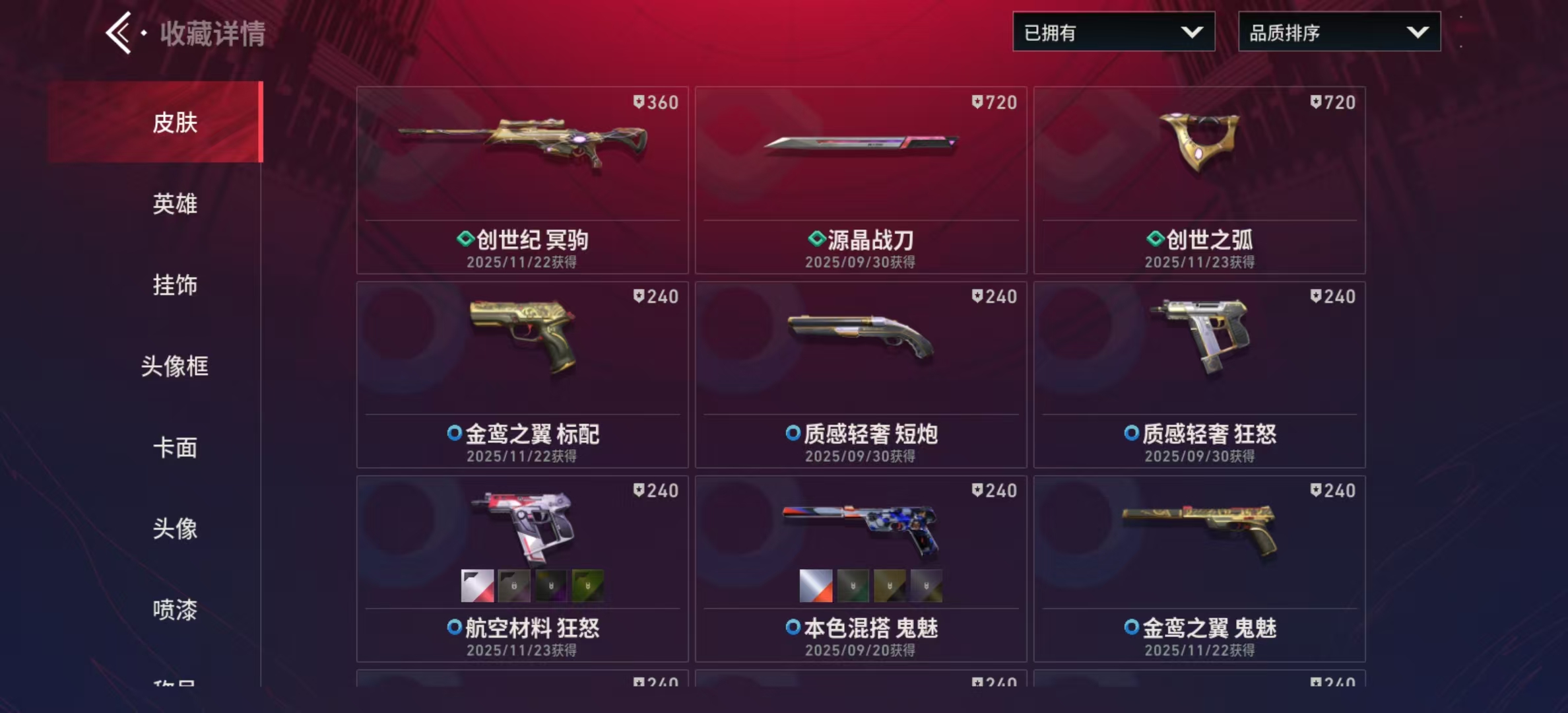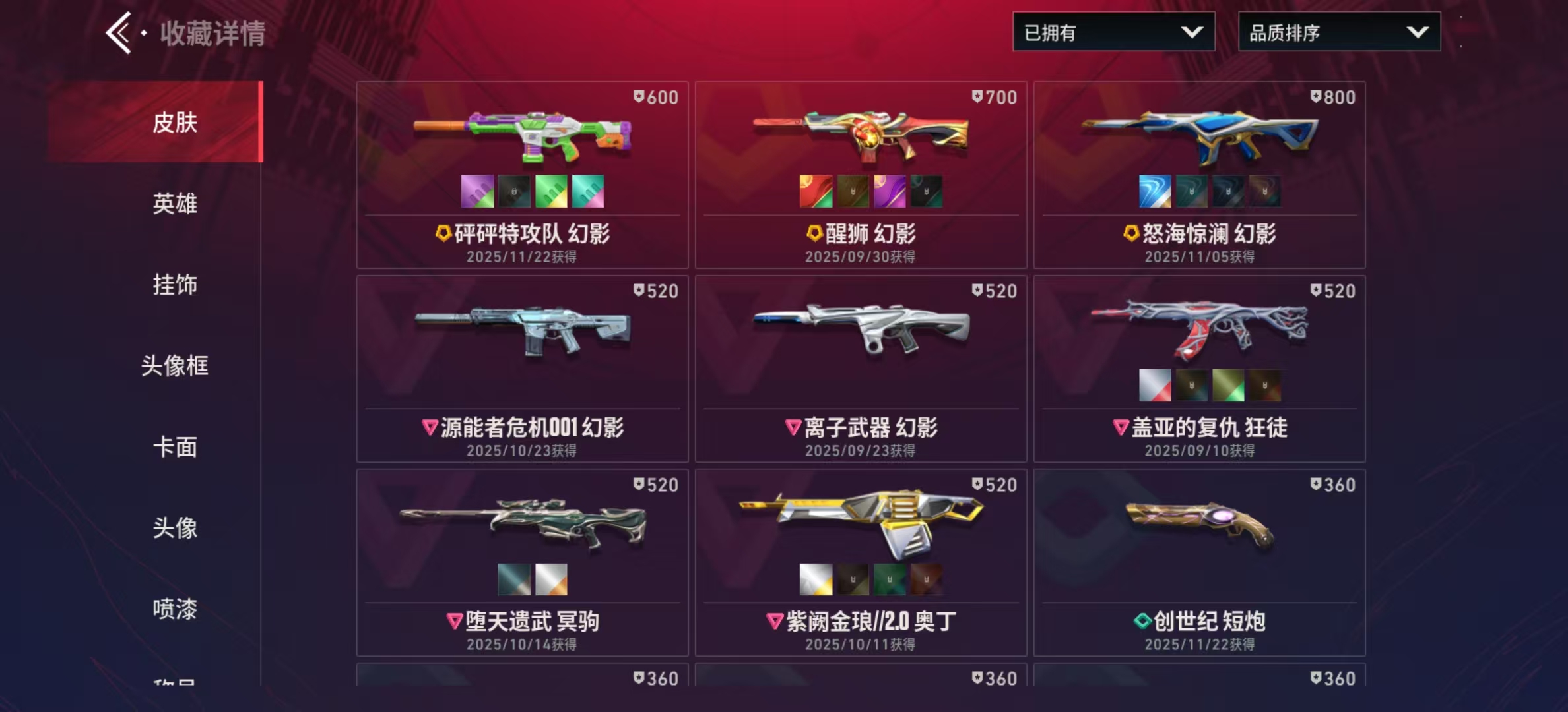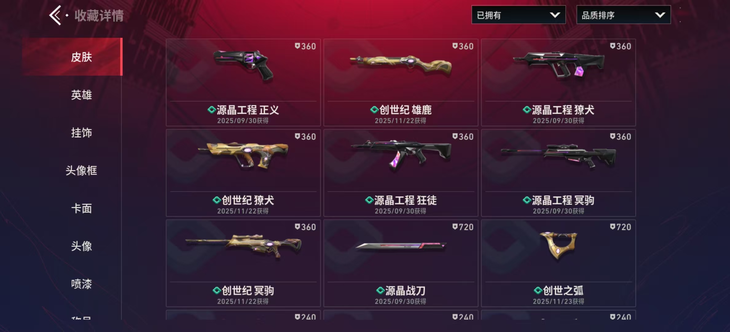 22级收藏终极砰砰特攻队幻影、醒狮幻影、怒海惊澜幻影、源能者危机001幻影、离子武器幻影、盖亚的复仇狂徒、堕天遗武冥驹、紫阙金琅2.0奥丁、创世纪短炮、源晶工程正义、创世纪雄鹿、源晶工程獠犬、创世纪獠犬、源晶工程狂徒、源晶工程冥驹、创世纪冥驹、源晶战刀、创世之弧、创世纪冥驹、源晶战刀、创世之弧