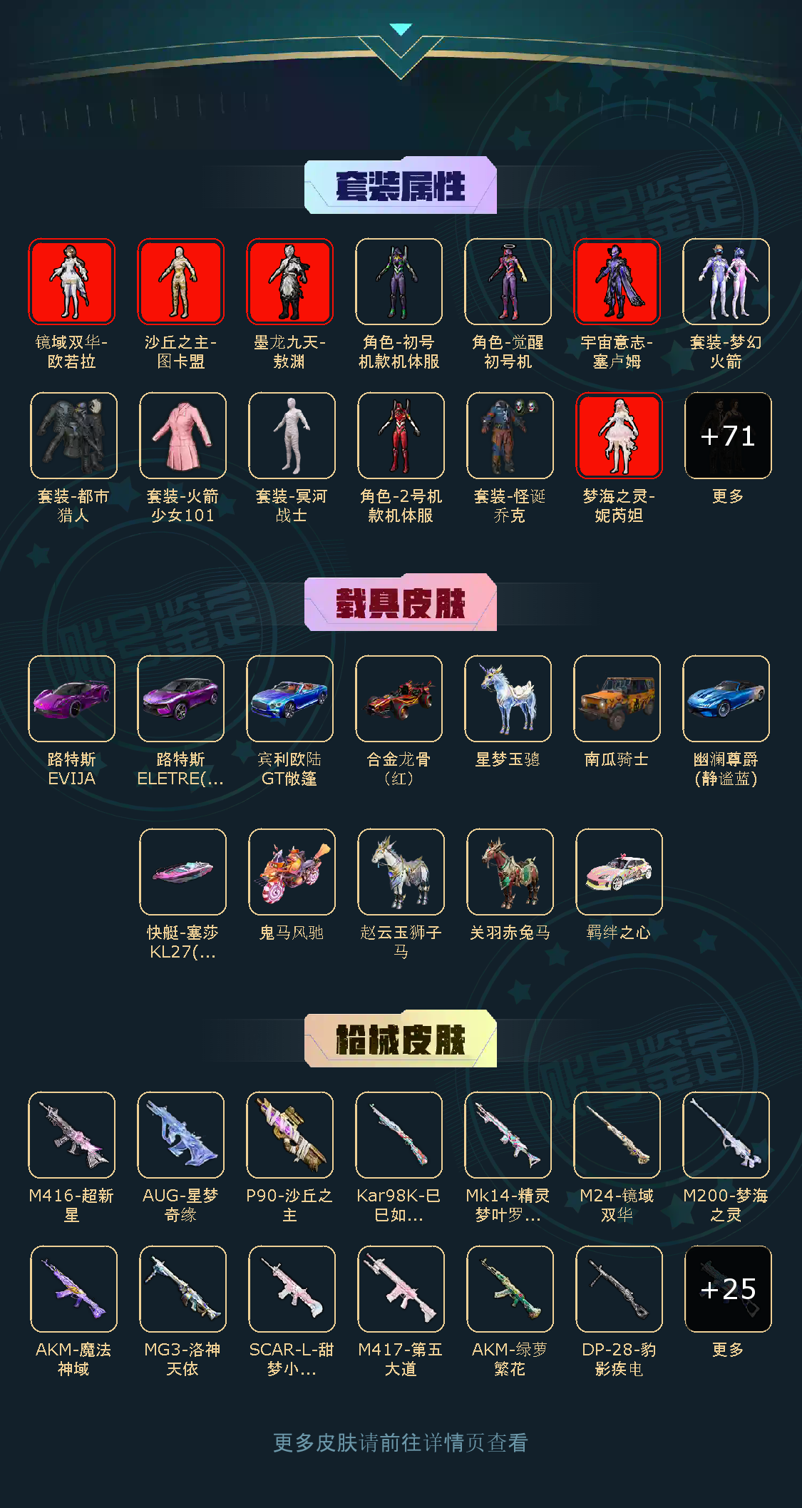 78粉,12载具,320套装,14王牌印记,无敌战神历史最高段,211055热力值 平底锅-林间仙鹿/Famas-初号机 觉醒Ver./AKM-盖世英雄/AUG-星梦奇缘/AKM-绿萝繁花/M416-风花雪月/AUG-星之彼岸/SCAR-L-甜梦小狐/GROZA-巴啦啦小魔仙/M762-激战未来/GROZA-香水柠檬/Famas-觉醒初号机/M416-心之恋语/AKM-魔法神域/M416-墨龙九天/M416-超新星/AKM-梦之光华/M417-第五大道/Mk14-精灵梦叶罗丽/Mk14-闲梦青缨/DP-28-圣堂之誓/MG3-洛神天依/DP-28-豹影疾电/UZI-绮梦青鸾/汤姆逊-怪笑疯兔/P90-甜蜜草莓/UMP45-宇宙意志/Vector-环太平洋/UMP45-雪国精灵/UMP45-恐龙拽拽/P90-沙丘之主/破片手榴弹-秋玉花灯/爆炸猎弓-拳皇·狂花道/烟雾弹-猫咪绅士/破片手榴弹-粉粉猫爪/Kar98K-巳巳如意/M24-镜域双华/AMR-炫光之旅/M200-梦海之灵/宾利欧陆GT敞篷(深空蓝)/路特斯ELETRE(电光紫)/南瓜骑士/鬼马风驰/快艇-塞莎KL27(霓虹粉)/合金龙骨(红)/羁绊之心/路特斯EVIJA(电光紫)/幽澜尊爵(静谧蓝)/星梦玉骢/关羽赤兔马/赵云玉狮子马/照夜玉狮子/