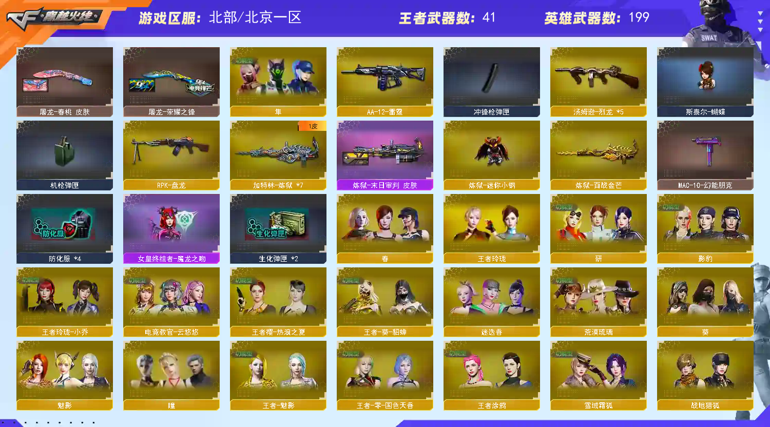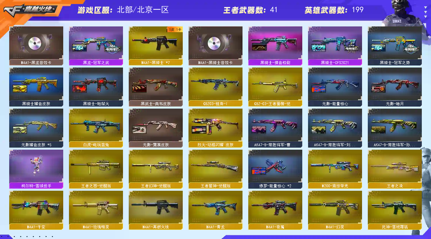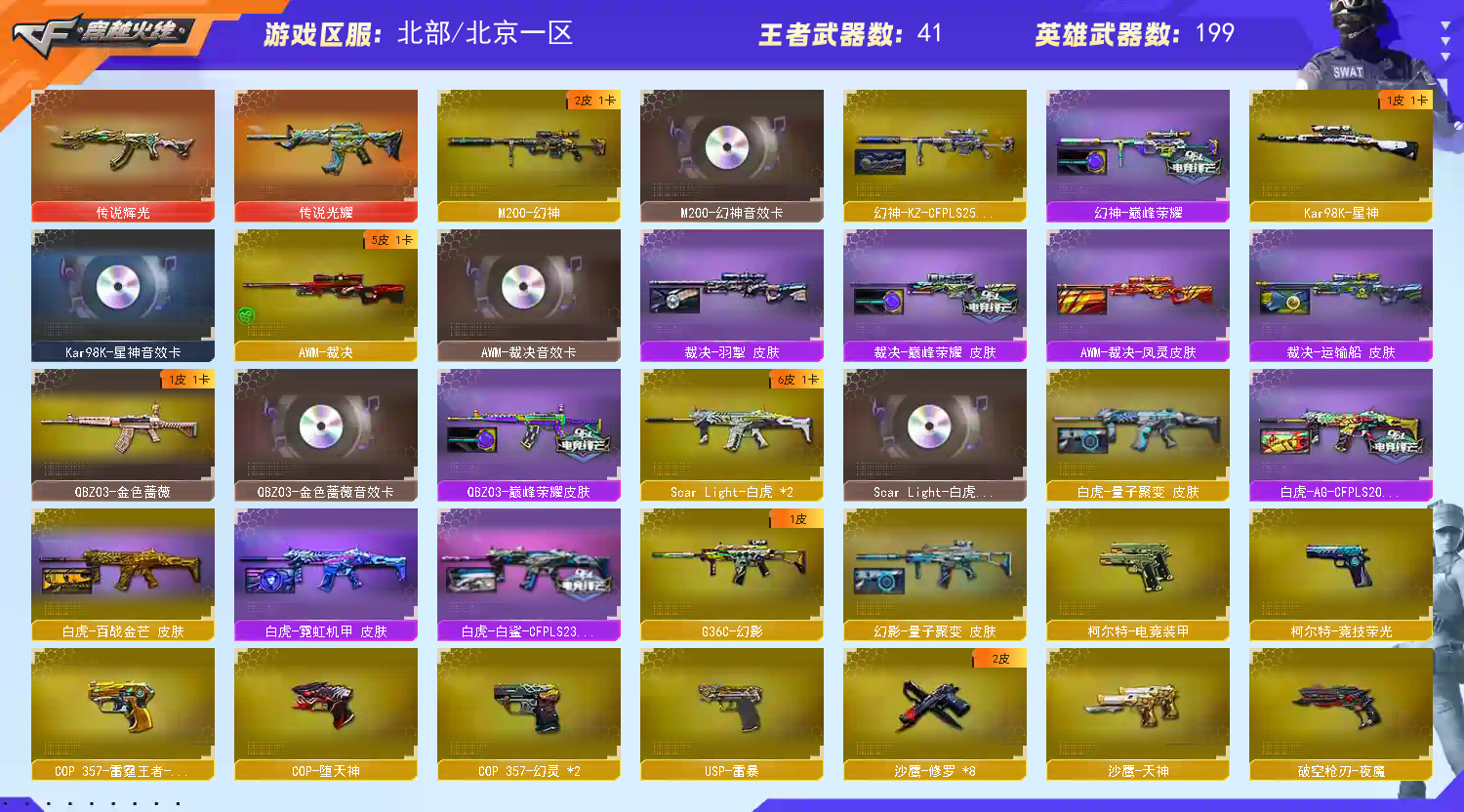 步枪:传说辉光(7k保底出的打人巨痛) 传说光耀 千变 雷神✘2 火麒麟✘2 黑龙 黑武士 qbz03 黑骑士✘7 无影 死神 天启 超新星 机械迷城 黑鲨 龙血 ak雷暴 m4青龙 朱雀 白虎 夜魔 幻灵 玫瑰精灵 猎神 烈火✘4 王者之心 王者之影 王者之翼 王者之武 王者之魄 王者之戮 超新星-悦享 猩红传说ak 战神ak 网剧套装 电玩蓝图白虎。。。 黄金牛牛ak 金色小号 各种小人枪请看图