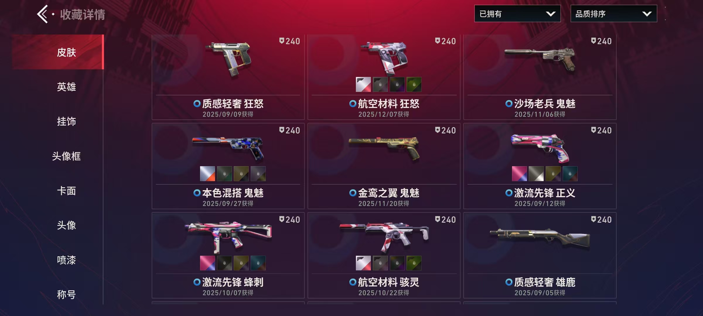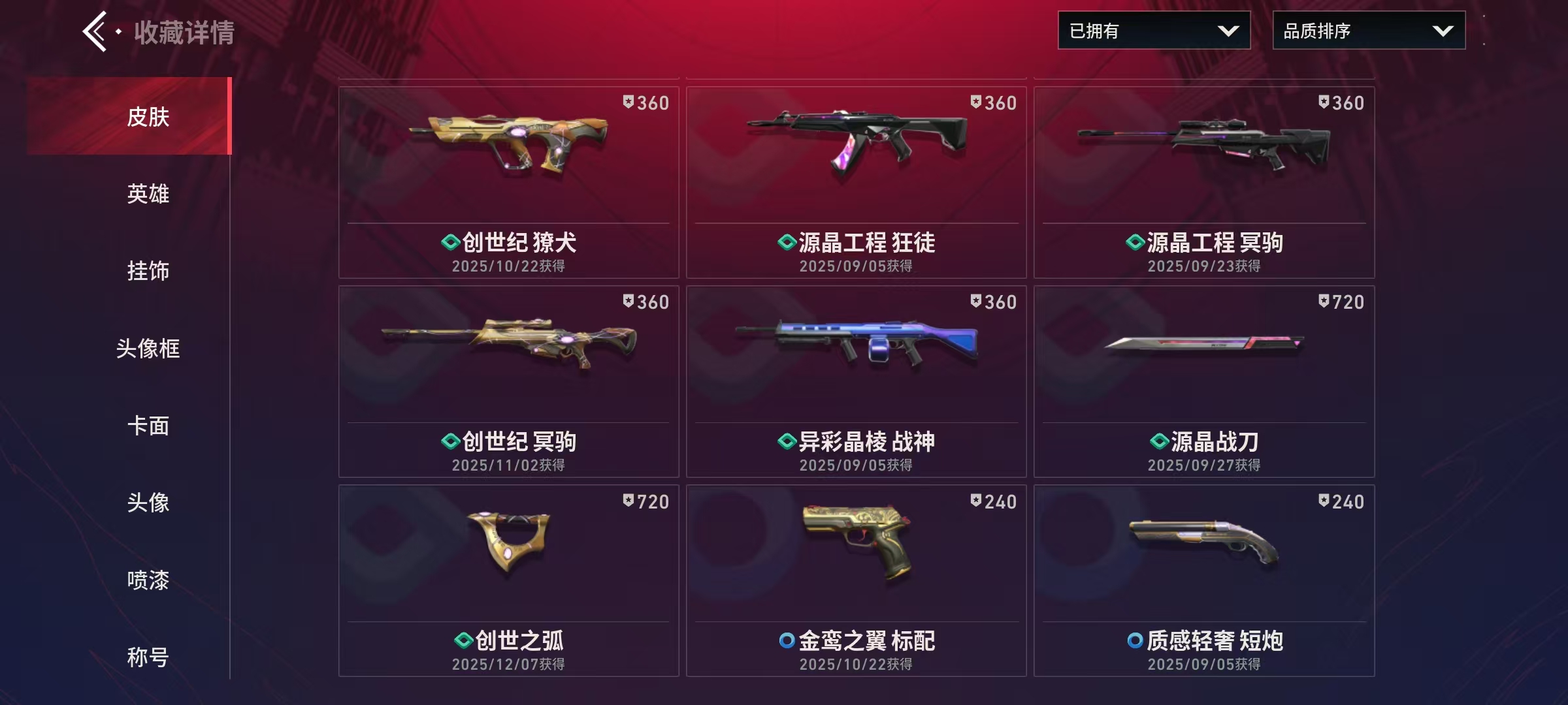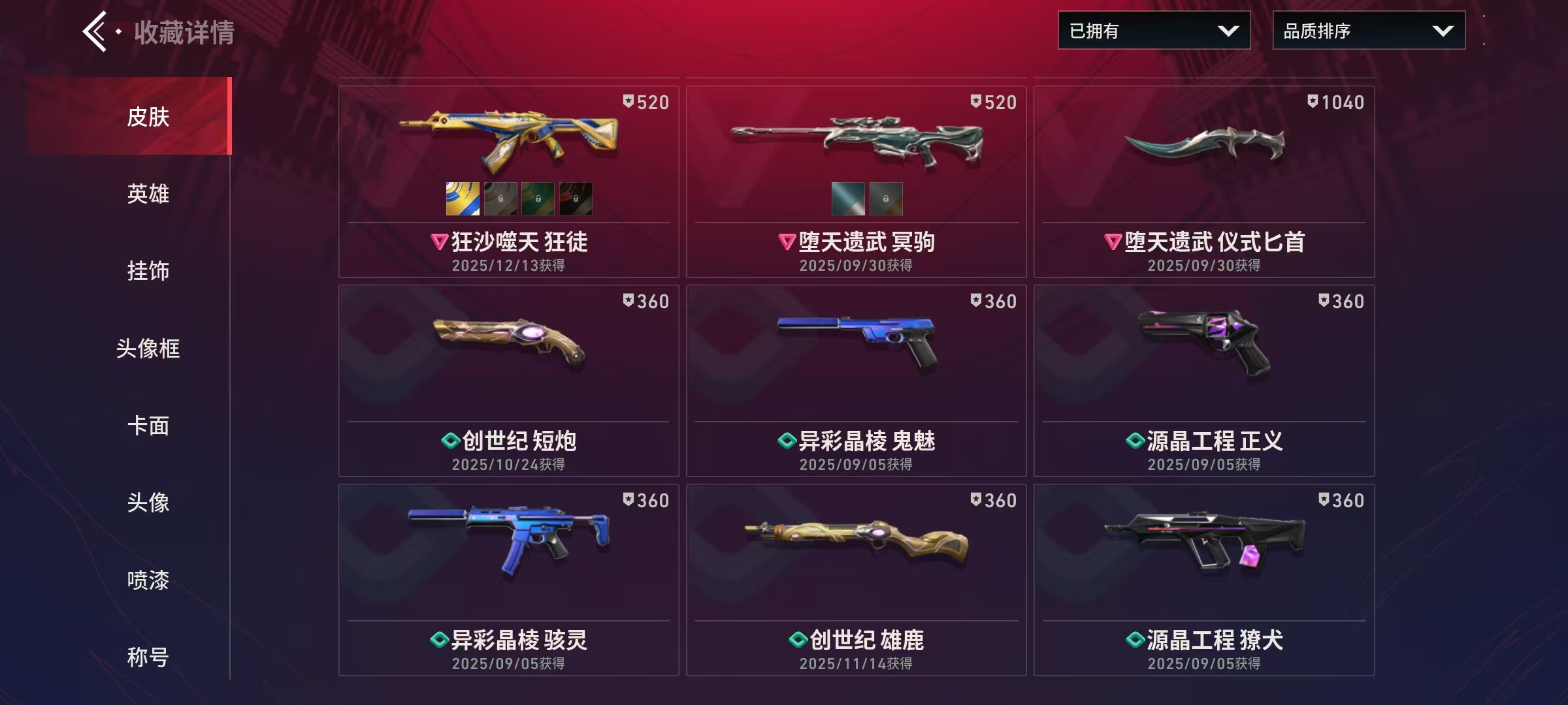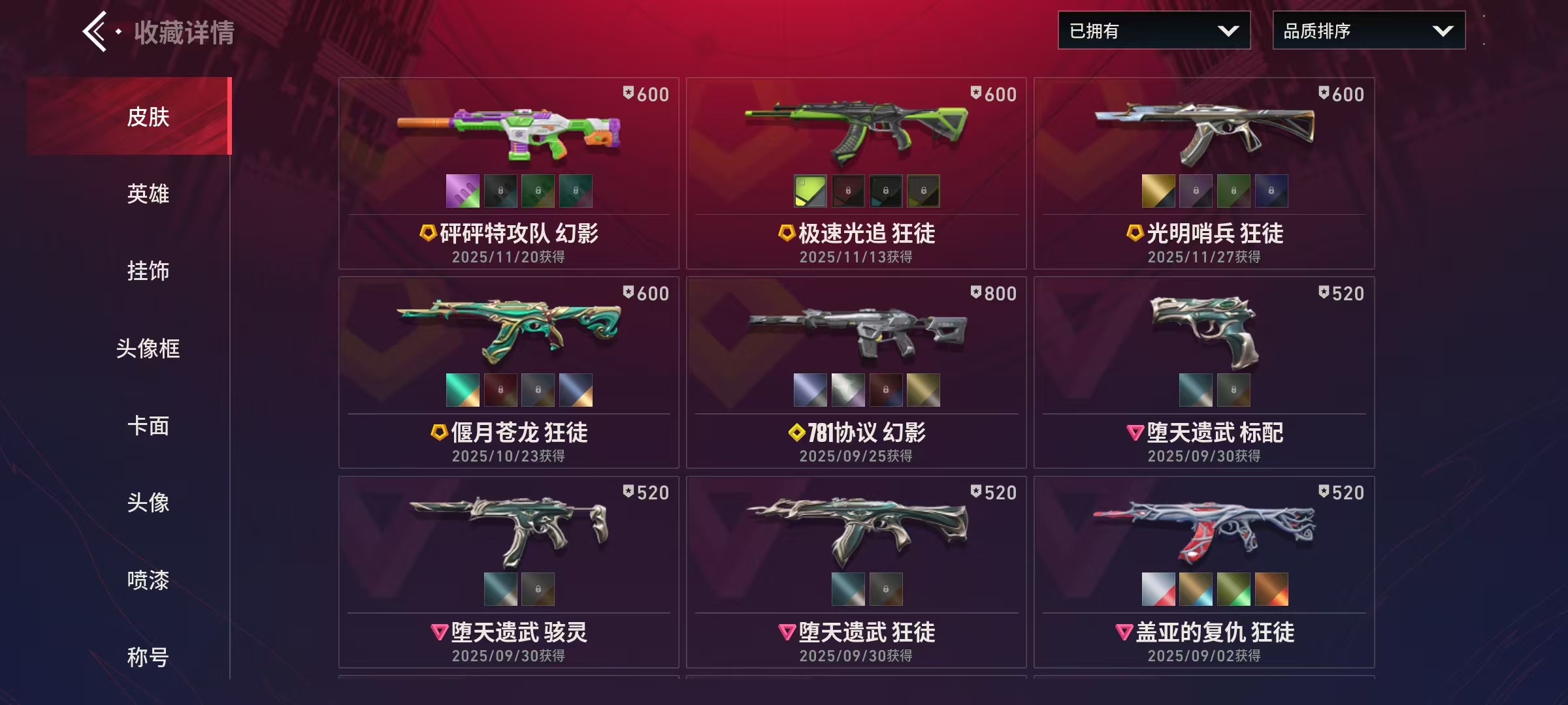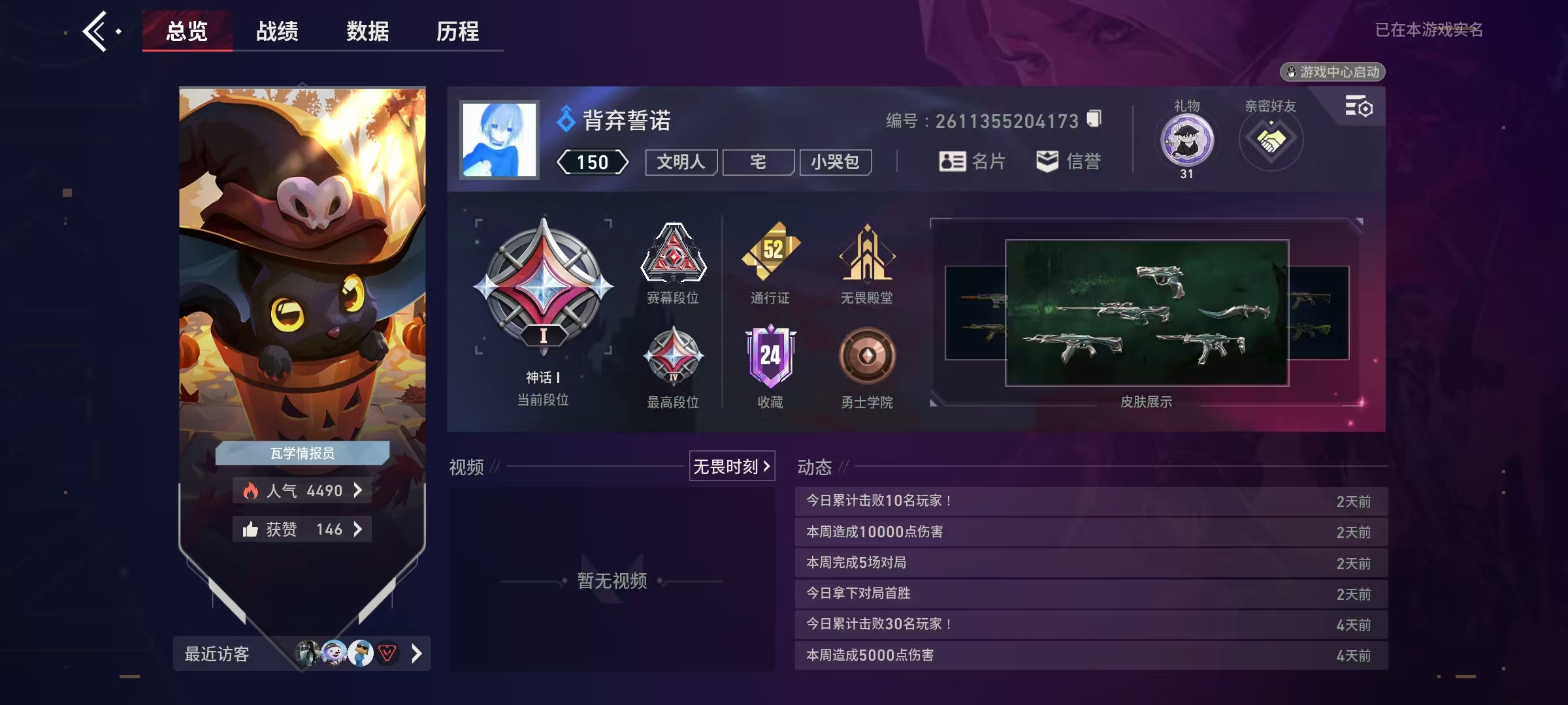 Lv150|神话I, 刀皮数量3,枪皮数量43(绝版0传奇4终极2卓越6);【刀皮】:近战武器-堕天遗武仪式匕首,近战武器-源晶战刀,近战武器-创世之弧; 【枪皮】:狂徒-极速光追,狂徒-光明哨兵,狂徒-狂沙噬天,幻影-砰砰特攻队,狂徒-偃月苍龙,幻影-781协议,狂徒-堕天遗武,狂徒-盖亚的复仇,冥驹-堕天遗武,标配-堕天遗武,骇灵-堕天遗武,狂徒-源晶工程,獠犬-创世纪,獠犬-源晶工程,冥驹-创世纪,冥驹-源晶工程,正义-源晶工程,鬼魅-异彩晶棱,短炮-创世纪,骇灵-异彩晶棱,雄鹿-创世纪,战神-异彩晶棱,幻影-航空材料,戍卫-本色混搭,戍卫-航空材料,飞将-时装,飞将-质感轻奢,正义-激流先锋,鬼魅-沙场老兵,鬼魅-本色混搭,鬼魅-金鸾之翼,标配-金鸾之翼,短炮-质感轻奢,狂怒-航空材料,狂怒-质感轻奢,骇灵-航空材料,蜂刺-激流先锋,判官-本色混搭,判官-金鸾之翼,雄鹿-质感轻奢,奥丁-神罚,战神-金鸾之翼,战神-本色混搭;【热门卡面】:火线卡面,KO对炼狱卡面,堆雪人卡面,势不可挡蝰蛇卡面,创世纪卡面,贤者之泪卡面,裂土之疆卡面,尚勃勒工牌卡面,休息时间幽影卡面,金鸾之翼卡面,万圣夜卡面,科迪亚钢铁卡面,堕天遗武卡面,无畏开拓者卡面;【热门挂饰】:终章燃烧垃圾箱挂饰,拍立得挂饰,欢乐之袜挂饰,海岛假日挂饰,糖果手杖挂饰,燃烧垃圾箱挂饰,双面黑猫挂饰,魔法小猫挂饰,恐怖蜥蜴挂饰,创世纪挂饰,堕天遗武挂饰;【热门喷漆】:倒计时开始喷漆,特雷弗明白了喷漆,调大音量喷漆,种草喷漆,金鸾之翼喷漆,禁止雄鹿喷漆,志愿者喷漆,拿走我的钱喷漆,夜露思苦喷漆,食腐鸟喷漆,甜糖麦芬喷漆,燃起来了喷漆,芮娜致意喷漆,这就太不行了喷漆,飞天扫帚小猫喷漆,堕天遗武喷漆,无畏开拓者喷漆;