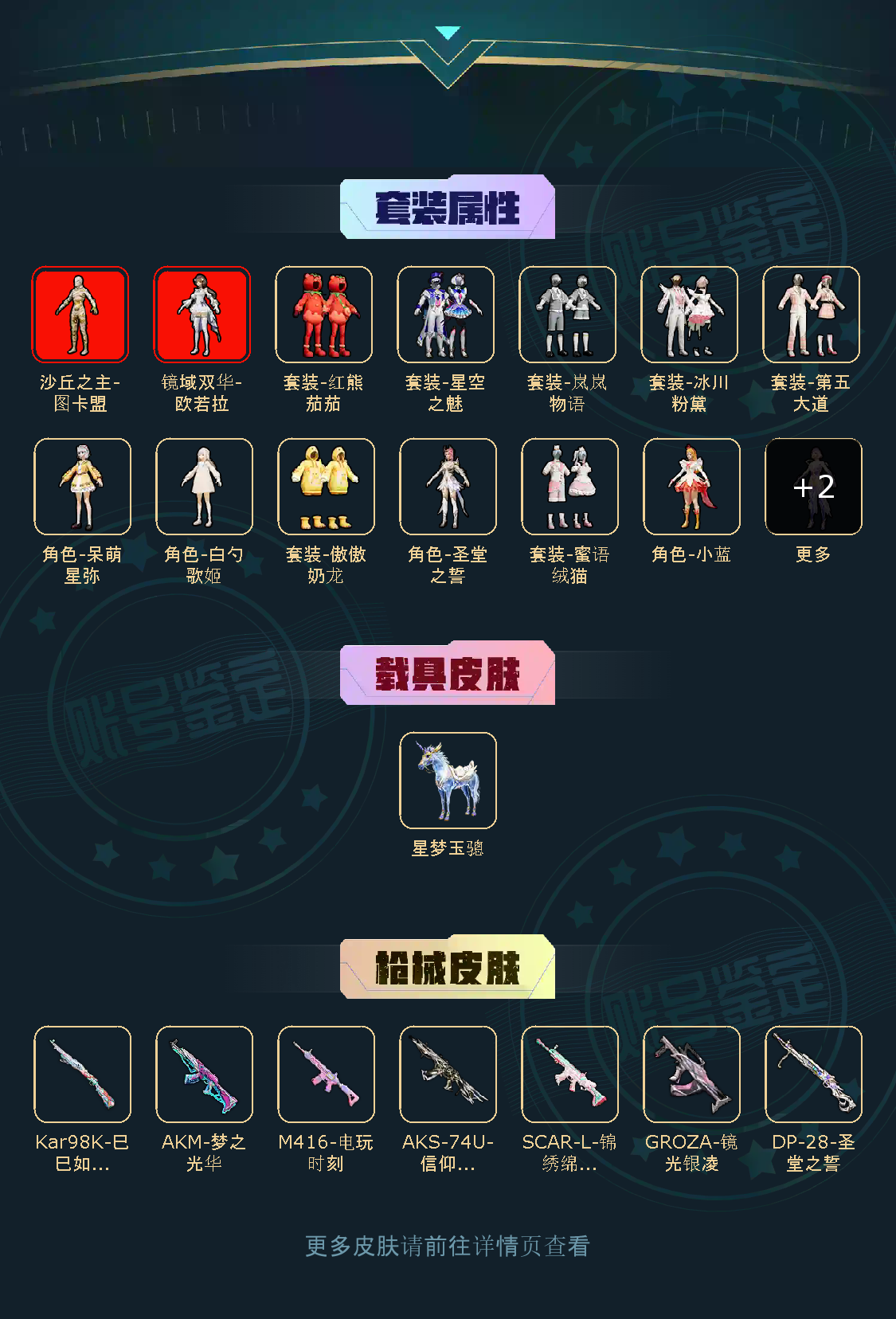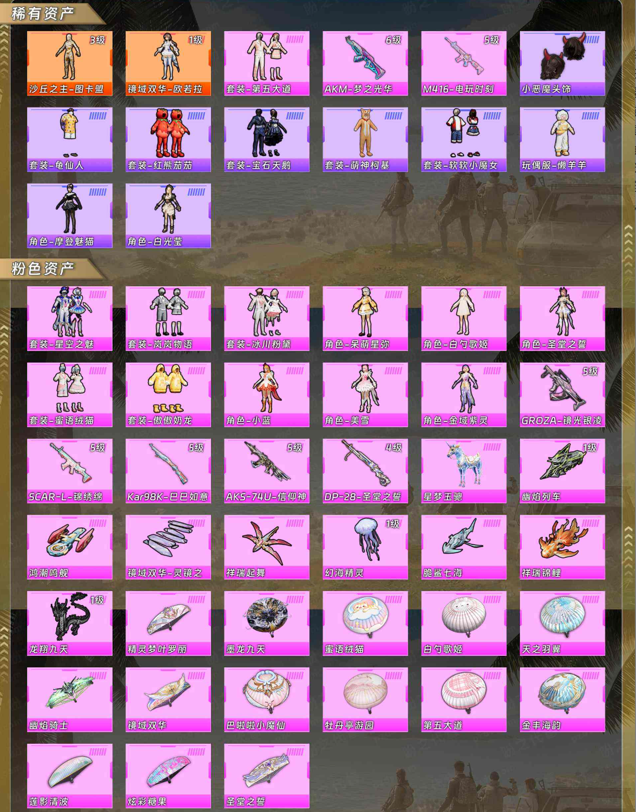 【稀有资产】沙丘之主-图卡盟[3级]/镜域双华-欧若拉[1级]/套装-第五大道/AKM-梦之光华/M416-电玩时刻/小恶魔头饰/套装-龟仙人/套装-红熊茄茄/套装-宝石天鹅/套装-萌神柯基/套装-软软小魔女/玩偶服-懒羊羊/角色-摩登魅猫/角色-白光莹