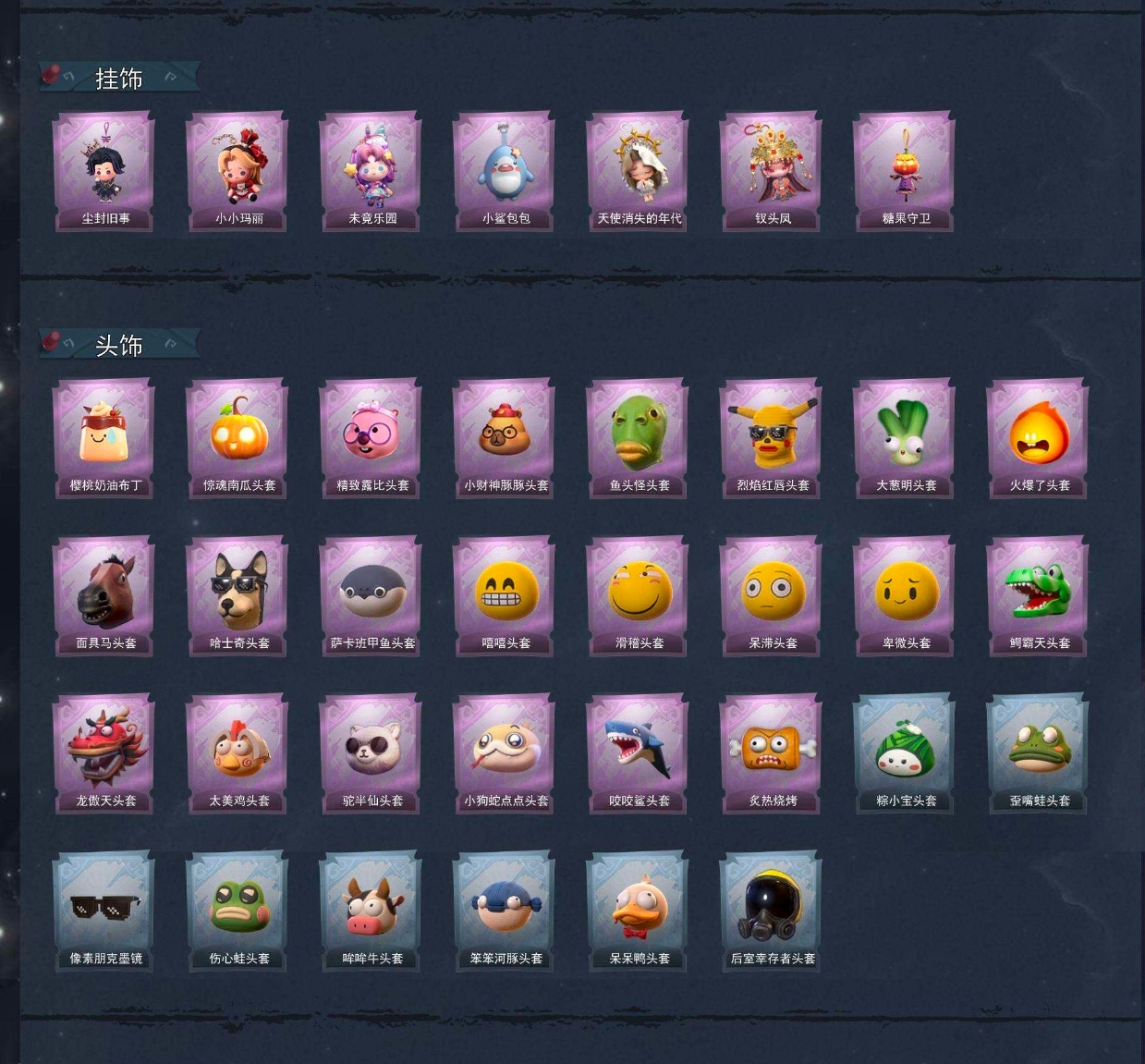 【头饰】樱桃奶油布丁、惊魂南瓜头套、精致露比头套、小财神豚豚头套、鱼头怪头套、烈焰红唇头套、大葱明头套、火爆了头套、面具马头套、哈士奇头套、萨卡班甲鱼头套、嘻嘻头套、滑稽头套、呆滞头套、卑微头套、鳄霸天头套、龙傲天头套、太美鸡头套、驼半仙头套、小狗蛇点点头套、咬咬鲨头套、炙热烧烤、粽小宝头套、歪嘴蛙头套、像素朋克墨镜、伤心蛙头套、哞哞牛头套、笨笨河豚头套、呆呆鸭头套、后室幸存者头套