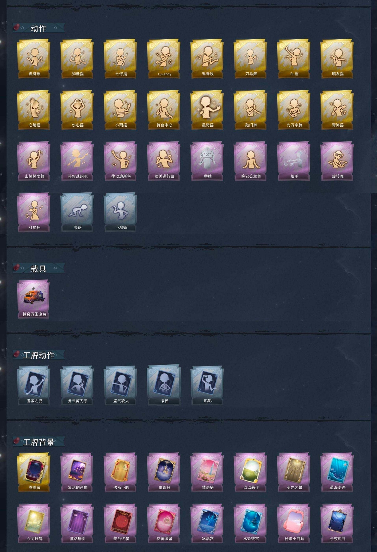 【动作】孤身摇、知世摇、七仔摇、luvaboy、鸳鸯戏、刀马舞、DL摇、鹏友摇、心跳摇、伤心摇、小雨摇、舞台中心、星奇摇、敲门舞、九万字舞、青海摇、山楂树之舞、带你逃跑吧、律动迪斯科、痞帅进行曲、举牌、晚安公主舞、抬手、旋转舞、KT猫摇、失落、小鸡舞