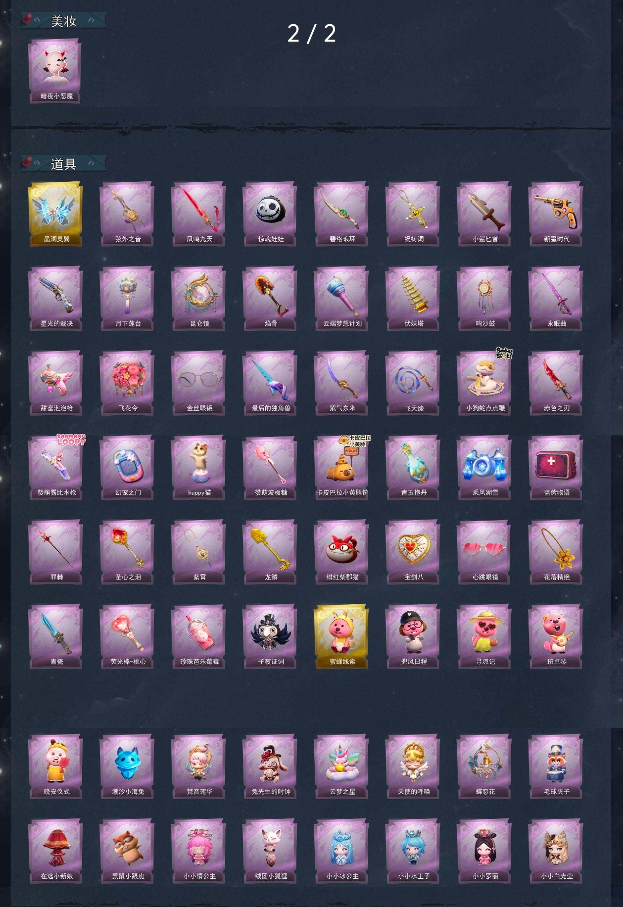 【道具皮肤】喷气背包-晶澜灵翼、除颤仪-弦外之音、桃木剑-凤鸣九天、腰包-惊魂娃娃、刺刀-碧络琅环、摸金符-祝祷词、刺刀-小鲨匕首、转轮手枪-新星时代、短管猎枪-星光的裁决、腰包-月下莲台、传送按钮-昆仑镜、铲子-焰骨、专业手电-云端梦想计划、葫芦-伏妖塔、音响-鸣沙鼓、桃木剑-永眠曲、电击枪-甜蜜泡泡枪、额外的背包-飞花令、夜视仪-金丝眼镜、桃木剑-最后的独角兽、刺刀-紫气东来、长鞭-飞天绫、长鞭-小狗蛇点点鞭、刺刀-赤色之刃、短管猎枪-赞萌露比水枪、传送按钮-幻宠之门、音响-happy猫、铲子-赞萌波板糖、铲子-卡皮巴拉小黄豚铲、黄牛能量饮料-青玉抱丹、喷气背包-乘风溯雪、急救包-蔷薇物语、铲子-圣心之泪、摸金符-紫霄、铲子-龙鳞、腰包-绯红柴郡猫、腰包-宝剑八、夜视仪-心跳眼镜、摸金符-花落精绝、刺刀-青瓷、黄牛能量饮料-珍珠芭乐莓莓、背饰-子夜证词、背饰-蜜蜂线索、背饰-兜风日程、背饰-寻凉记、背饰-班卓琴、背饰-晚安仪式、背饰-潮汐小海兔、背饰-梵音莲华、背饰-兔先生的时钟、背饰-云梦之星、背饰-天使的呼唤、背饰-蝶恋花、背饰-毛球夹子、背饰-在逃小新娘、背饰-鼠鼠小跟班