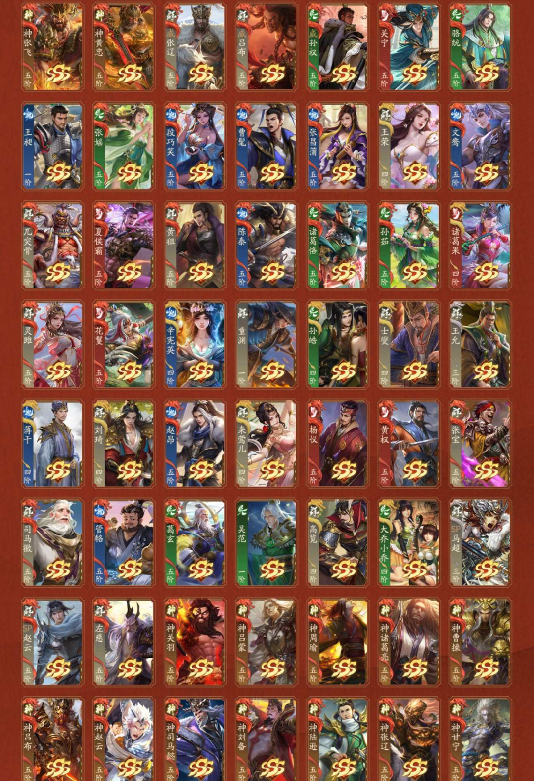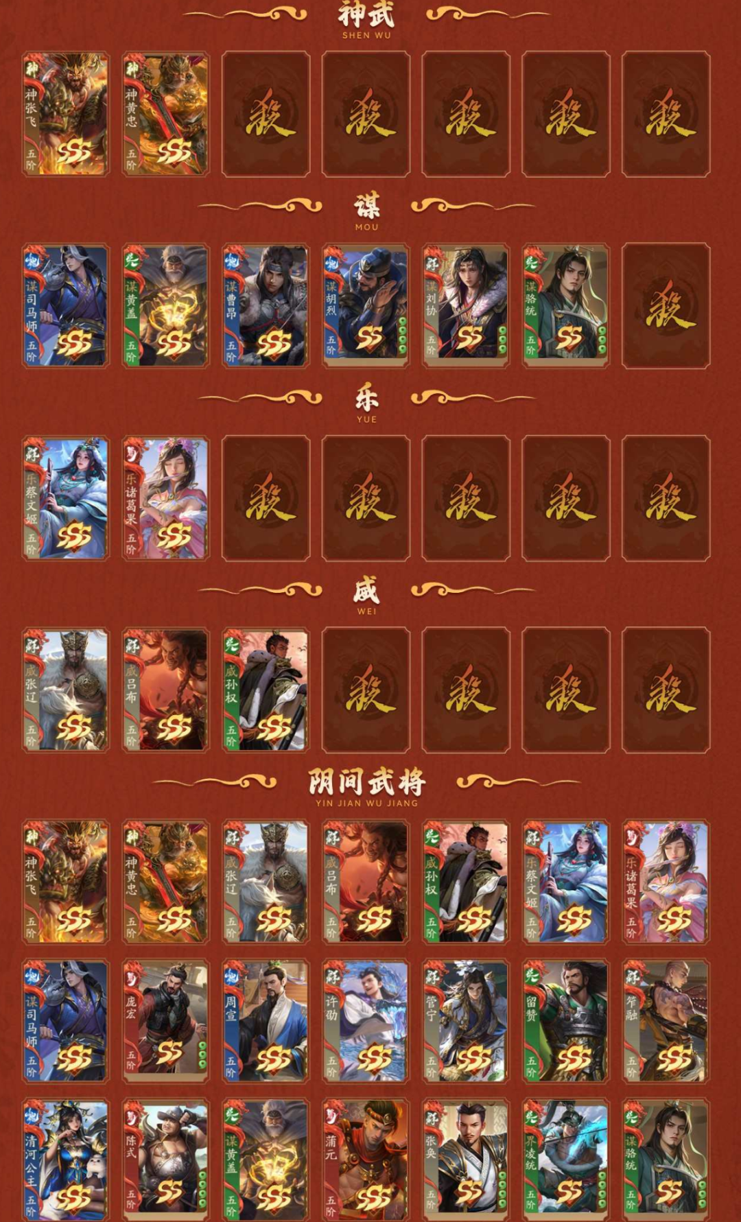 2神武,6谋,2乐,3威,21阴间,1星河,【阴间】:神张飞(静),神黄忠,威张辽,威吕布,威孙权,乐蔡文姬(静),乐诸葛果,谋司马师,庞宏,周宣,许劭(动),管宁(静),留赞,笮融,清河公主(静),陈式,谋黄盖,蒲元,张奂,界凌统,谋骆统;【神武】:神张飞(静),神黄忠;【谋】:谋司马师,谋黄盖,谋曹昂,谋胡烈,谋刘协,谋骆统;【乐】:乐蔡文姬(静),乐诸葛果;【威】:威张辽,威吕布,威孙权;【星河】:星董卓;【SSS】:神张飞(静),神黄忠,威张辽,威吕布,威孙权,关宁,骆统(静),王昶,张媱,段巧笑,曹髦,张昌蒲,王荣,文鸯,兀突骨,夏侯霸(静),黄祖,陈泰,诸葛恪,孙茹(静),诸葛果,灵雎(静),花鬘(静),辛宪英,童渊(静),孙皓,士燮,王允,蒋干,刘琦,赵昂,来莺儿,杨仪,黄权,张宝,司马徽,管辂,葛玄,吴范,高览,大乔小乔,SP马超,SP赵云(动),左慈(动),神关羽(动),神吕蒙,神周瑜(动),神诸葛亮,神曹操(静),神吕布,神赵云(动),神司马懿,神刘备(静),神陆逊,神张辽,神甘宁;【SS】:陈式,刘巴,李采薇,张让,陈珪,刘永,万年公主,华歆(静),胡遵,吕据