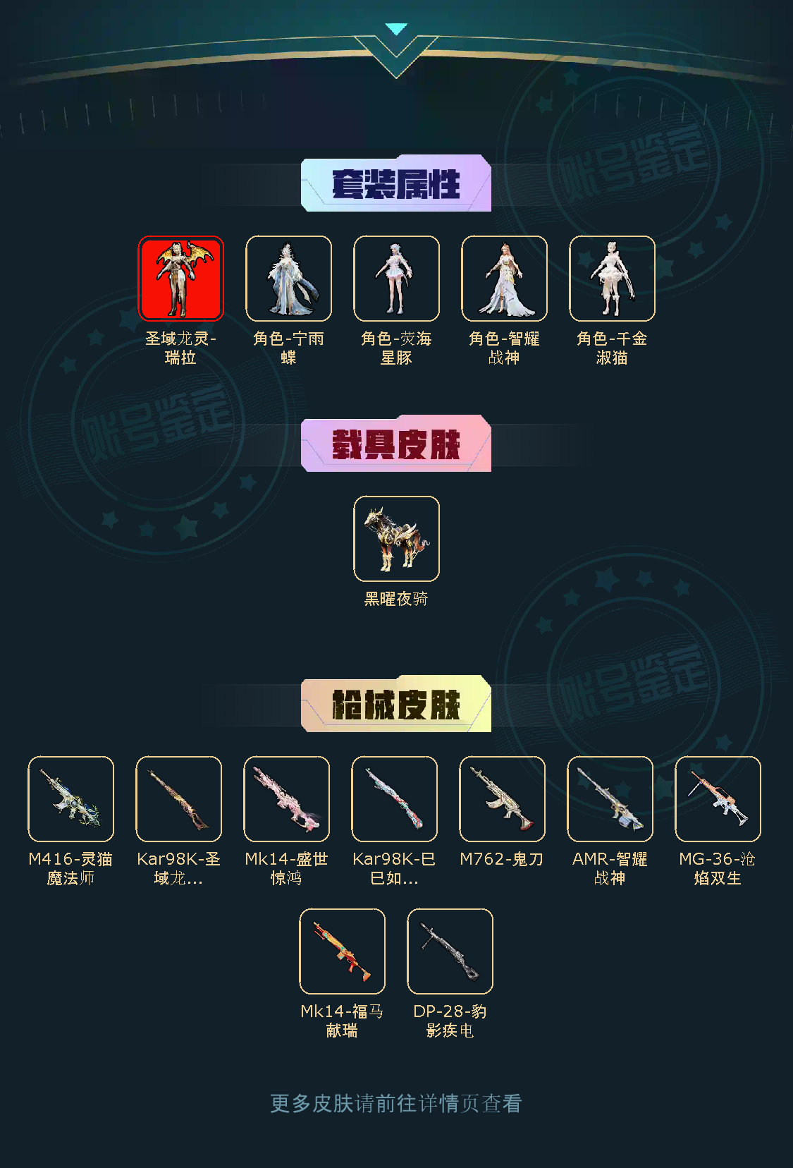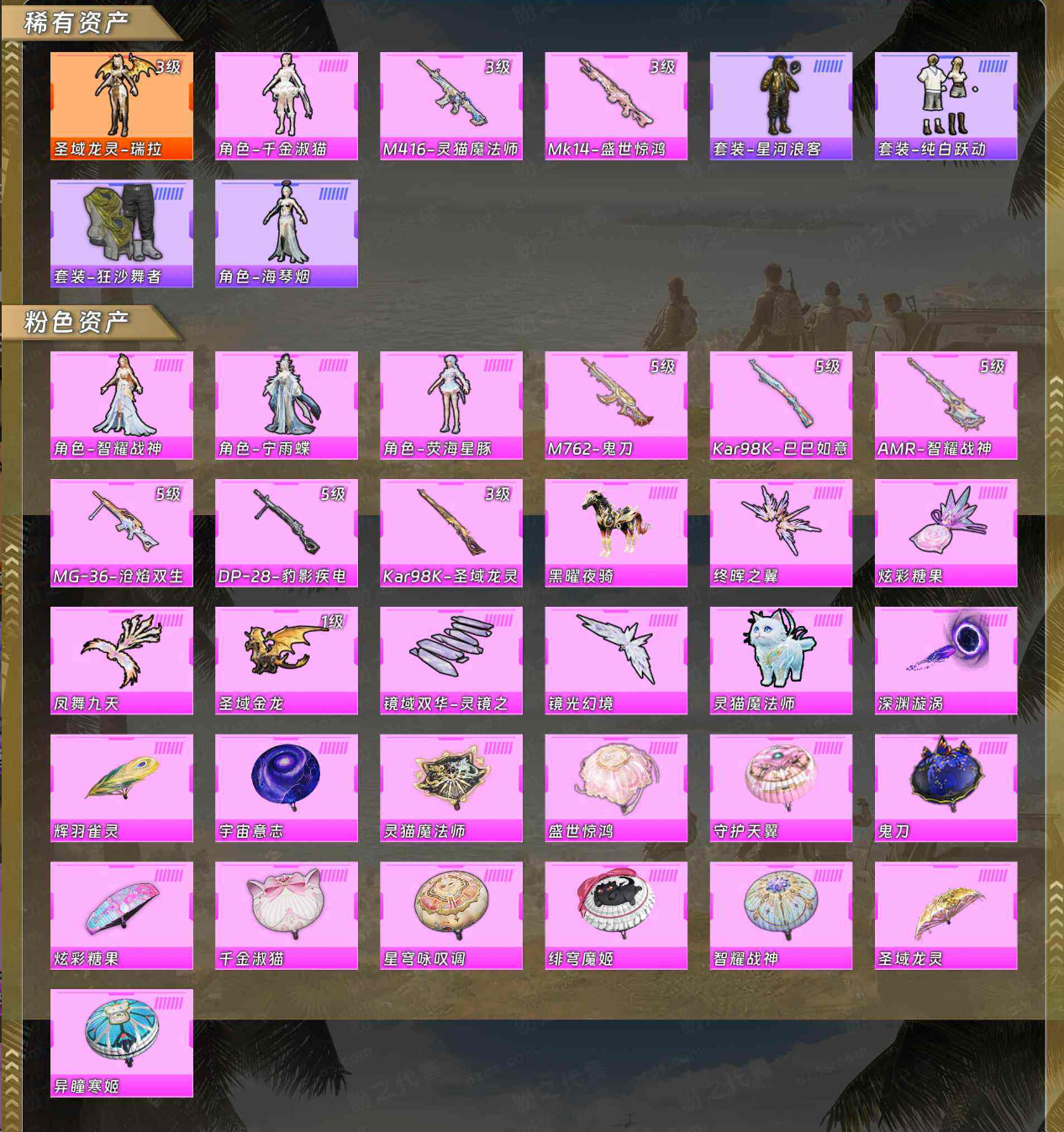 【稀有资产】圣域龙灵-瑞拉[3级]/角色-千金淑猫/M416-灵猫魔法师/Mk14-盛世惊鸿/套装-星河浪客/套装-纯白跃动/套装-狂沙舞者/角色-海琴烟