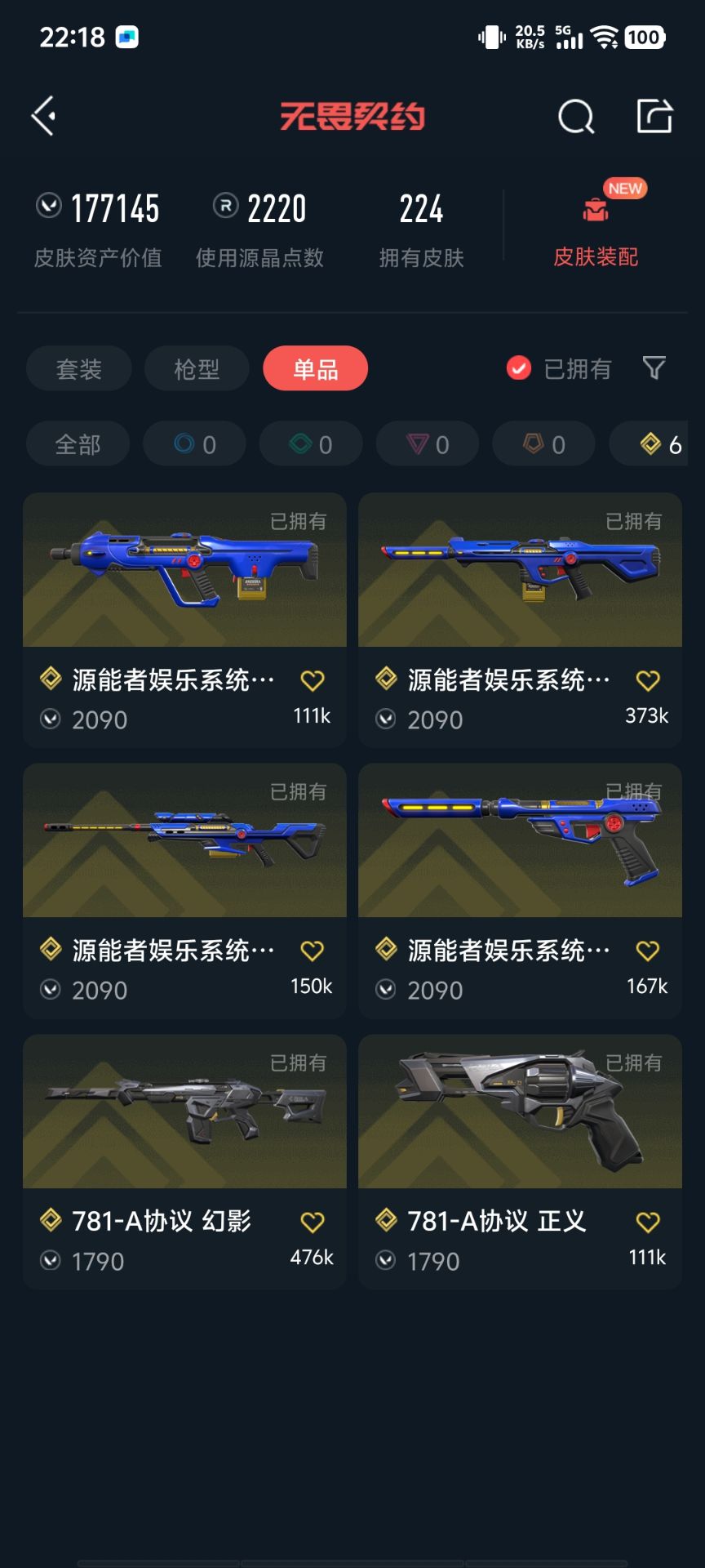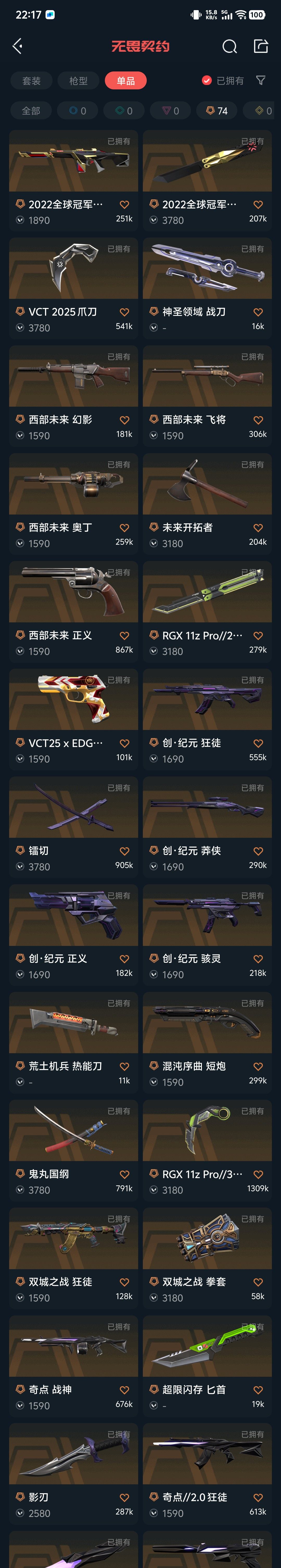【拥有手枪】西部未来-正义,VCT25-x-EDG-标配,VCT-x-EDG-标配,双城之战-正义,VCT-x-NRG-标配,VCT-x-PRX-标配,VCT-x-LEV-标配,混沌序曲-短炮,781-A协议-正义,天界神兵-鬼魅,离子武器-正义,神圣领域-狂怒,荒土机兵-标配,超限闪存-正义,流星兵团-鬼魅,珍珠棘贝-狂怒,钢轨卫士-狂怒,钢轨卫士-短炮,沙尘幻旅-正义,弧光异彩-短炮,合金战车-正义,超能冲撞-标配,月球哨兵-正义,纳米-正义,逆冲蛮牛-狂怒,模拟赫兹-鬼魅,浮光跃金-标配,聚合之力-狂怒,采蜜小蜂队-鬼魅,纤云弄巧-正义,战术熊与伙伴们-狂怒,纤云弄巧-短炮,战术熊与伙伴们-标配,深海水族-短炮,复古浪潮-正义,光导纤维-鬼魅,天才少女-短炮,光导纤维-标配,萌彩剪影-狂怒,胡桃狂想-鬼魅,宿怨-鬼魅,信手涂鸦-鬼魅,彩梦之城-标配,数码咒术-鬼魅,花漾粉红-狂怒,