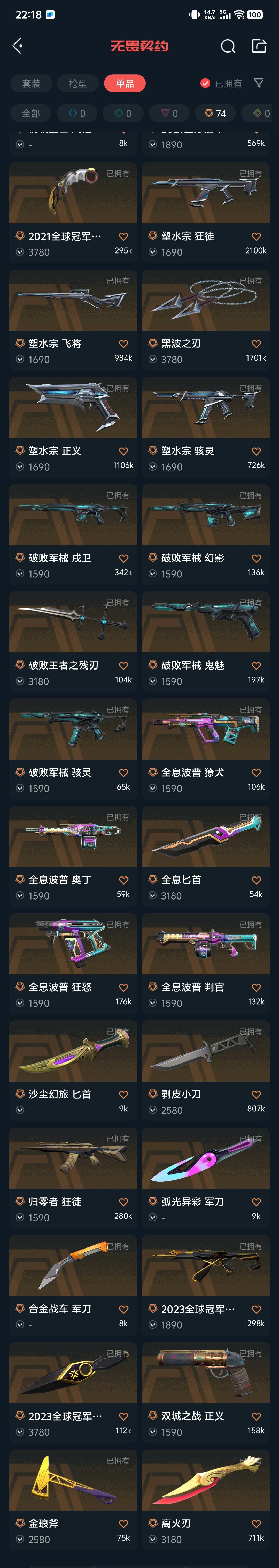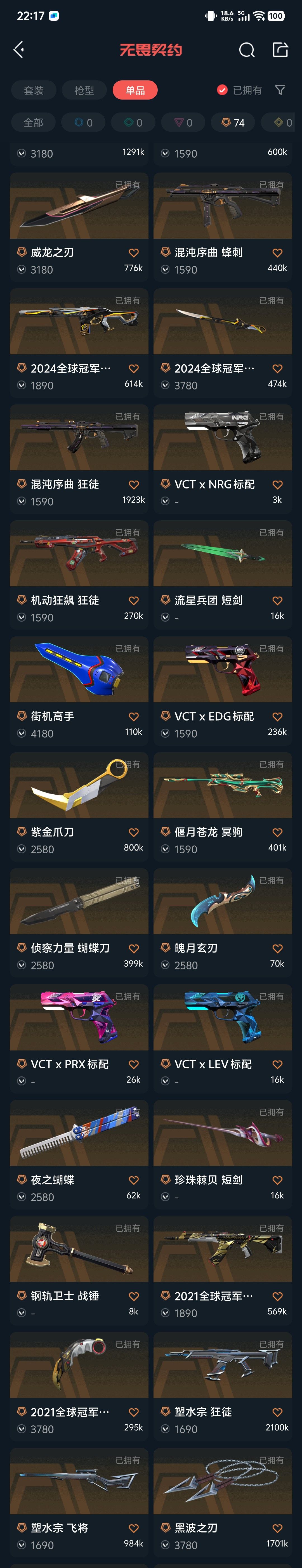 【拥有套装】创纪元套装(创·纪元-狂徒,创·纪元-莽侠,创·纪元-骇灵,创·纪元-正义,镭切)双城之战套装(双城之战-狂徒,双城之战-拳套)破败军械套装(破败军械-幻影,破败军械-戍卫,破败军械-骇灵,破败军械-鬼魅,破败王者之残刃)塑水宗套装(塑水宗-骇灵,塑水宗-狂徒,塑水宗-飞将,塑水宗-正义,黑波之刃)全息波普套装(全息波普-獠犬,全息波普-奥丁,全息波普-判官,全息波普-狂怒,全息匕首)奇点2.0套装(奇点//2.0-狂徒,奇点//2.0-鬼魅,奇点//2.0-蝴蝶刀)2024全球冠军赛套装(2024全球冠军赛-幻影,2024全球冠军赛-战刀)2023全球冠军赛套装(2023全球冠军赛-狂徒,2023全球冠军赛-苦无)2021全球冠军赛套装(2021全球冠军赛-狂徒,2021全球冠军赛-爪刀)紫阙金琅套装(紫阙金琅-戍卫,紫阙金琅-狂徒,紫阙金琅-骇灵,紫阙金琅-标配,金琅斧)掠影套装(掠影-狂徒,掠影-冥驹,掠影-戍卫,掠影-正义,影刃)