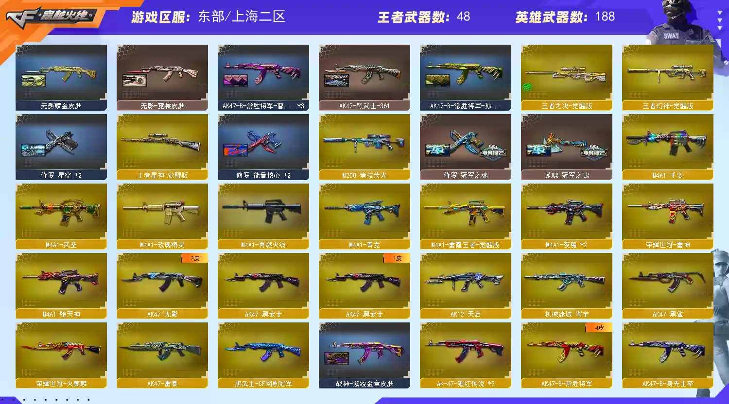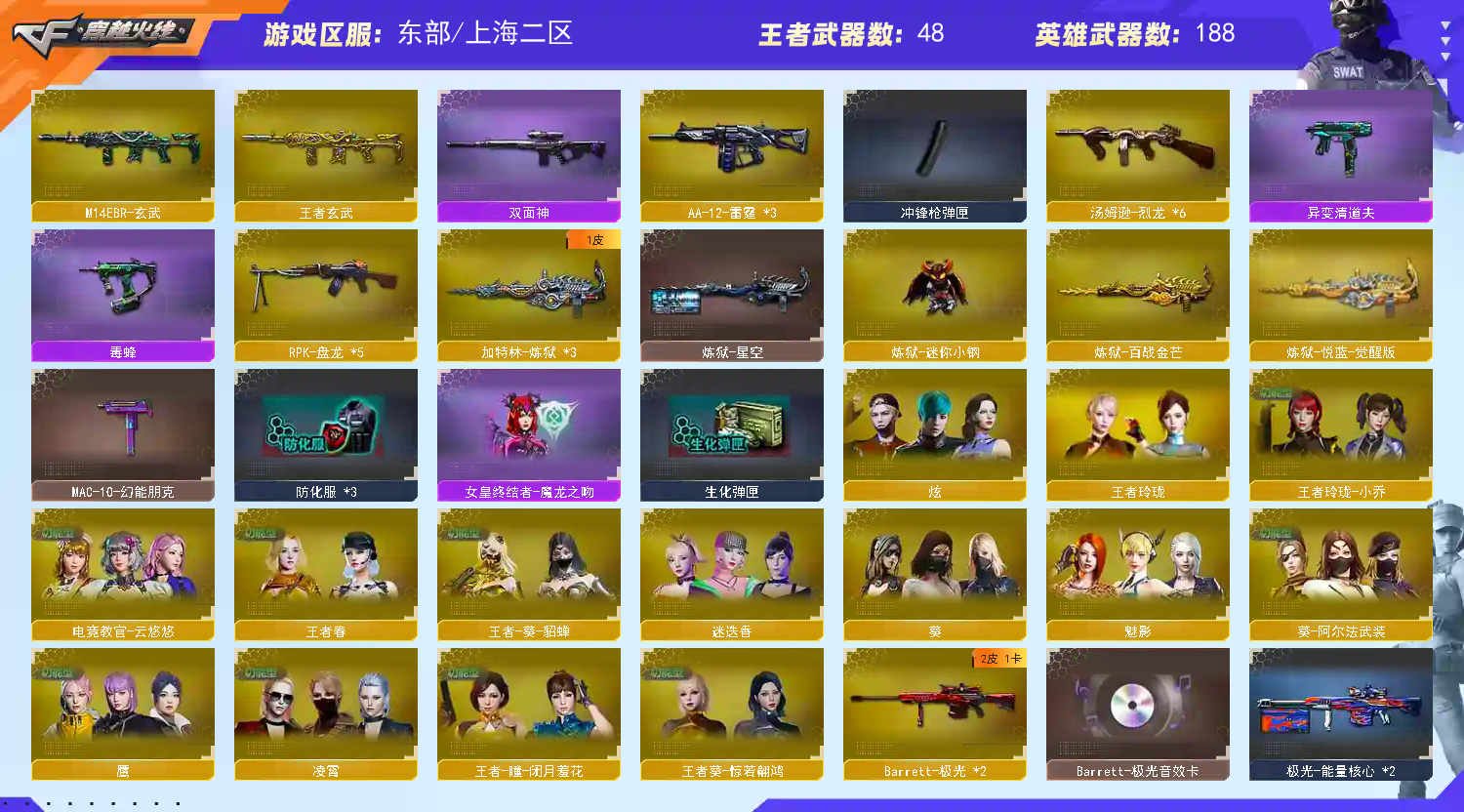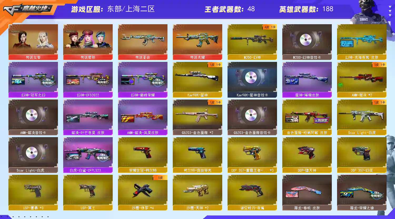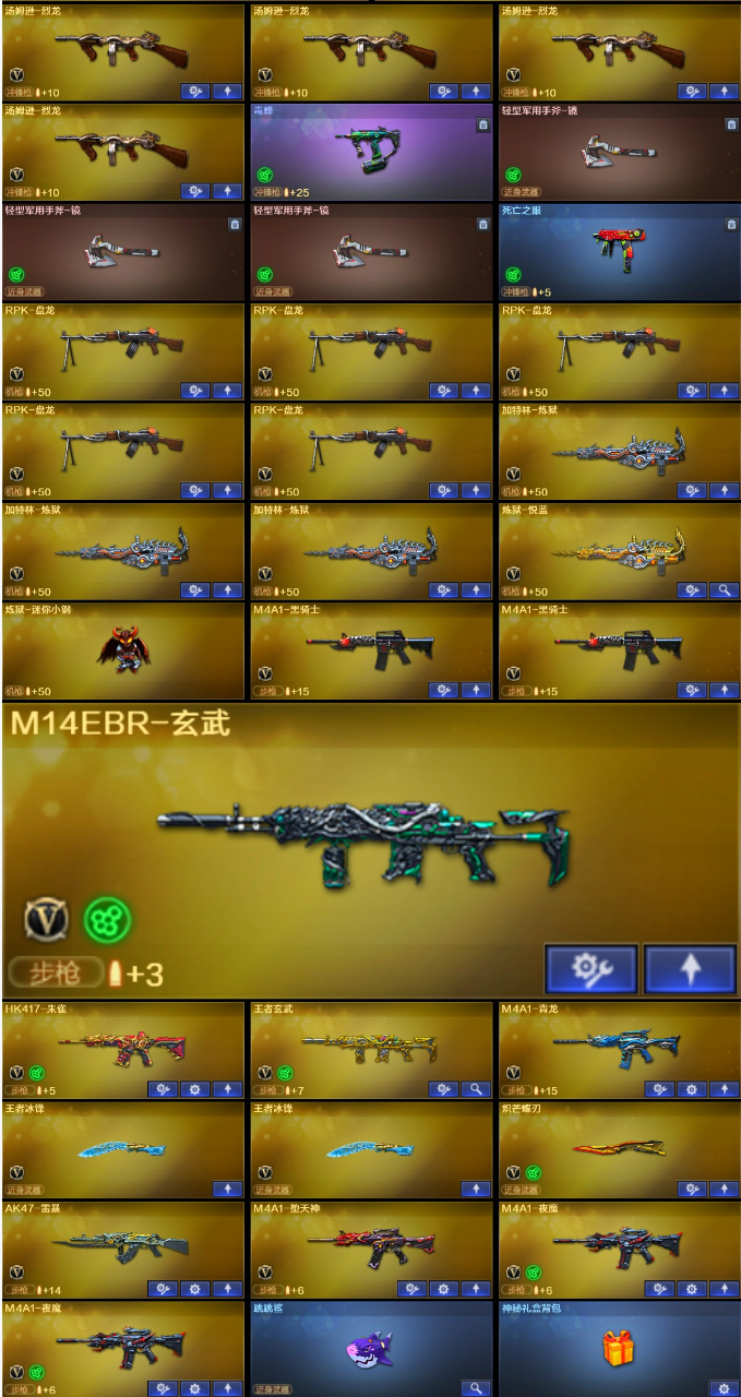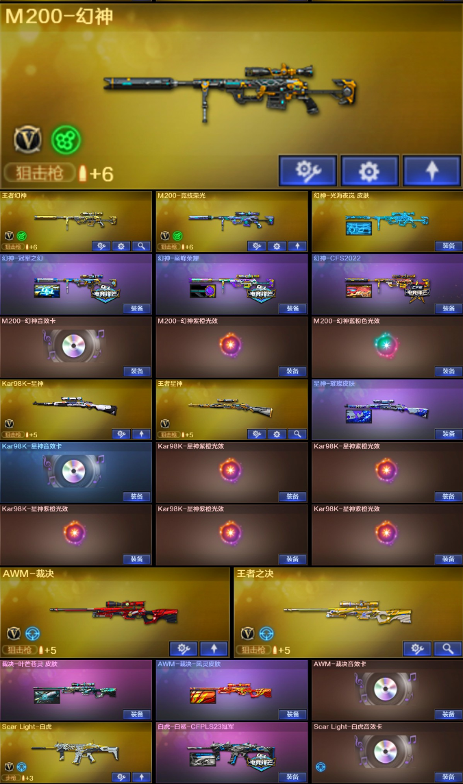 【稀有武器】:传说光耀/M200-幻神/Kar98K-星神/ScarLight-白虎/M14EBR-玄武/M4A1-青龙/HK417-朱雀/QBZ03-天罚/M4A1-夜魔(2)/AK47-雷暴/M4A1-堕天神/USP-雷暴(3)/COP-堕天神/破空枪刃-夜魔/COP357-幻灵/柯尔特-竞技荣光/荣耀世冠-柯尔特/COP357-雷霆王者-觉醒版(3)/QBZ03-金色蔷薇(2)/AK47-火麒麟(4)/M4A1-黑龙(2)/M4A1-雷神(2)/M4A1-黑骑士(2)/AK47-无影/AK47-黑武士/荣耀世冠-火麒麟/荣耀世冠-雷神/Barrett-毁灭(2)/Barrett-极光(2)/AWM-裁决(2)/M200-竞技荣光/RPK-盘龙(5)/加特林-炼狱(3)/汤姆逊-烈龙(6)/AA-12-雷霆(3)/炽芒蝶刃/斩神刀-雷暴/麒麟刺-堕天神/龙啸-堕天神(2)/马来剑-夜魔/幻灵之锋/擎天-竞技荣光