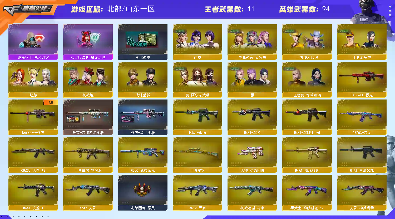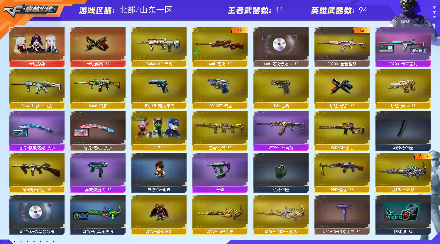 【6烈龙】【毒蜂】【MK5-炽火炎龙】【异变清道夫】【斯泰尔-蝴蝶】【6盘龙】【炼狱-迷你小钢】【云龙套装X1套】【竞技荣光套装X2套】【传说影煞】【传说幽冥】【M200-竞技荣光】【王者星霆】【AWM-裁决】【AWM-裁决音效卡】【Scar Light-白虎】【王者白虎-觉醒版】【QBZ03-金色蔷薇】【QBZ03-传奇宠儿】【QBZ03-云龙】【QBZ03-天罚】【FAMAS G2-天戎】【G36C-幻影】【王者玄武】【USP-雷暴】【柯尔特-竞技荣光】【COP 357-云龙】【炽芒蝶刃】【炼狱-迷你小钢】【加特林-炼狱】【RPK-盘龙】【炼狱-悦蓝-觉醒版】【炼狱-百战金芒】【汤姆逊-烈龙】【烈龙-云海游龙】【斯泰尔-蝴蝶】【MK5-炽火炎龙】【毒蜂】【异变清道夫】【传说影煞】【电竞教官-云悠悠】【机械姬】【奇洋探员】【乔伊教练】【蛇隐宗】【王者葵-惊若翩鸿】【王者潘多拉】【王者沙漠玫瑰】【修道士】【鹰】【雨墨】【云海玲珑】【隼】【魅影】【M4A1-雷神】【火麒麟-CFSTAR】【M4A1-黑骑士】【M4A1-黑龙】【Barrett-毁灭】【毁灭-云海游龙皮肤】