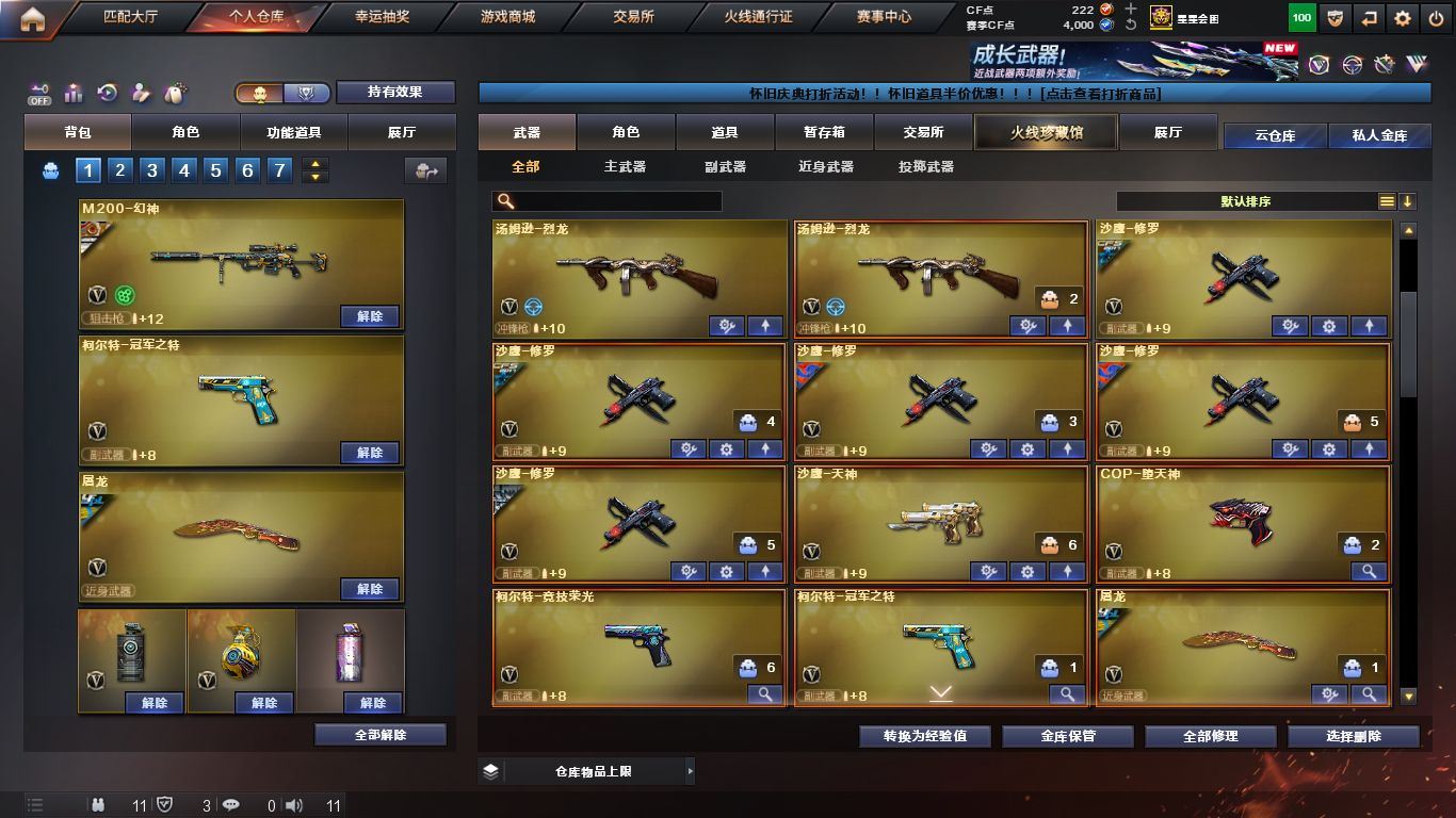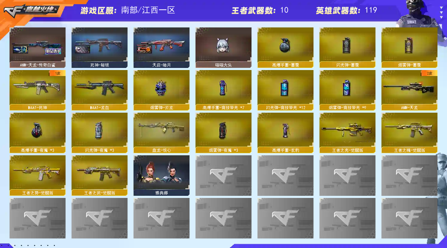 【M200-幻神+M200-竞技荣光+幻神-电流骇客皮肤+幻神-AG-CFPL S24冠军皮肤】【Kar98K-星神+Kar98K-星神音效卡】【AWM-裁决+裁决-巅峰荣耀皮肤+裁决-羽掣皮肤】【柯尔特-冠军之特+柯尔特-竞技荣光】【COP-堕天神】【Scar Light-白虎-电玩蓝兔+白虎-白鲨-CFPLS23冠军】【G36C-幻影】【QBZ03-金色蔷薇+QBZ03-AG-CFPLS19冠军皮肤】【2盘龙】【11烈龙】【4炼狱+炼狱-电子连击皮肤+炼狱-星空】【M4A1-雷神(3)+雷神-源计划2.0专属皮肤+雷神-荣耀之魄+雷神-暗月+雷神-能量核心】【AK47-火麒麟(2)+火麒麟-CFSTAR+火麒麟-心动糖果】【Barrett-毁灭(3)+毁灭-荣耀之怒+毁灭耀金皮肤+毁灭-暗月+毁灭-秦师皮肤+巴雷特SV皮肤+Barrett-毁灭音效卡】【M4A1-黑骑士(2)+黑骑士-破界皮肤+黑骑士-暗月+M4A1-黑骑士音效卡】【零/葵/电竞教官-云悠悠/星际战将/雅典娜/王者-魅影/修道士/代号:翼/铁扇公主/奇洋探员/乔伊教练/电竞少女/铁骑荣耀】【Barrett-极光(2)+极光-能量核心/王者之怒-觉醒版/王者之光-觉醒版/AWM-天龙+AWM-天龙-传奇白鲨+天龙-CFSTAR+天龙-能量核心/M4A1-死神+死神-秘银/M4A1-黑龙(2)+黑龙-能量核心/M4A1-龙血/M4A1-千变+M4A1-千变-孔明皮肤/王者之魄-觉醒版/王者之武-觉醒版/王者之势-觉醒版/AK12-天启(2)+天启-暗月/AK47-无影(2)+无影-暗月+无影-能量核心+无影耀金皮肤/AK47-黑鲨+黑鲨-电流骇客皮肤/AK47-黑武士+黑武士-典韦皮肤/AK47-机械迷城(2)/AN94-超新星(2)/9A91-烈火(4)/沙鹰-天神+天神-暗月/沙鹰-修罗(5)+修罗-星空+修罗-CFSTAR+修罗-能量核心/麒麟刺/龙啸(3)+龙啸-巅峰荣耀皮肤+龙啸-纸灯龙皮肤/擎天(2)+擎天-竞技荣光+擎天-蒸汽钟表皮肤/屠龙+屠龙-荣耀之锋+屠龙-星耀皮肤/雷霆之锋/马来剑-夜魔/机械迷城-穹宇/王者冰锋/高爆手雷-雷霆王者】【KAC锯式机枪-黑桃战神/夺魂/迷你白狐/迷你牛牛】【AK47-B-常胜将军-曹操+战神-流金岁月皮肤+战神-紫绶金章皮肤+战神-粉色甜心皮肤】